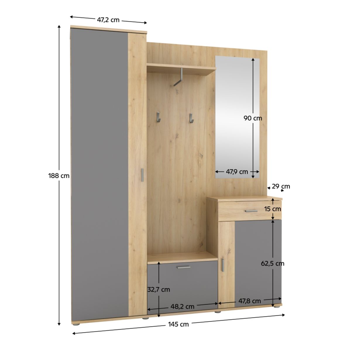 Material: PAL melaminat PAL Finisaj: stejar artisan/grafit Dimensiuni (lxhxA): 144x188x29 cm Greutate susţinută: 60 kg Trei dulapuri, unul cu sertar Un raft Cuier de haine Oglindă Dimensiuni oglindă (lxh): 47,9x90 cm Lăţime şi înălţime dulap de haine: 47,2x188 cm Lăţime şi înălţime dulap din mijloc: 48,2x32,7 cm Lăţimea şi înălţimea dulapului pe partea dreaptă: 47,8x62,5 cm Înălţime sertar: 15 cm Lăţime şi adâncime rafturi: 48,1x24 cm Grosimea materialului corpului: 16 mm Produs slovac de calitate Se livrează demontat