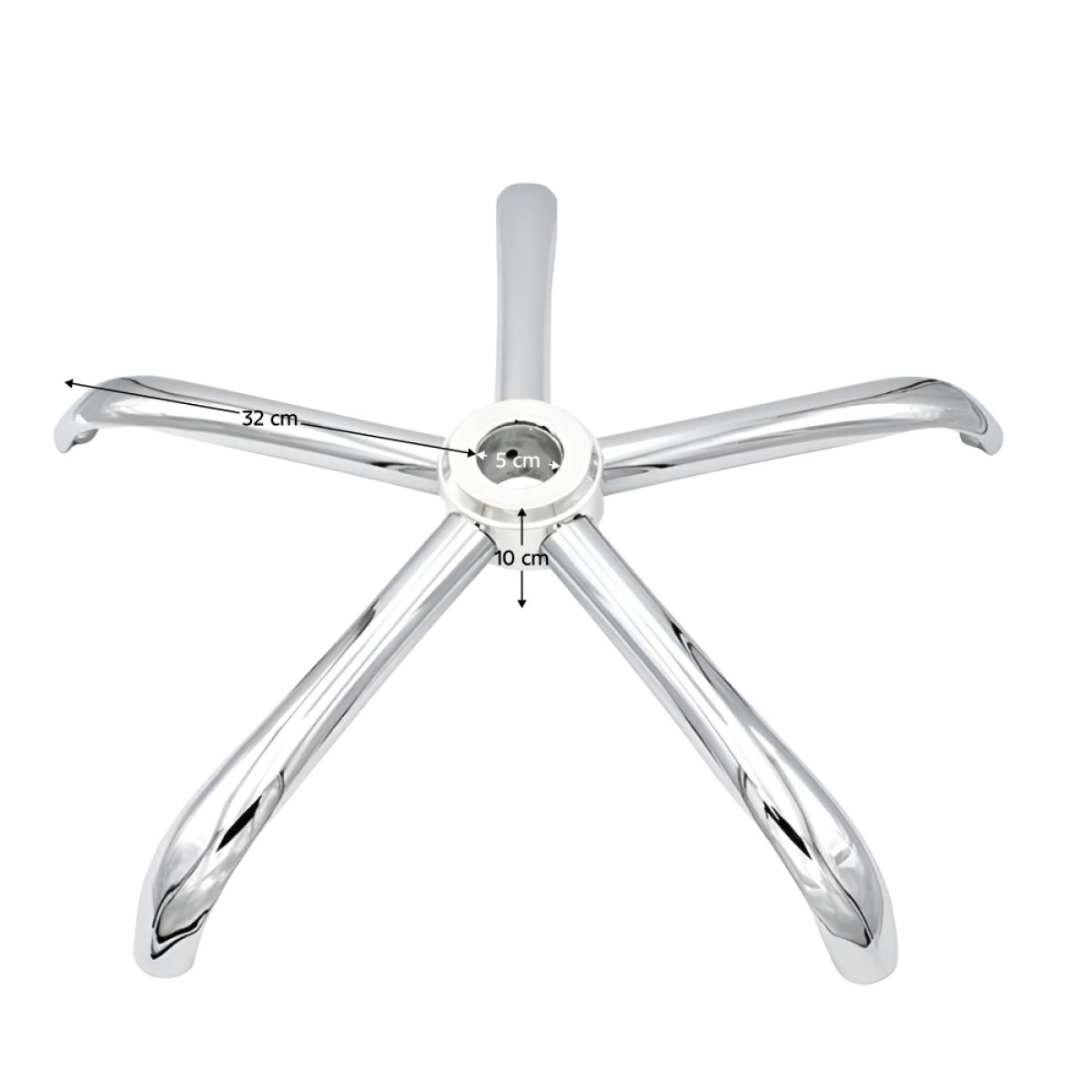 Material: metal Culoare: crom cu 5 braţe Lungime braţ: 32 cm Diametrul orificiului pentru piston: 5 cm Pentru roţi cu diametrul axului: 1,1 cm, înălţime: 10 cm Portanţă: 150 kg Pentru fotolii de birou Pentru scaune de birou