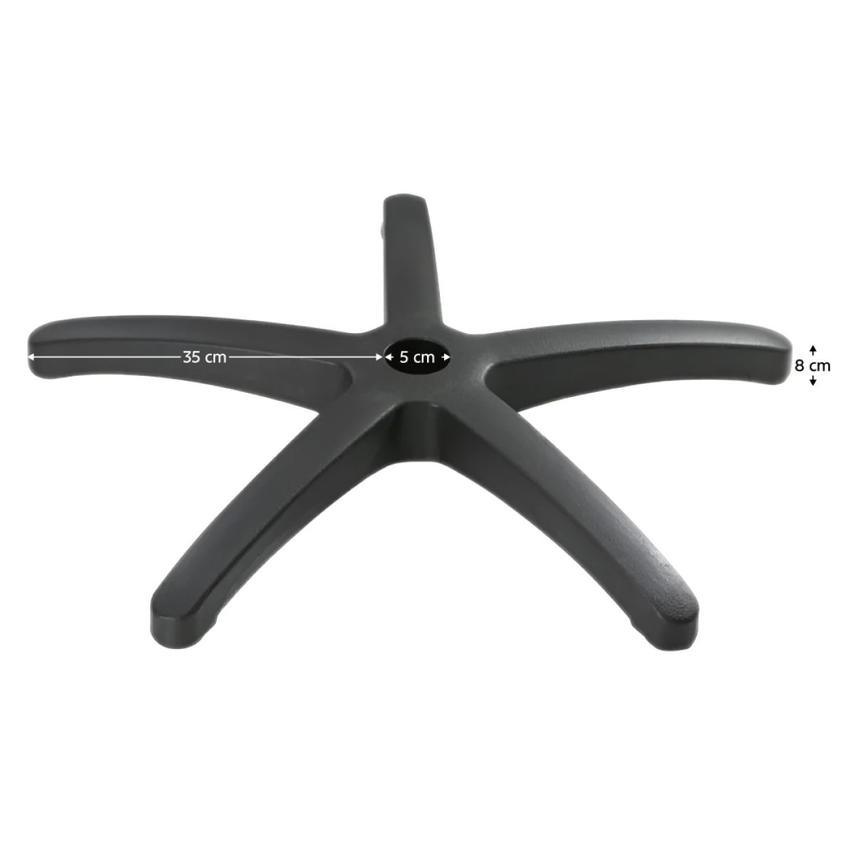 Material: plastic nailon Culoare: negru cu 5 braţe Lungime braţ: 35 cm Diametrul orificiului pentru piston: 5 cm Pentru roţi cu diametrul axului: 1,1 cm, înălţime: 8 cm Portanţa: 150 kg Pentru fotolii de birou Pentru scaune de birou