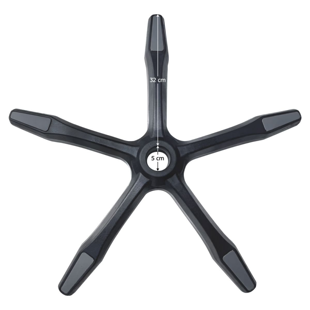 Material: plastic nailon Culoare: negru cu 5 braţe Lungime braţ: 32 cm Diametrul orificiului pentru piston: 5 cm Pentru roţi cu diametrul axului: 1,1 cm, înălţime: 9 cm Portanţa: 150 kg Pentru fotolii de birou Pentru scaune de birou