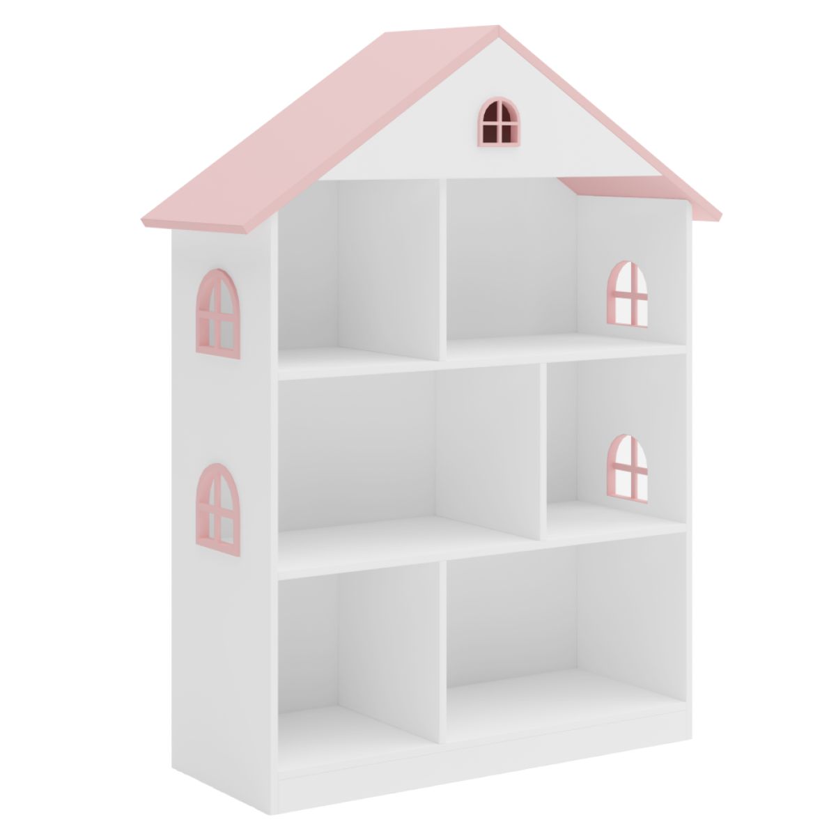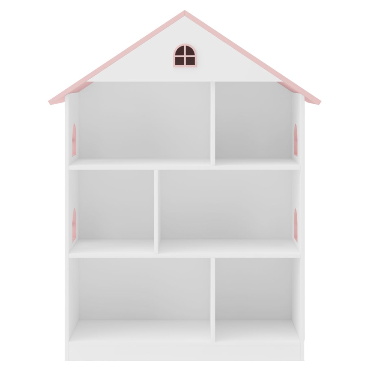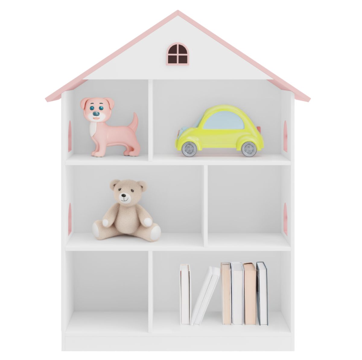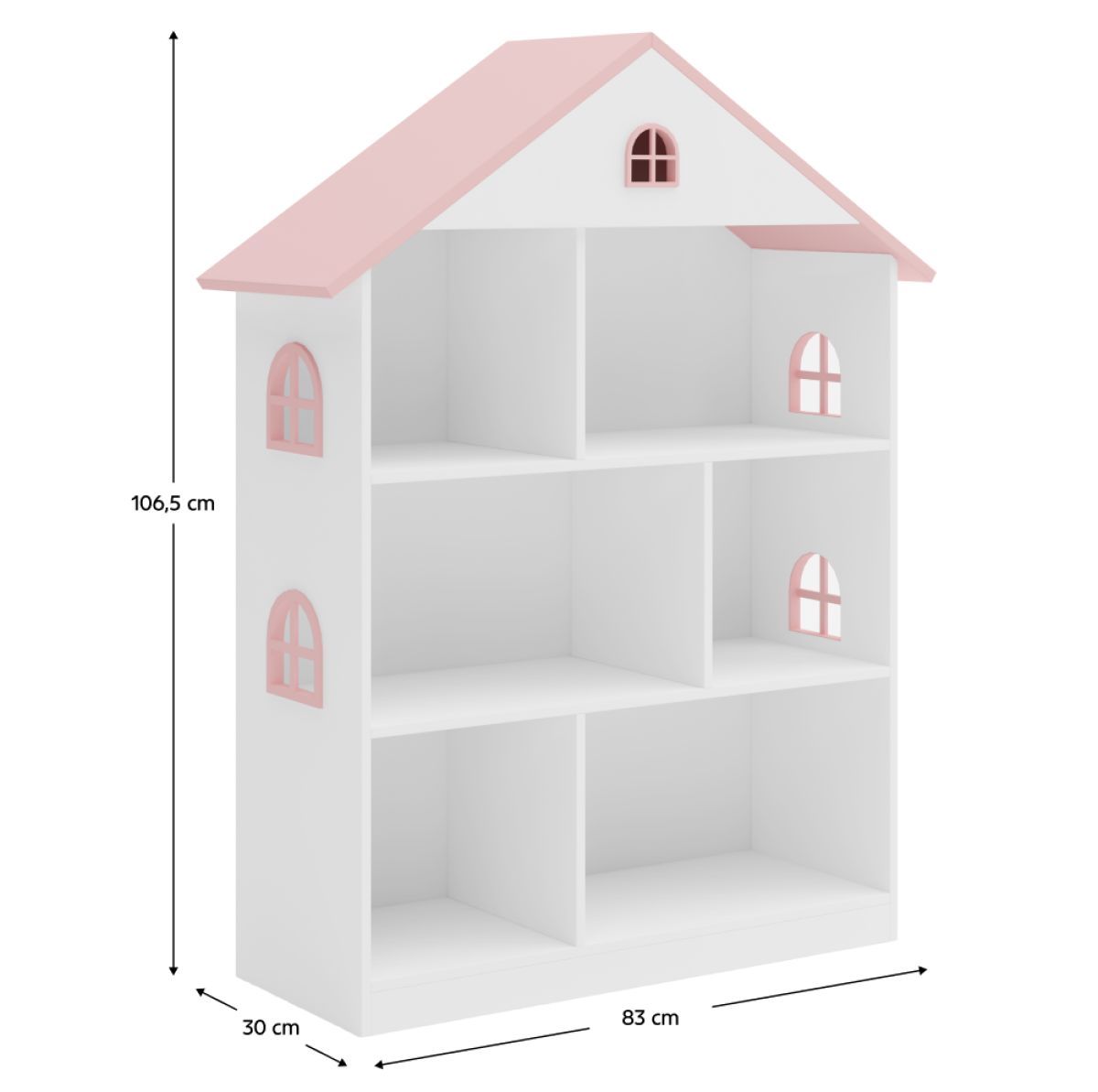 Material: MDF Culoare: alb/roz Dimensiuni (lxAxh): 83x30x106,5 cm Grosimea materialului: 1,2 cm Portanţa poliţei: 5 kg Bibliotecă pentru copii Raft În formă de căsuţă Design jucăuş Încurajează imaginaţia copiilor Spaţiu de depozitare deschis Poliţe Practic Potrivit pentru depozitarea cărţilor, jucăriilor sau a altor obiecte mici Potrivit pentru camere de copii Nu este potrivit pentru copii sub 3 ani Respectă normele de siguranţă EN 71 Recomandăm fixarea de perete Livrat dezasamblat