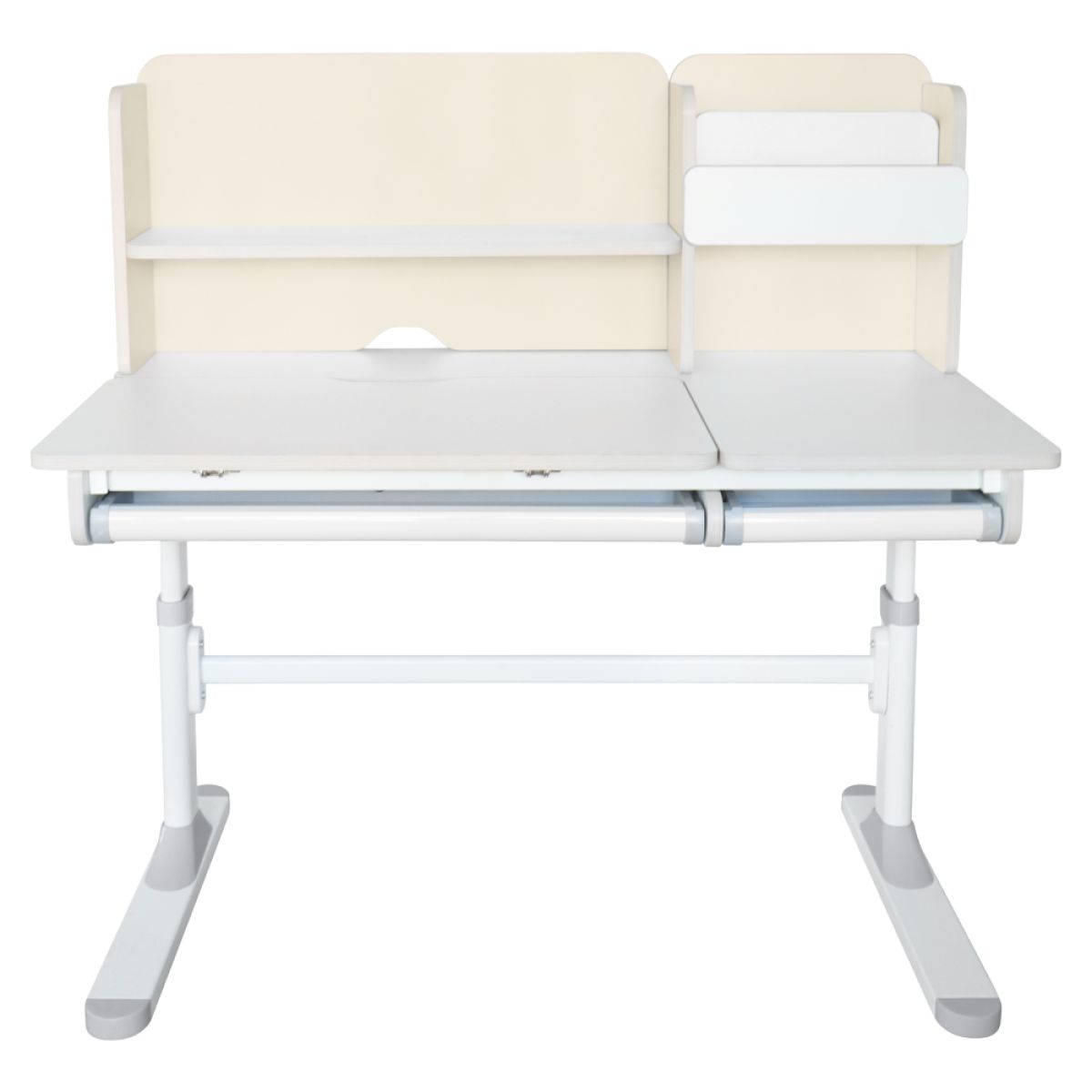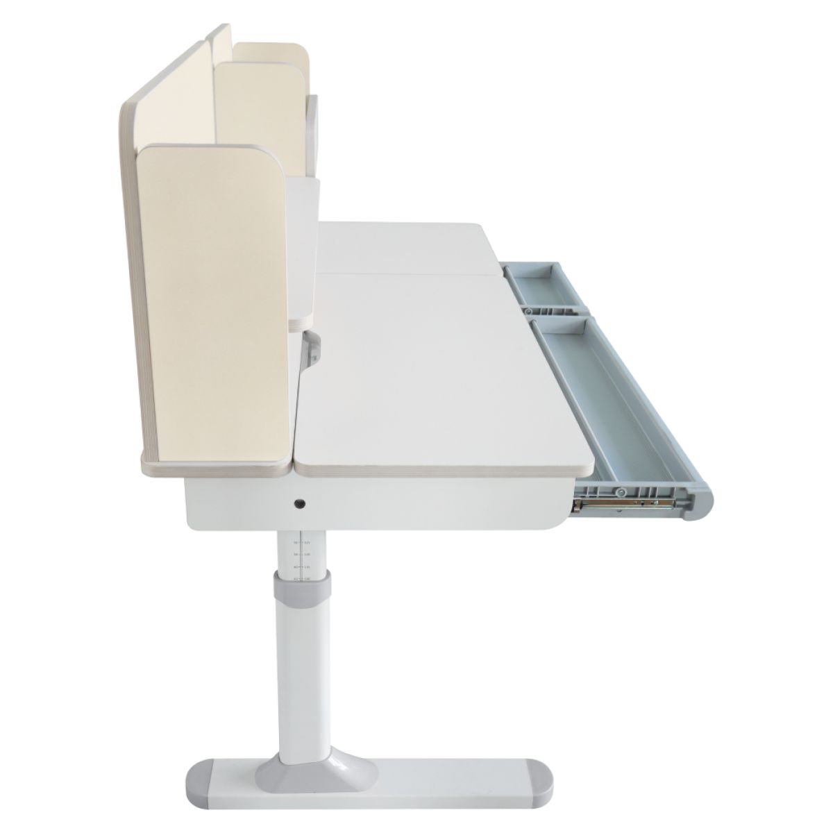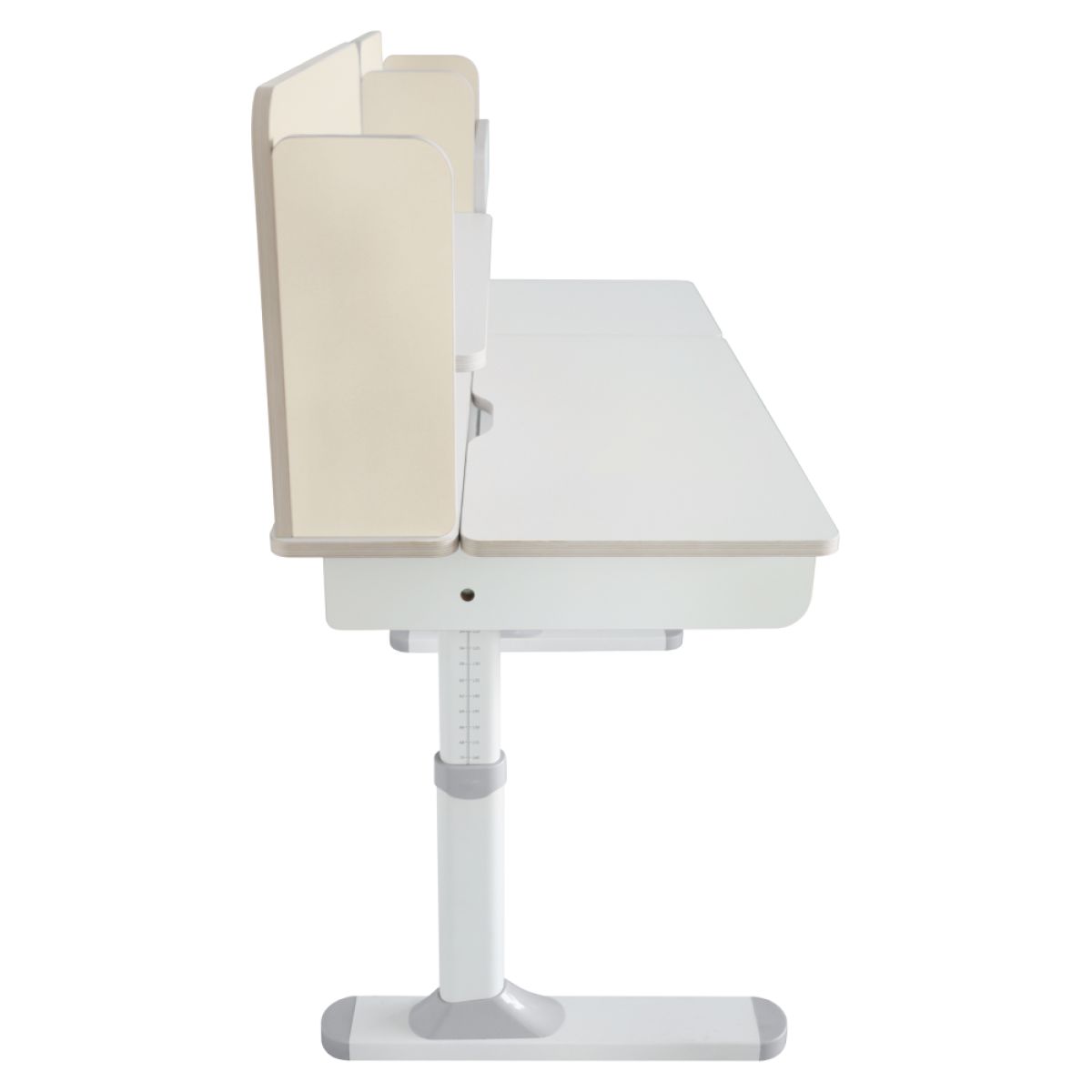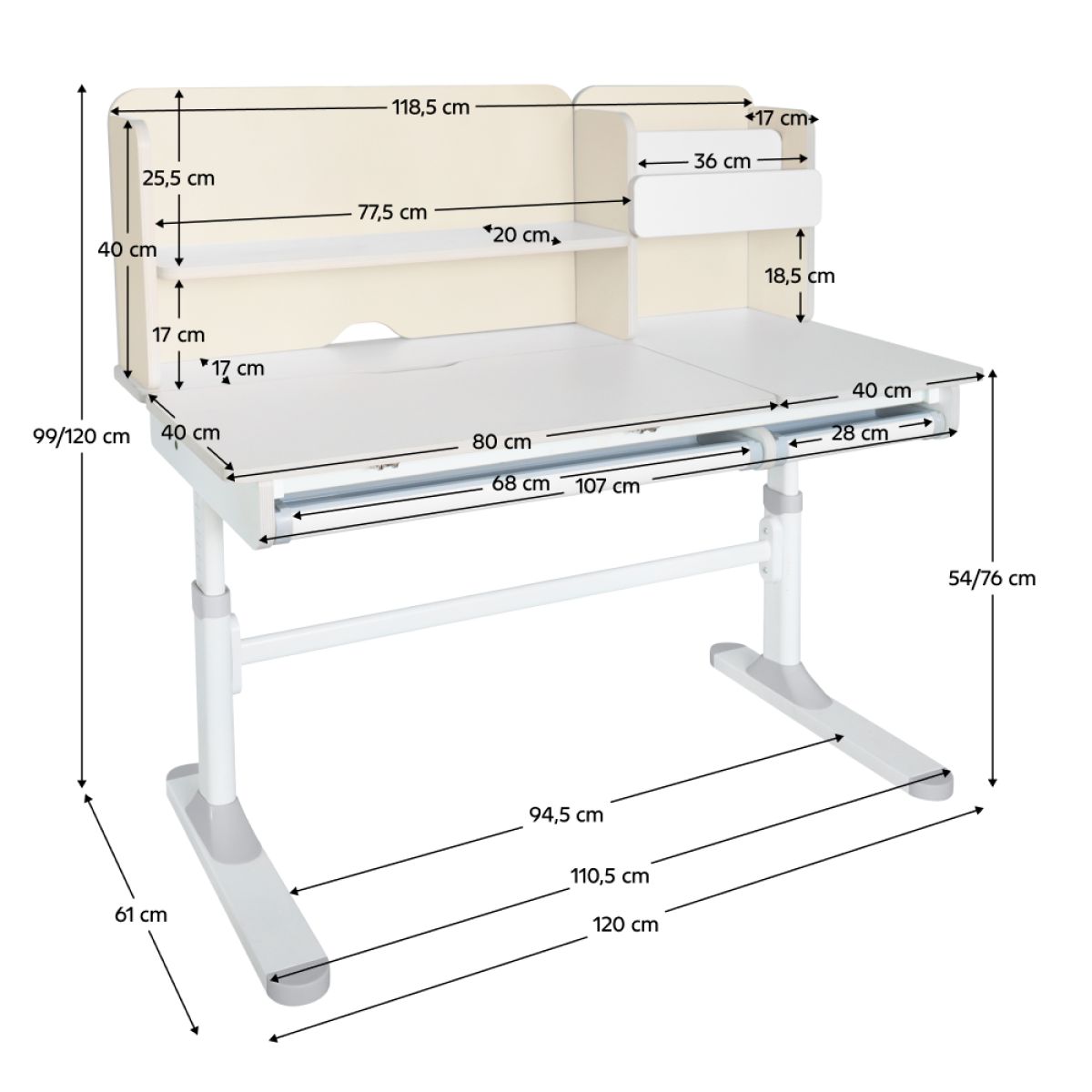 Material: MDF înfoliat/plastic/metal Grosime material MDF: 1,8 cm Culoare: natural/alb Blatul mesei are margini ABS. Dimensiunile mesei (lxAxh): 120x61x99-120 cm Lăţime bază: 110,5 cm Dimensiunile panoului din spate (lxh): 118,5x40 cm Adâncimea plăcii poziţionabile a mesei: 40 cm Înălţimea blatului de lucru: 54-76 cm Înclinare reglabilă a blatului de lucru Înclinaţie blat de lucru 0-40 Lăţimea plăcii reglabile: 80 cm Portanţă masă: 80 kg Înălţime reglabilă a mesei: Reglarea manuală a înălţimii mesei cu ajutorul manivelei Posibilitatea de a monta manivela pe partea dreaptă sau stângă Înălţimea mesei şi înclinarea suprafeţei de lucru sunt reglate folosind pistonul de gaz şi pârghia 2 sertare spaţioase cu compartiment Portanţa sertarului mai mic: 2 kg Portanţa sertarului mai mare: 10 kg Panoul din spate include poliţe, un suport pentru cărţi şi un orificiu pentru trecerea cablurilor Există un cuier pe partea laterală unde vă puteţi agăţa geanta Potrivit de la 4 la 16 ani Pentru copii şi adolescenţi la o înălţime de 110 - 175 cm Livrată dezasamblată