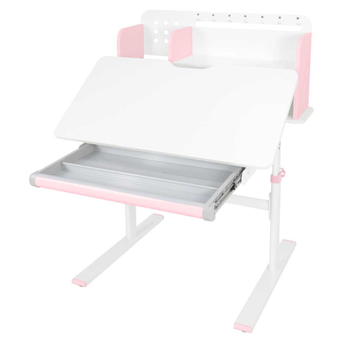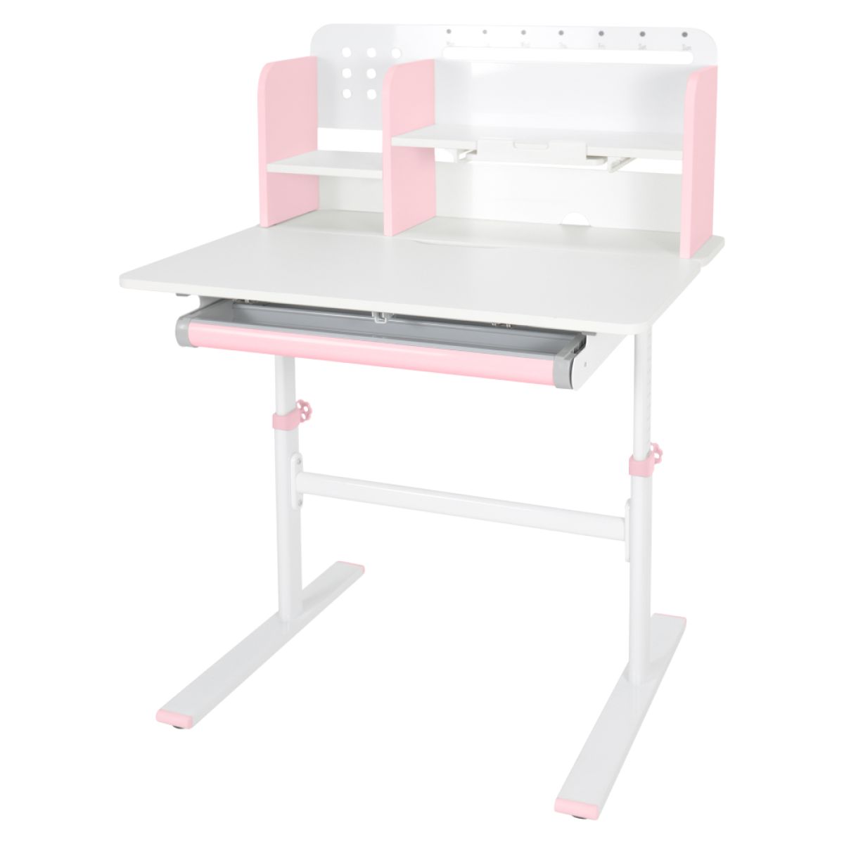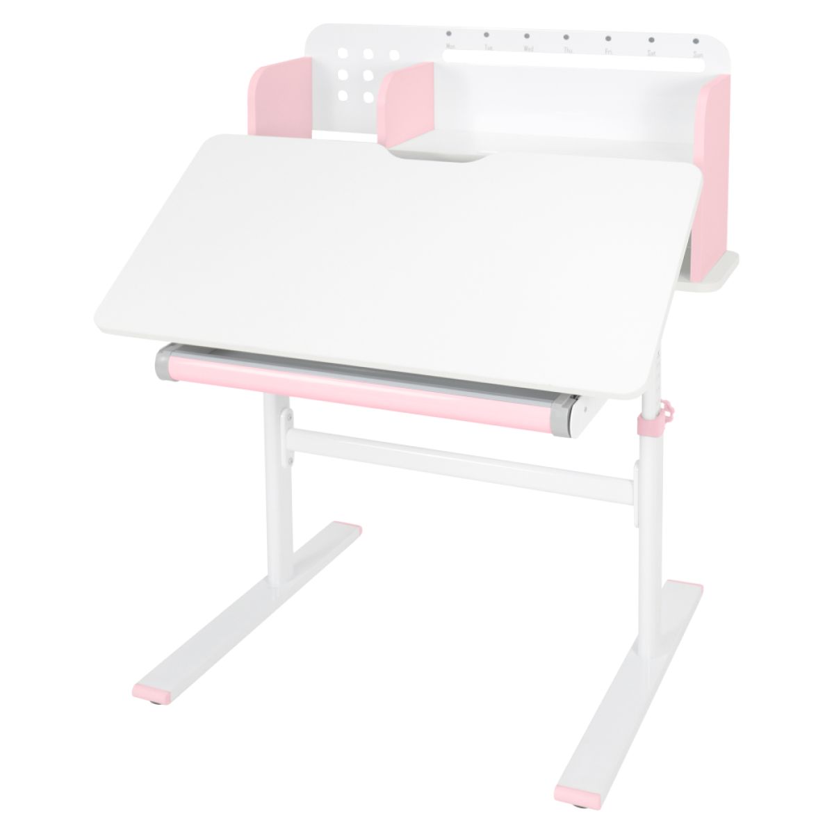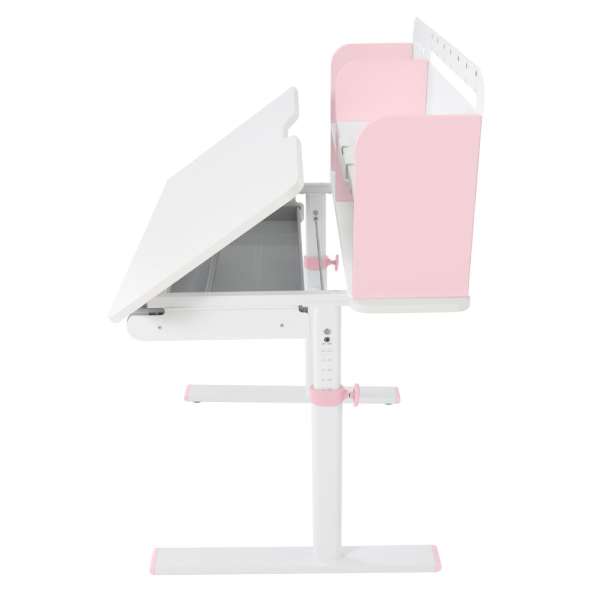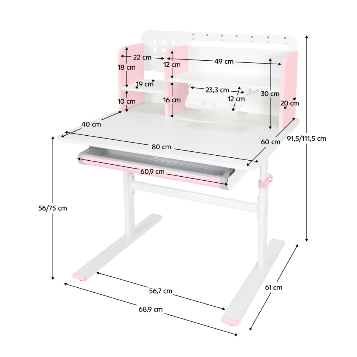 Material: MDF laminat/plastic/metal Culoare: roz/albă Blatul mesei are margini PVC. Dimensiunile mesei (lxAxh): 80x60x91,5-111,5 cm Lăţime bază: 68,9 cm Adâncime bază: 61 cm Înălţimea blatului de lucru: 56-75 cm Adâncimea piesei de poziţionare a blatului de lucru: 40 cm Lăţimea şi înălţimea panoului din spate: 75,6x36,5 cm Lăţimea raftului mai mic: 22 cm Lăţimea raftului mai mare: 49 cm Lăţimea sertarului: 60,9 cm Grosime material MDF: 1,5 cm Înclinaţie blat de lucru 0-40° Înclinare reglabilă a blatului de lucru Înălţime reglabilă a mesei: Reglare continuă a înălţimii mesei şi a unghiului suprafeţei de lucru Reglarea manuală a înălţimii mesei cu ajutorul manivelei Manivela poate fi plasată pe partea dreaptă sau stângă Reglarea unghiului suprafeţei de lucru folosind un piston cu gaz şi o pârghie Sertar spaţios cu compartiment Poliţe pentru cărţi Suport pentru cărţi şină pentru marcarea zilelor În spatele poliţei se află un orificiu pentru trecerea cablurilor Potrivit de la 3 la 12 ani Pentru copii cu o înălţime de 100 - 150 cm Livrată dezasamblată