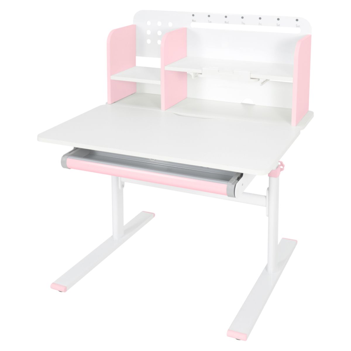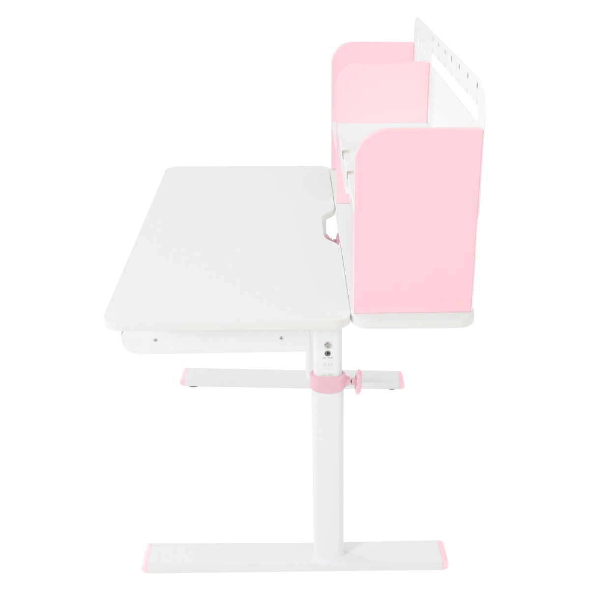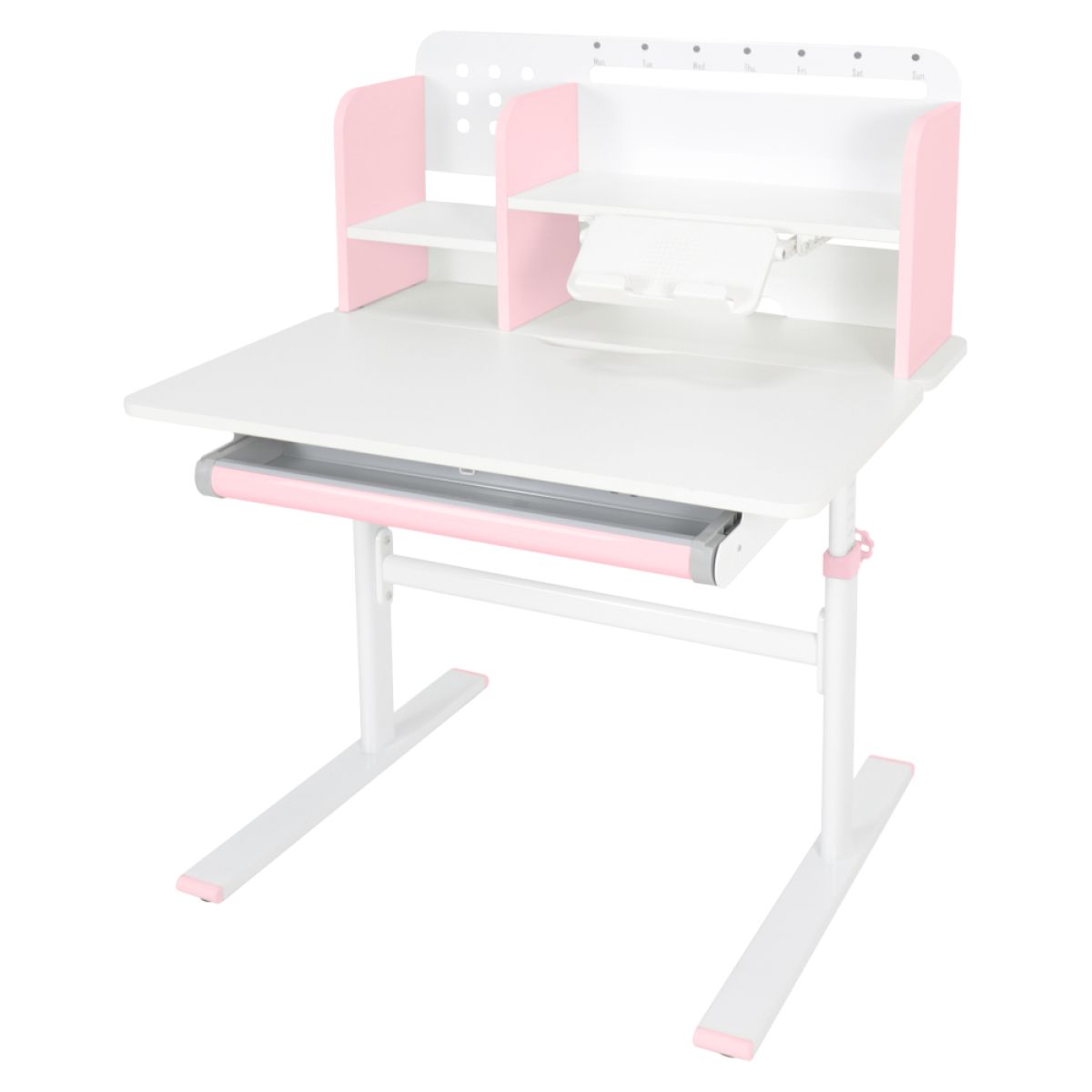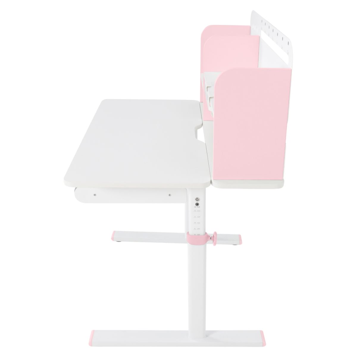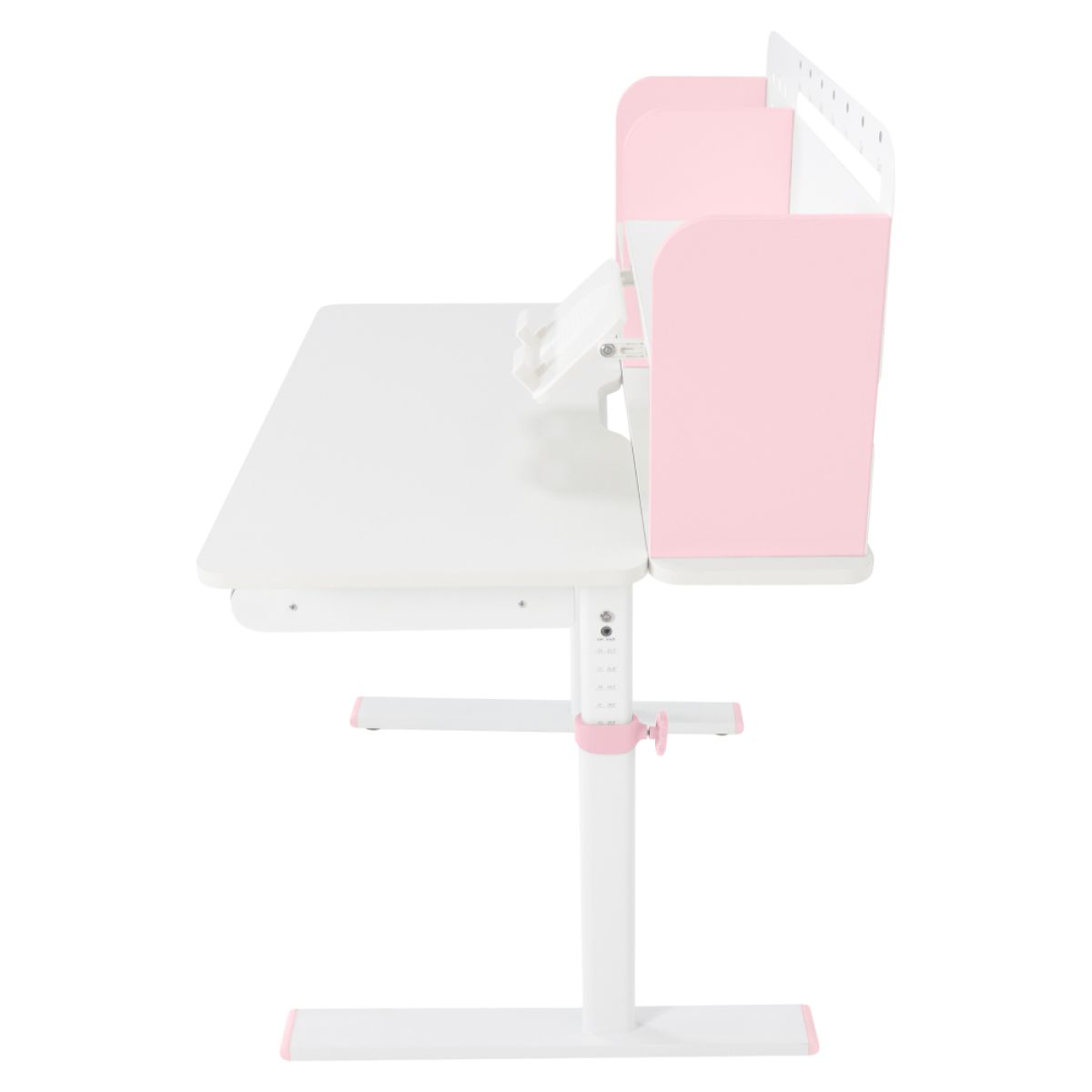 Material: MDF laminat/plastic/metal Culoare: roz/albă Blatul mesei are margini PVC. Dimensiunile mesei (lxAxh): 80x60x91,5-111,5 cm Lăţime bază: 68,9 cm Adâncime bază: 61 cm Înălţimea blatului de lucru: 56-75 cm Adâncimea piesei de poziţionare a blatului de lucru: 40 cm Lăţimea şi înălţimea panoului din spate: 75,6x36,5 cm Lăţimea raftului mai mic: 22 cm Lăţimea raftului mai mare: 49 cm Lăţimea sertarului: 60,9 cm Grosime material MDF: 1,5 cm Înclinaţie blat de lucru 0-40° Înclinare reglabilă a blatului de lucru Înălţime reglabilă a mesei: Reglare continuă a înălţimii mesei şi a unghiului suprafeţei de lucru Reglarea manuală a înălţimii mesei cu ajutorul manivelei Manivela poate fi plasată pe partea dreaptă sau stângă Reglarea unghiului suprafeţei de lucru folosind un piston cu gaz şi o pârghie Sertar spaţios cu compartiment Poliţe pentru cărţi Suport pentru cărţi şină pentru marcarea zilelor În spatele poliţei se află un orificiu pentru trecerea cablurilor Potrivit de la 3 la 12 ani Pentru copii cu o înălţime de 100 - 150 cm Livrată dezasamblată