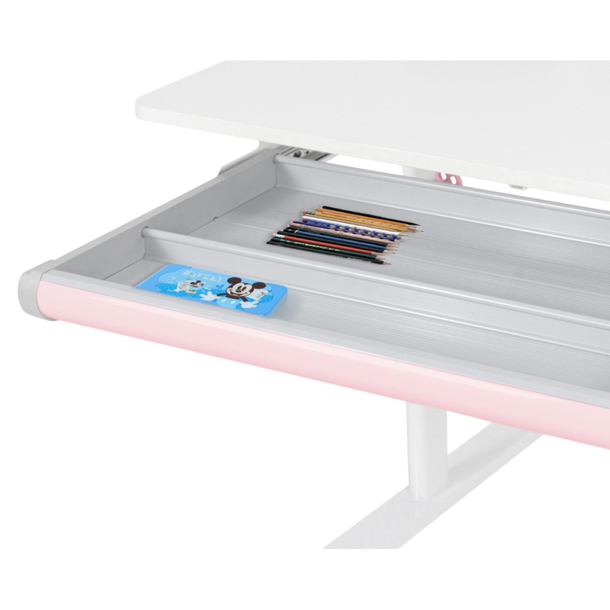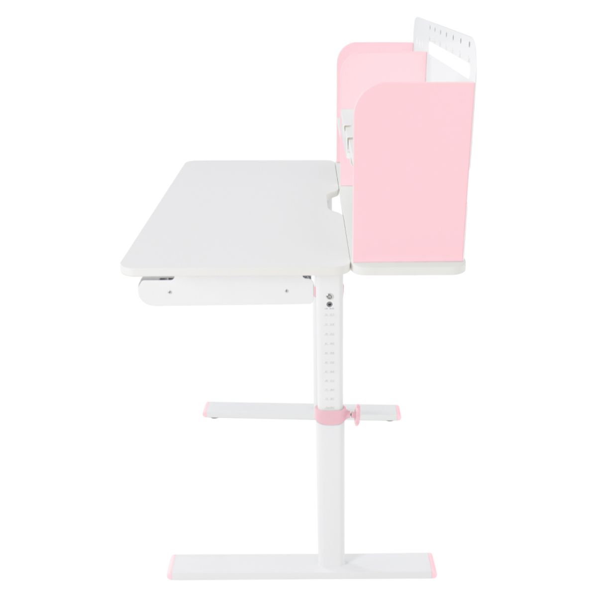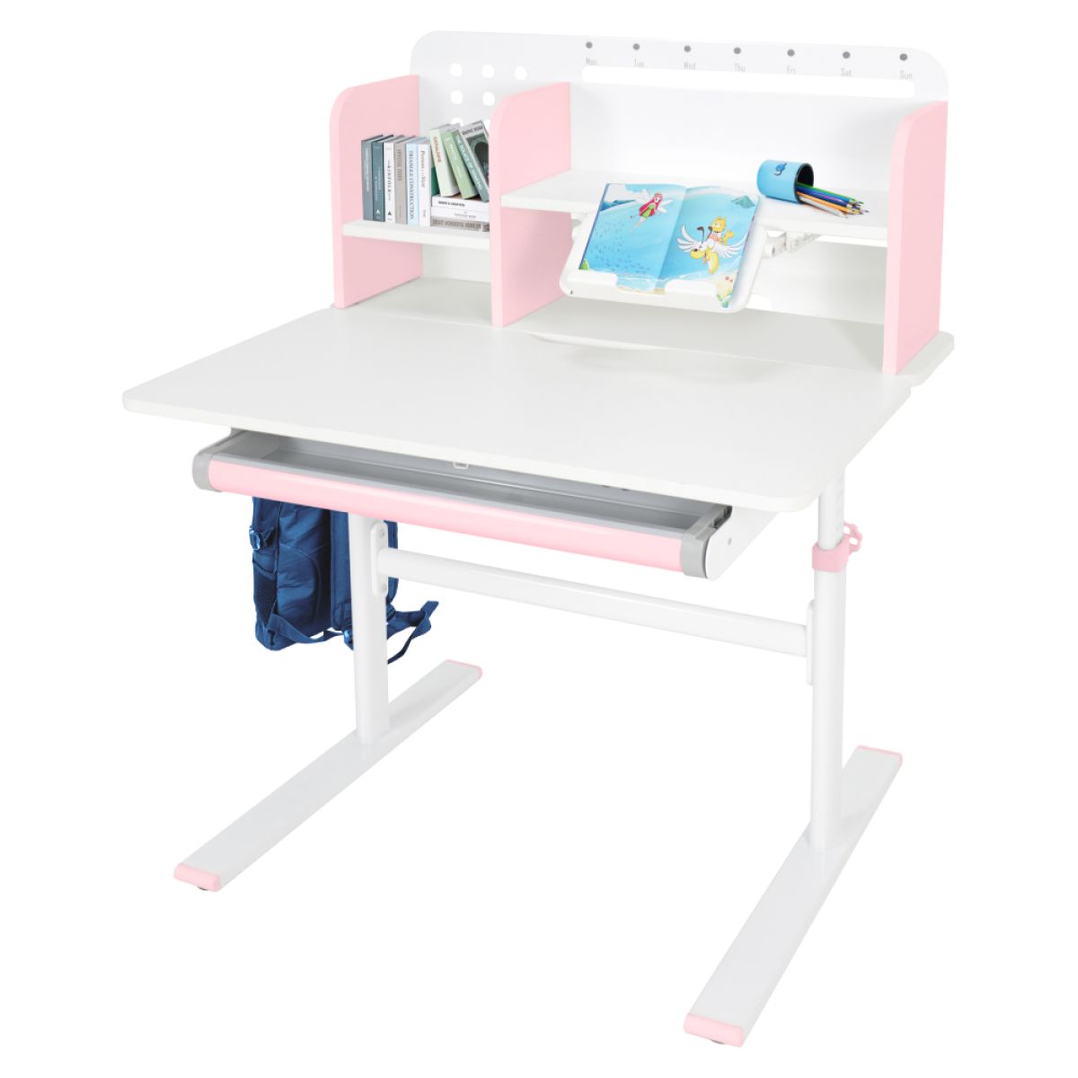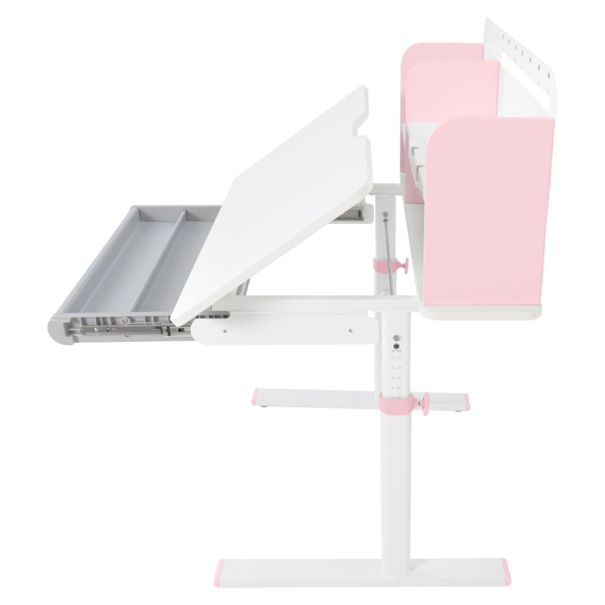 Material: MDF laminat/plastic/metal Culoare: roz/albă Blatul mesei are margini PVC. Dimensiunile mesei (lxAxh): 80x60x91,5-111,5 cm Lăţime bază: 68,9 cm Adâncime bază: 61 cm Înălţimea blatului de lucru: 56-75 cm Adâncimea piesei de poziţionare a blatului de lucru: 40 cm Lăţimea şi înălţimea panoului din spate: 75,6x36,5 cm Lăţimea raftului mai mic: 22 cm Lăţimea raftului mai mare: 49 cm Lăţimea sertarului: 60,9 cm Grosime material MDF: 1,5 cm Înclinaţie blat de lucru 0-40° Înclinare reglabilă a blatului de lucru Înălţime reglabilă a mesei: Reglare continuă a înălţimii mesei şi a unghiului suprafeţei de lucru Reglarea manuală a înălţimii mesei cu ajutorul manivelei Manivela poate fi plasată pe partea dreaptă sau stângă Reglarea unghiului suprafeţei de lucru folosind un piston cu gaz şi o pârghie Sertar spaţios cu compartiment Poliţe pentru cărţi Suport pentru cărţi şină pentru marcarea zilelor În spatele poliţei se află un orificiu pentru trecerea cablurilor Potrivit de la 3 la 12 ani Pentru copii cu o înălţime de 100 - 150 cm Livrată dezasamblată