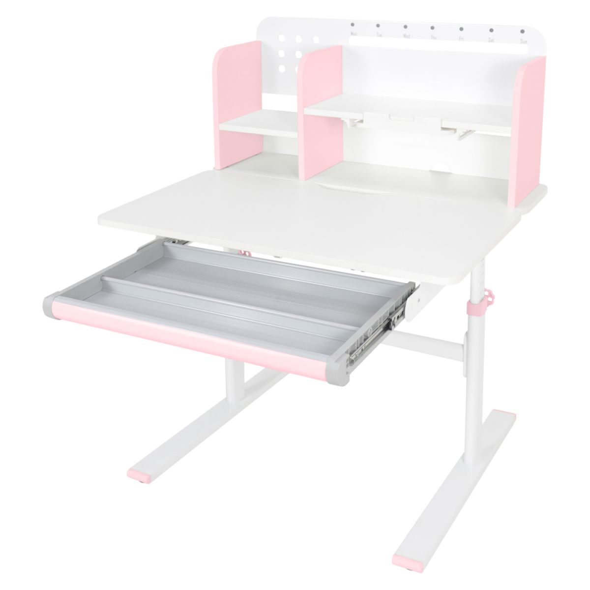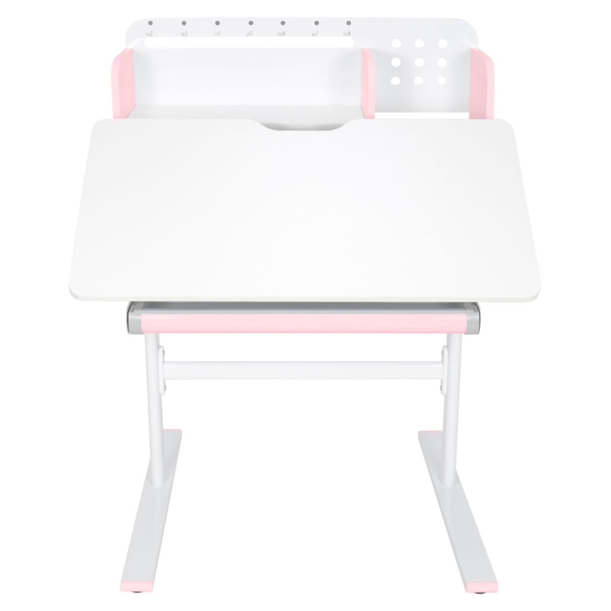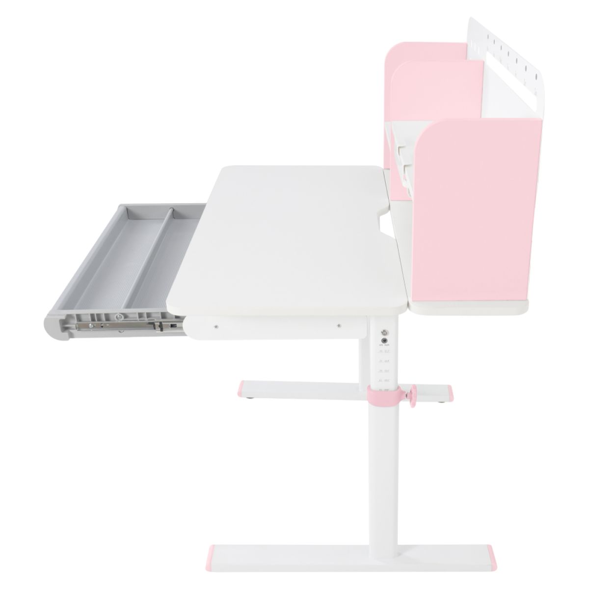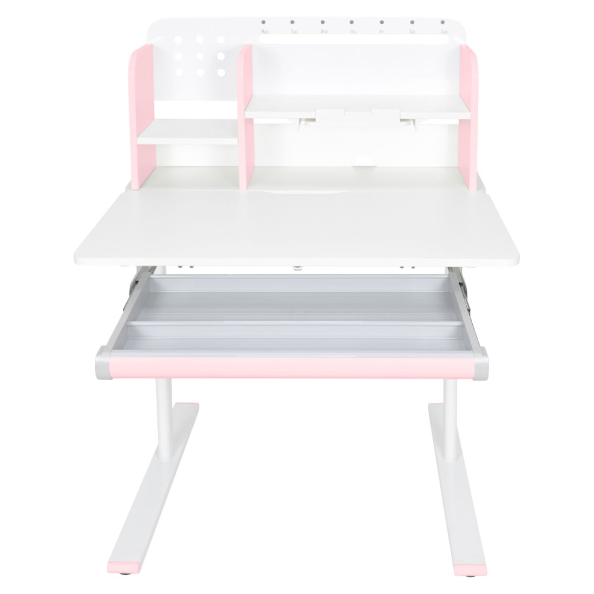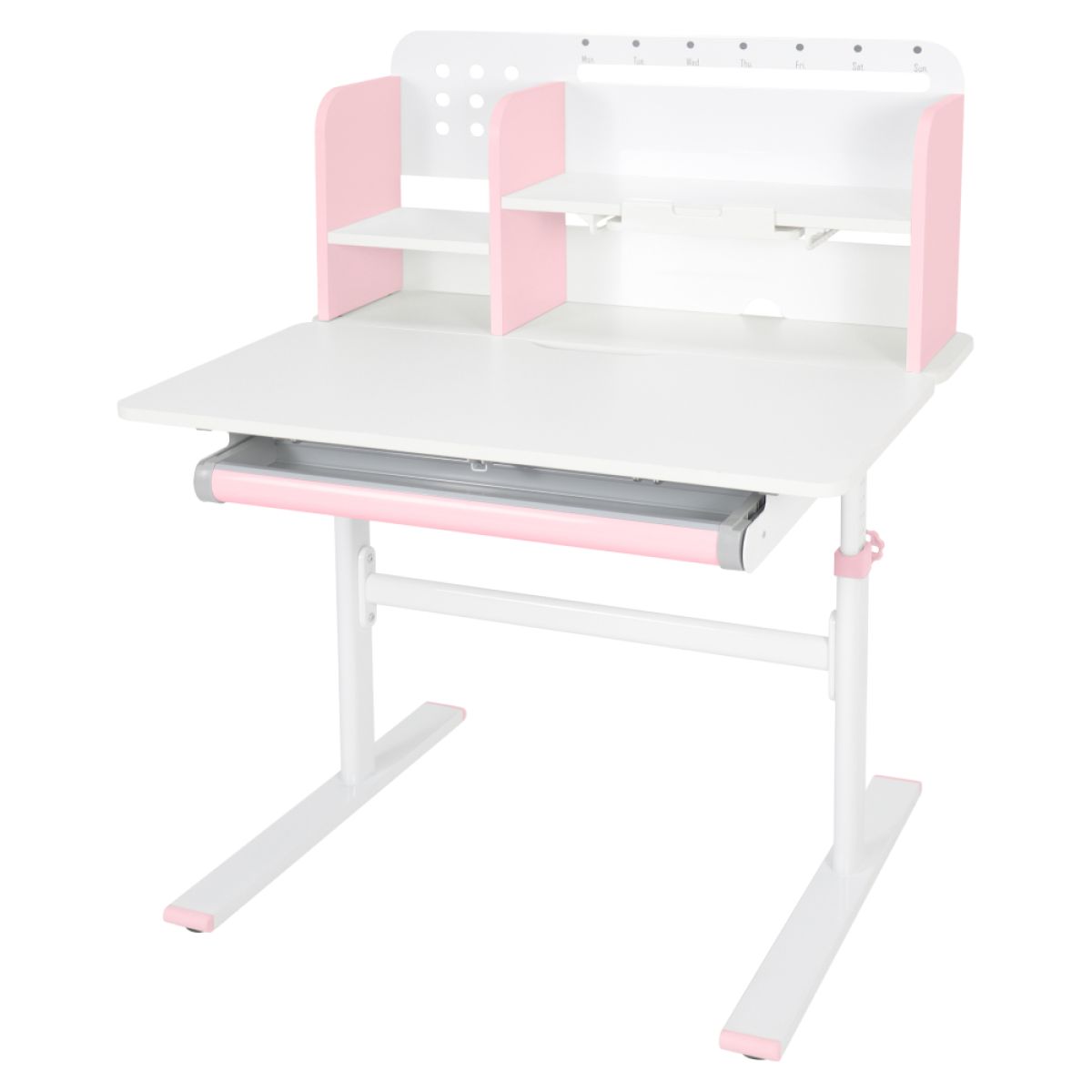 Material: MDF laminat/plastic/metal Culoare: roz/albă Blatul mesei are margini PVC. Dimensiunile mesei (lxAxh): 80x60x91,5-111,5 cm Lăţime bază: 68,9 cm Adâncime bază: 61 cm Înălţimea blatului de lucru: 56-75 cm Adâncimea piesei de poziţionare a blatului de lucru: 40 cm Lăţimea şi înălţimea panoului din spate: 75,6x36,5 cm Lăţimea raftului mai mic: 22 cm Lăţimea raftului mai mare: 49 cm Lăţimea sertarului: 60,9 cm Grosime material MDF: 1,5 cm Înclinaţie blat de lucru 0-40° Înclinare reglabilă a blatului de lucru Înălţime reglabilă a mesei: Reglare continuă a înălţimii mesei şi a unghiului suprafeţei de lucru Reglarea manuală a înălţimii mesei cu ajutorul manivelei Manivela poate fi plasată pe partea dreaptă sau stângă Reglarea unghiului suprafeţei de lucru folosind un piston cu gaz şi o pârghie Sertar spaţios cu compartiment Poliţe pentru cărţi Suport pentru cărţi şină pentru marcarea zilelor În spatele poliţei se află un orificiu pentru trecerea cablurilor Potrivit de la 3 la 12 ani Pentru copii cu o înălţime de 100 - 150 cm Livrată dezasamblată
