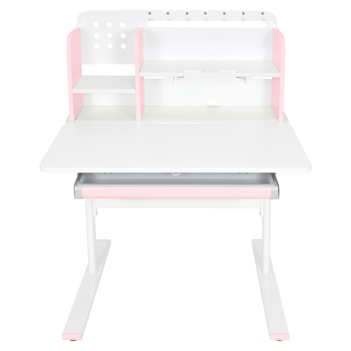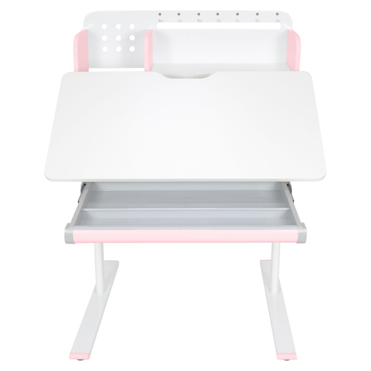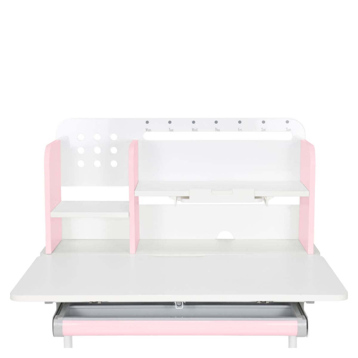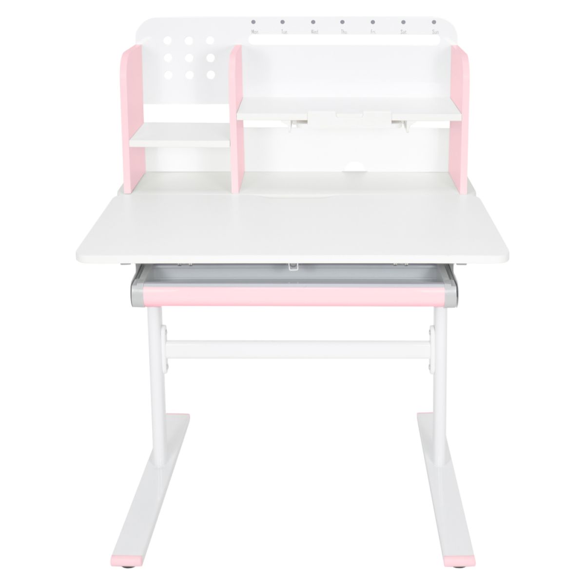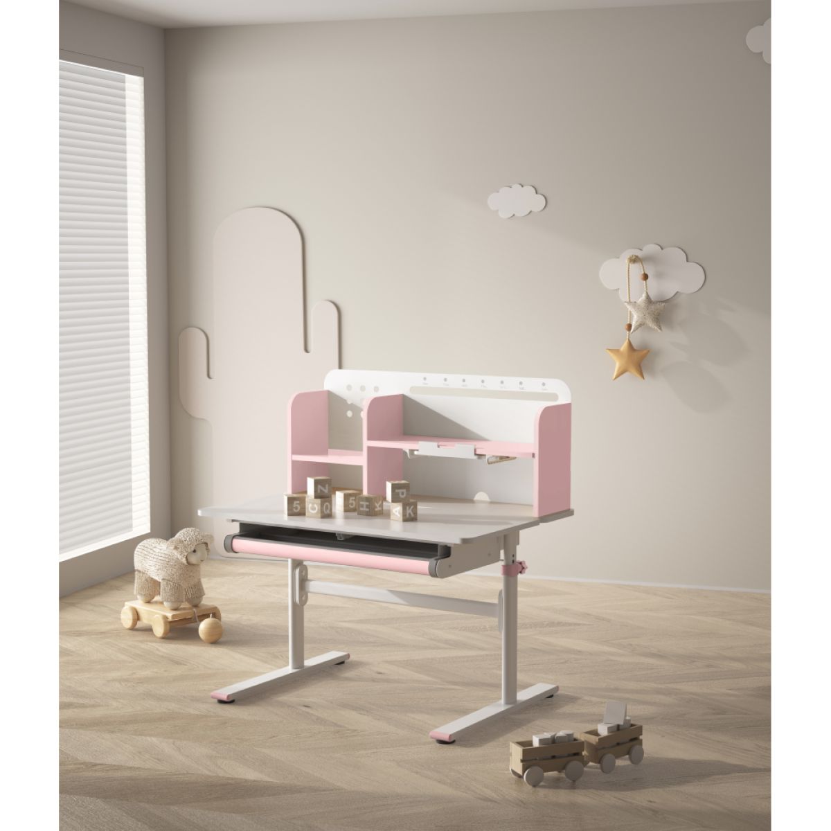 Material: MDF laminat/plastic/metal Culoare: roz/albă Blatul mesei are margini PVC. Dimensiunile mesei (lxAxh): 80x60x91,5-111,5 cm Lăţime bază: 68,9 cm Adâncime bază: 61 cm Înălţimea blatului de lucru: 56-75 cm Adâncimea piesei de poziţionare a blatului de lucru: 40 cm Lăţimea şi înălţimea panoului din spate: 75,6x36,5 cm Lăţimea raftului mai mic: 22 cm Lăţimea raftului mai mare: 49 cm Lăţimea sertarului: 60,9 cm Grosime material MDF: 1,5 cm Înclinaţie blat de lucru 0-40° Înclinare reglabilă a blatului de lucru Înălţime reglabilă a mesei: Reglare continuă a înălţimii mesei şi a unghiului suprafeţei de lucru Reglarea manuală a înălţimii mesei cu ajutorul manivelei Manivela poate fi plasată pe partea dreaptă sau stângă Reglarea unghiului suprafeţei de lucru folosind un piston cu gaz şi o pârghie Sertar spaţios cu compartiment Poliţe pentru cărţi Suport pentru cărţi şină pentru marcarea zilelor În spatele poliţei se află un orificiu pentru trecerea cablurilor Potrivit de la 3 la 12 ani Pentru copii cu o înălţime de 100 - 150 cm Livrată dezasamblată