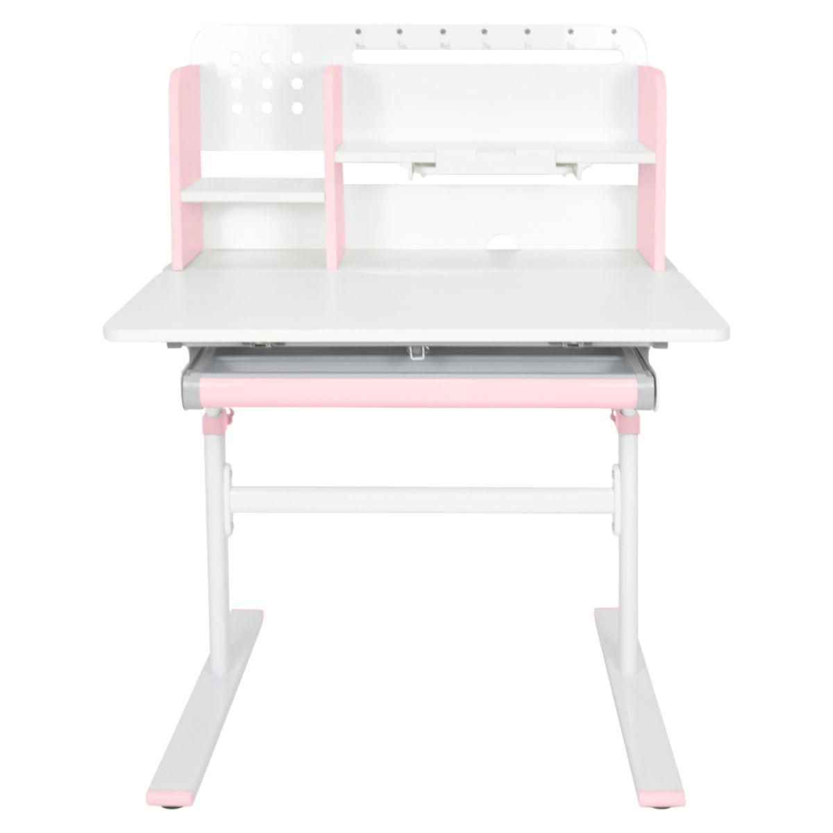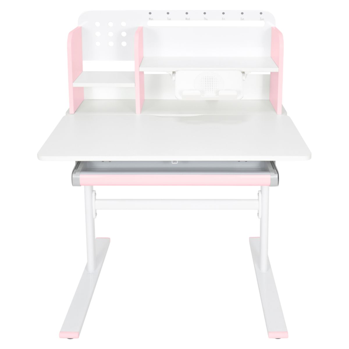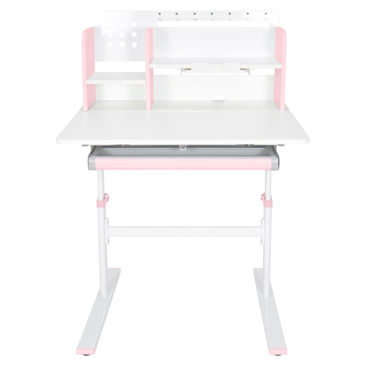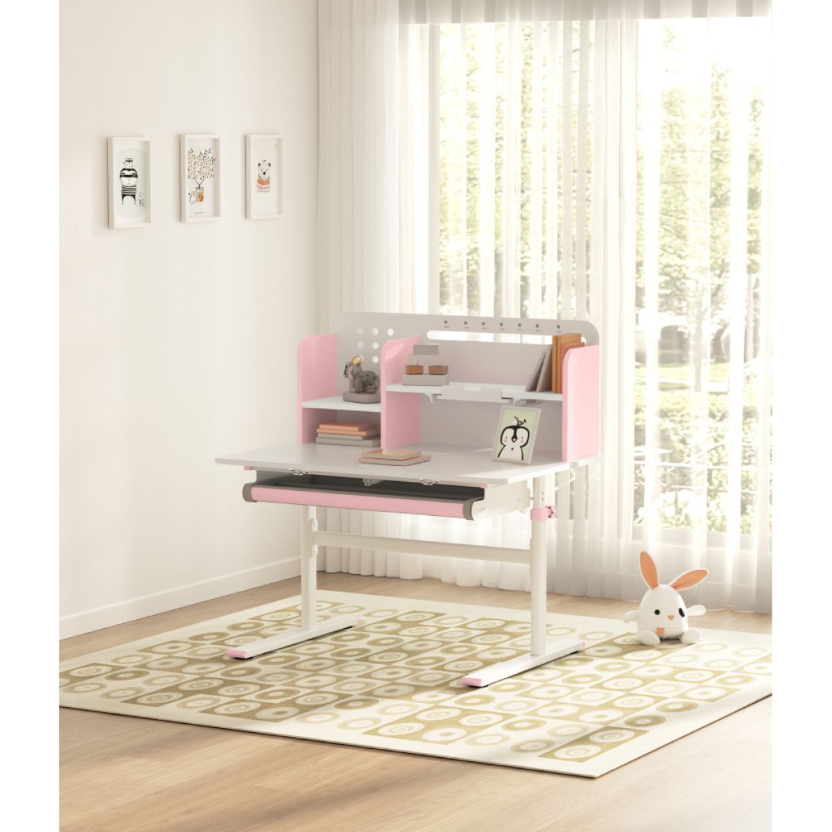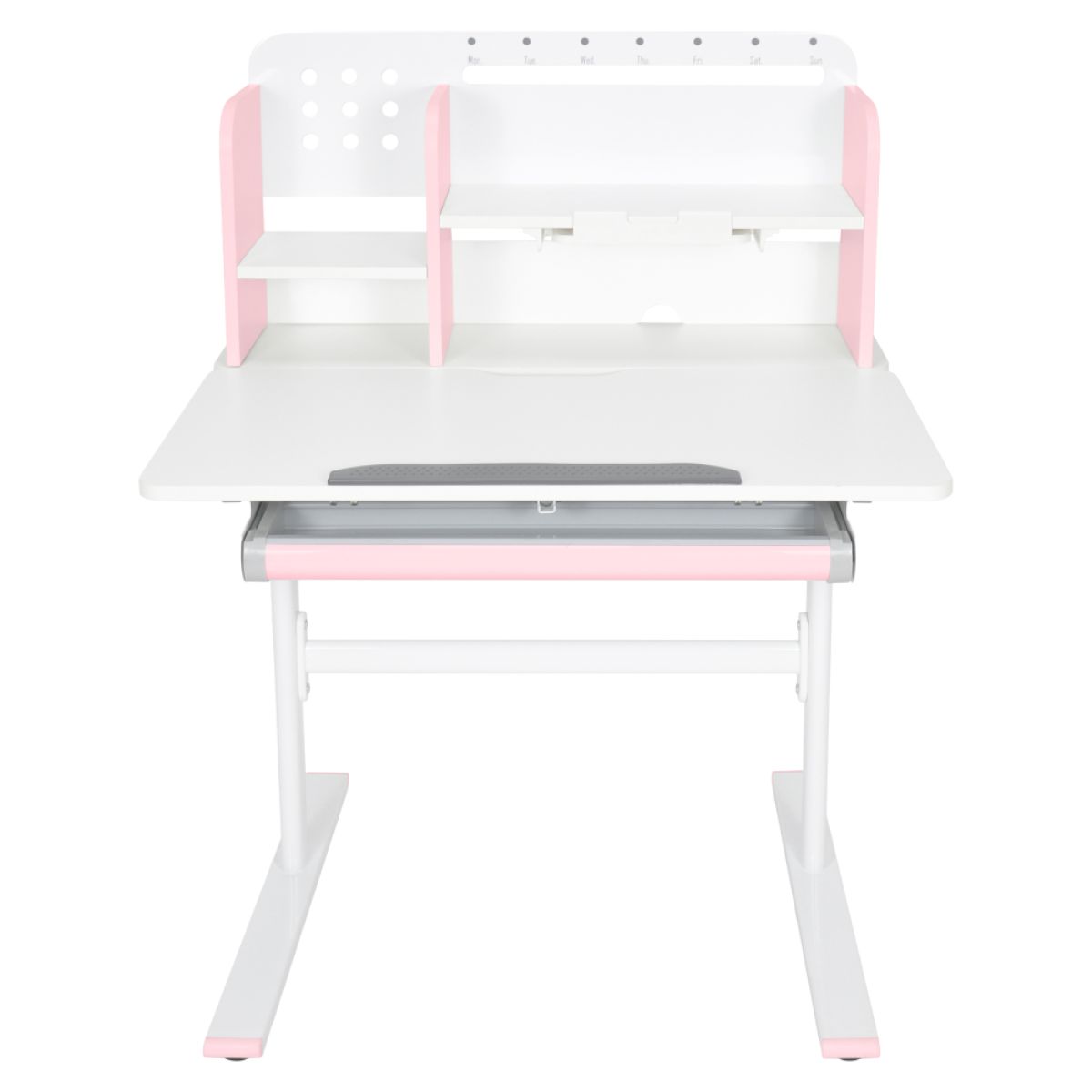 Material: MDF laminat/plastic/metal Culoare: roz/albă Blatul mesei are margini PVC. Dimensiunile mesei (lxAxh): 80x60x91,5-111,5 cm Lăţime bază: 68,9 cm Adâncime bază: 61 cm Înălţimea blatului de lucru: 56-75 cm Adâncimea piesei de poziţionare a blatului de lucru: 40 cm Lăţimea şi înălţimea panoului din spate: 75,6x36,5 cm Lăţimea raftului mai mic: 22 cm Lăţimea raftului mai mare: 49 cm Lăţimea sertarului: 60,9 cm Grosime material MDF: 1,5 cm Înclinaţie blat de lucru 0-40° Înclinare reglabilă a blatului de lucru Înălţime reglabilă a mesei: Reglare continuă a înălţimii mesei şi a unghiului suprafeţei de lucru Reglarea manuală a înălţimii mesei cu ajutorul manivelei Manivela poate fi plasată pe partea dreaptă sau stângă Reglarea unghiului suprafeţei de lucru folosind un piston cu gaz şi o pârghie Sertar spaţios cu compartiment Poliţe pentru cărţi Suport pentru cărţi şină pentru marcarea zilelor În spatele poliţei se află un orificiu pentru trecerea cablurilor Potrivit de la 3 la 12 ani Pentru copii cu o înălţime de 100 - 150 cm Livrată dezasamblată