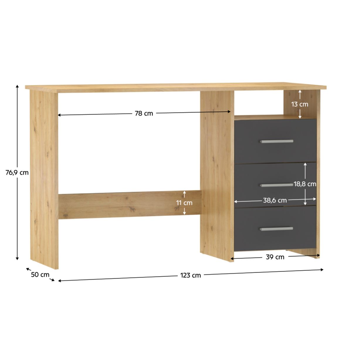 Material: DTD laminat Culoare: stejar artisan/grafit Masă (lxAxh): 123x50x76,9cm Sertar (lxA): 38,6x18,8 cm Spaţiu deschis (lxA): 38,6x13 cm Grosime material:1,6 cm 3 sertare Spaţiu de depozitare deschis Poliţă Portanţa: 35 kg Portanţă poliţă: 5 kg Portanţa sertarului: 5 kg Universală Uşile pot fi montate fie pe partea dreaptă, fie pe partea stângă. Cu mânere Materialul mânerelor: plastic Culoarea mânerelor: argintie Glisoare Produs slovac de calitate Livrat dezasamblat