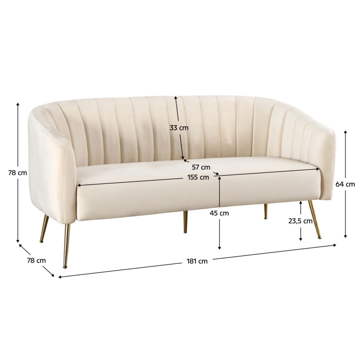 Material: ţesătură velvet/metal Rezistenţa ţesăturii la frecare conform testului Martindale: 95 000 de cicluri de frecare Culoare: bej/gold crom-auriu Dimensiuni (lxAxh): 181x78x78 cm Înălţimea părţii de şezut: 45 cm Adâncimea părţii de şezut: 57 cm Lăţimea părţii de şezut: 155 cm Înălţime spătar: 33 cm Înălţimea cotierei de la sol: 64 cm Înălţimea compartimentului inferior de la podea: 23,5 cm Portanţă pe persoană: 90 kg Umplutură: spumă Complet tapiţat De lux Decorativ matlasate Pe picioare Livrat dezasamblat
