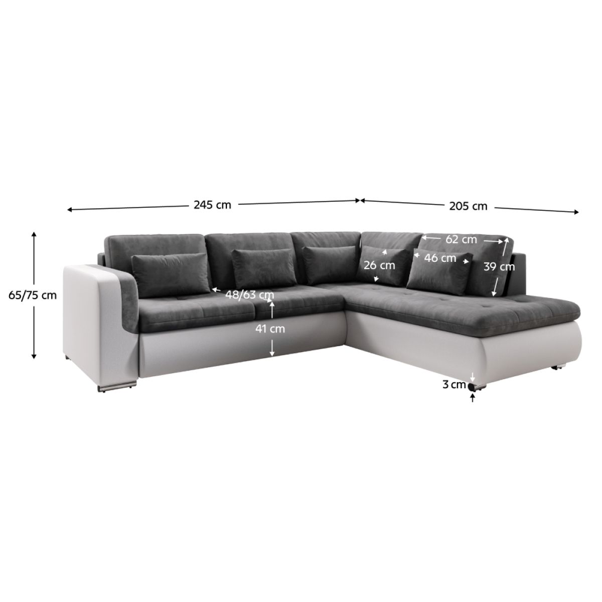 Material: piele ecologică/stofă Seal 96 Rezistenţa la abraziune a pielii ecologice conform testului Martindale: 100 000 de frecări Rezistenţa la uzură a ţesăturii conform testului Martindale: 80 000 de frecări Culoare: alb/gri Dimensiuni (LxAxA): 245x205x65/75 cm Înălţimea de şezut: 41 cm Adâncimea de şezut: 48/63 cm Înălţimea raftului inferior de la podea: 3 cm Extensibilă Suprafaţa de dormit (LxA): 135x205 cm Înălţimea spătarului: Lăţimea otomanului: Cotieră (HxH): Capacitate de încărcare pe persoană: 90 kg Colţar Umplutura: arcuri falista / spumă poliuretanică Picioare din plastic Culoarea picioarelor: argintiu Complet tapiţată Material rezistent la apă Varianta dreapta Livrat cu perne 5 perne mari 5 perne decorative Dimensiunea pernei mari (LxA): 62x39 cm Dimensiunea pernei mici (LxA): 46x26 cm Se livrează în stare dezasamblată Vă oferim posibilitatea de a comanda canapeaua în 4 culori de piele ecologică şi 7 culori de stofă Seal incluse în preţ: 4 659,-. Pentru comenzi individuale, este necesar un depozit de 10% din suma dată. După plata avansului, cererea dumneavoastră va fi introdusă în producţie. Timpul de livrare 6-8 săptămâni.