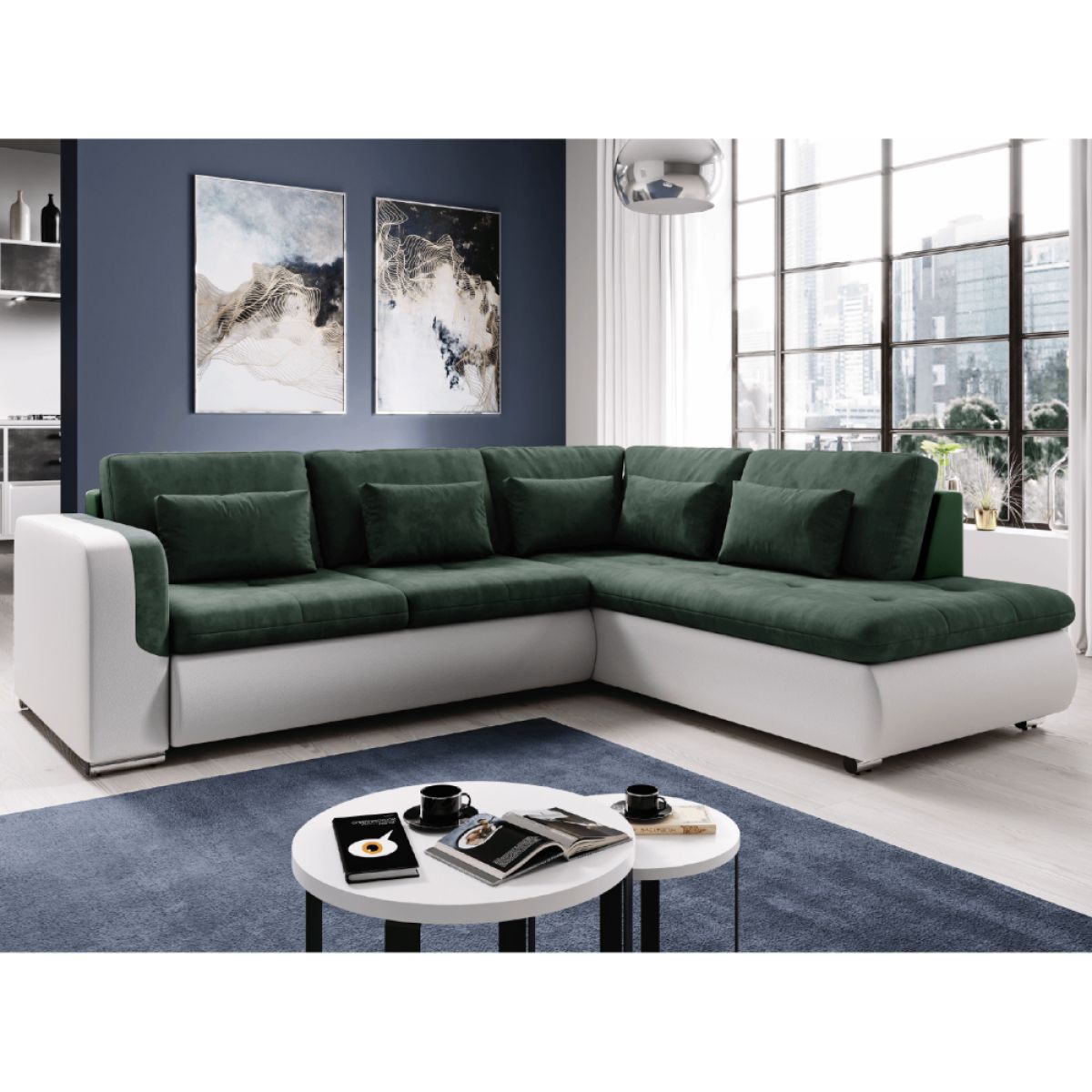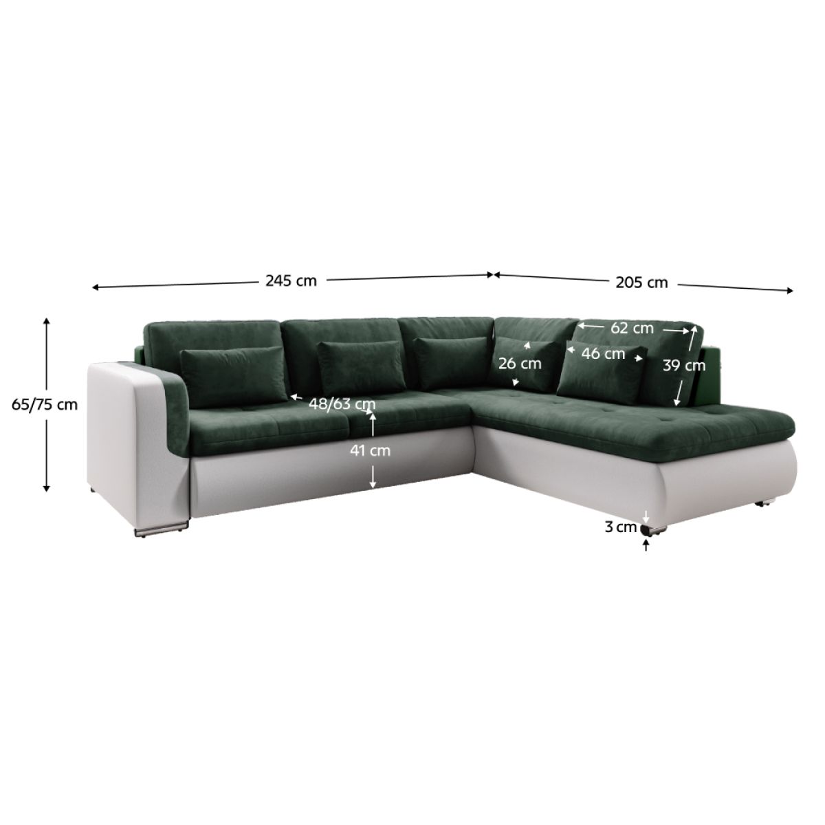 Material: piele ecologică/stofă Seal 38 Rezistenţa la abraziune a pielii ecologice conform testului Martindale: 100 000 de frecări Rezistenţa la uzură a ţesăturii conform testului Martindale: 80 000 de frecări Culoare: alb/verde Dimensiuni (LxAxA): 245x205x65/75 cm Înălţimea de şezut: 41 cm Adâncimea de şezut: 48/63 cm Înălţimea raftului inferior de la podea: 3 cm Extensibilă Suprafaţa de dormit (LxA): 135x205 cm Înălţimea spătarului: Lăţimea otomanului: Cotieră (HxH): Capacitate de încărcare pe persoană: 90 kg Colţar Umplutura: arcuri falista / spumă poliuretanică Picioare din plastic Culoarea picioarelor: argintiu Complet tapiţată Material rezistent la apă Varianta dreapta Livrat cu perne 5 perne mari 5 perne decorative Dimensiunea pernei mari (LxA): 62x39 cm Dimensiunea pernei mici (LxA): 46x26 cm Se livrează în stare dezasamblată Vă oferim posibilitatea de a comanda canapeaua în 4 culori de piele ecologică şi 7 culori de stofă Seal incluse în preţ: 4 659,-. Pentru comenzi individuale, este necesar un depozit de 10% din suma dată. După plata avansului, cererea dumneavoastră va fi introdusă în producţie. Timpul de livrare 6-8 săptămâni.