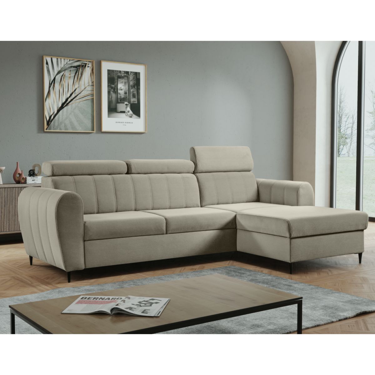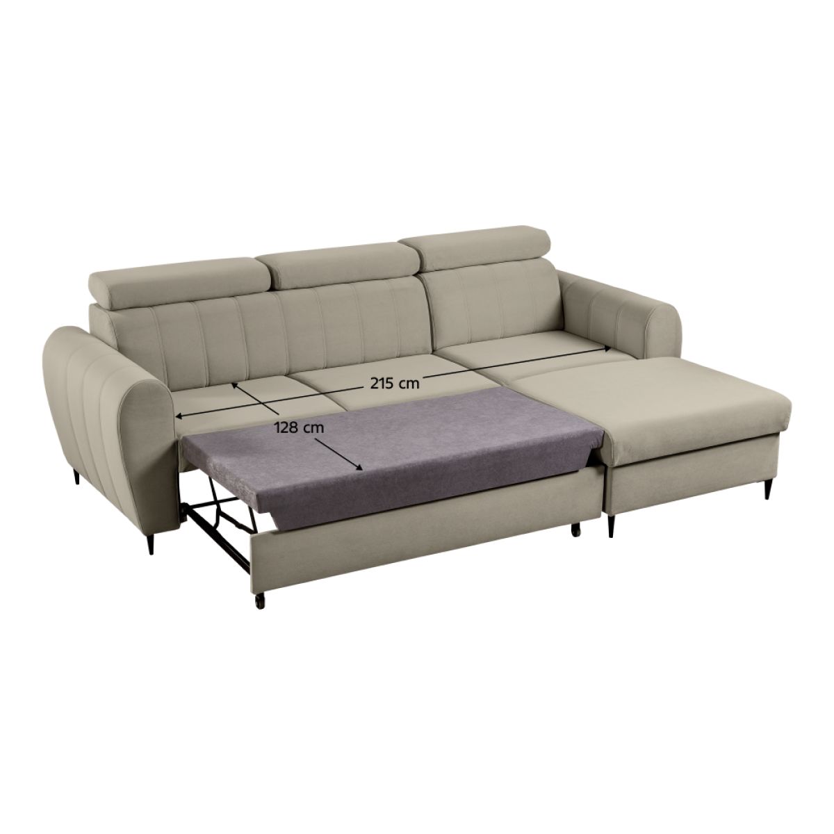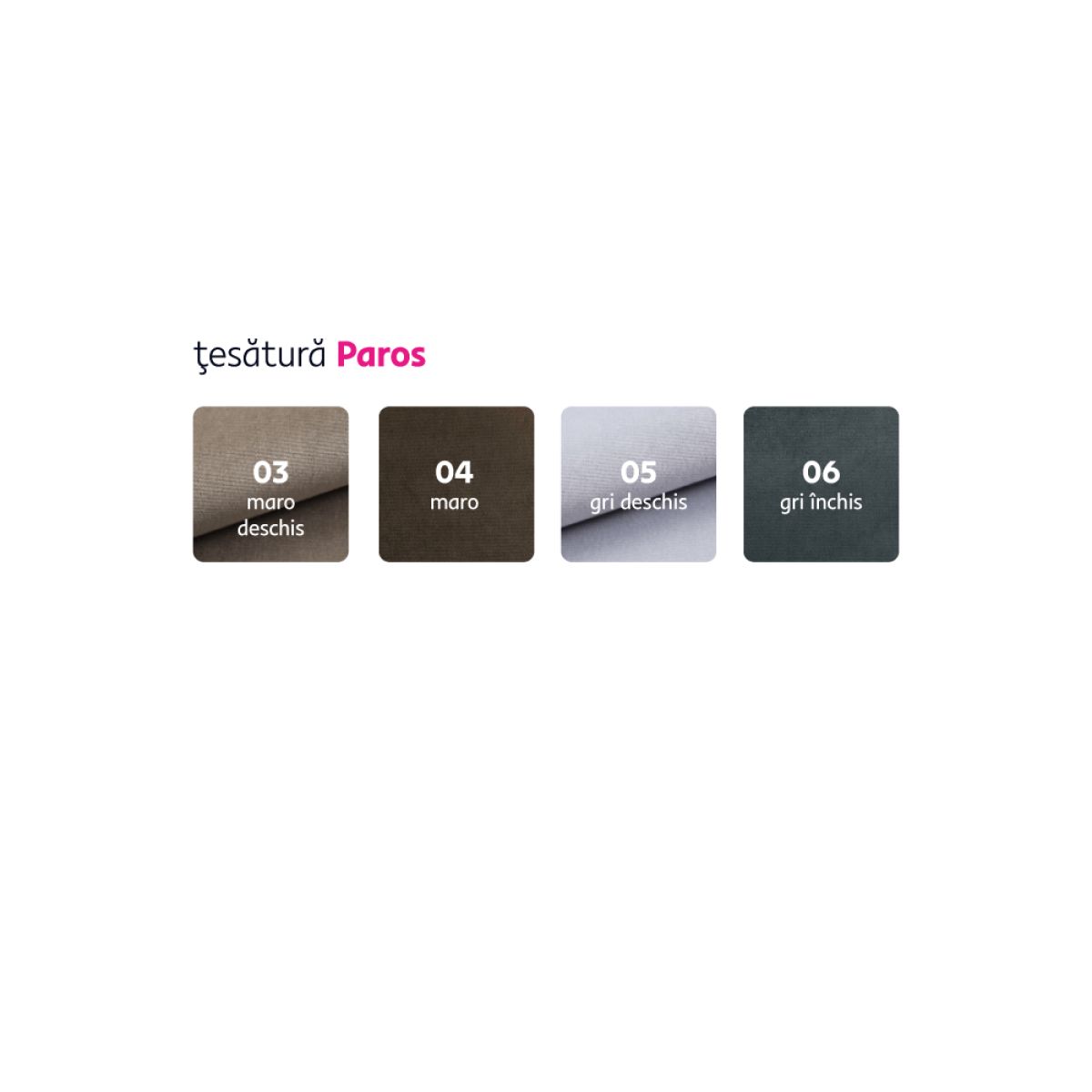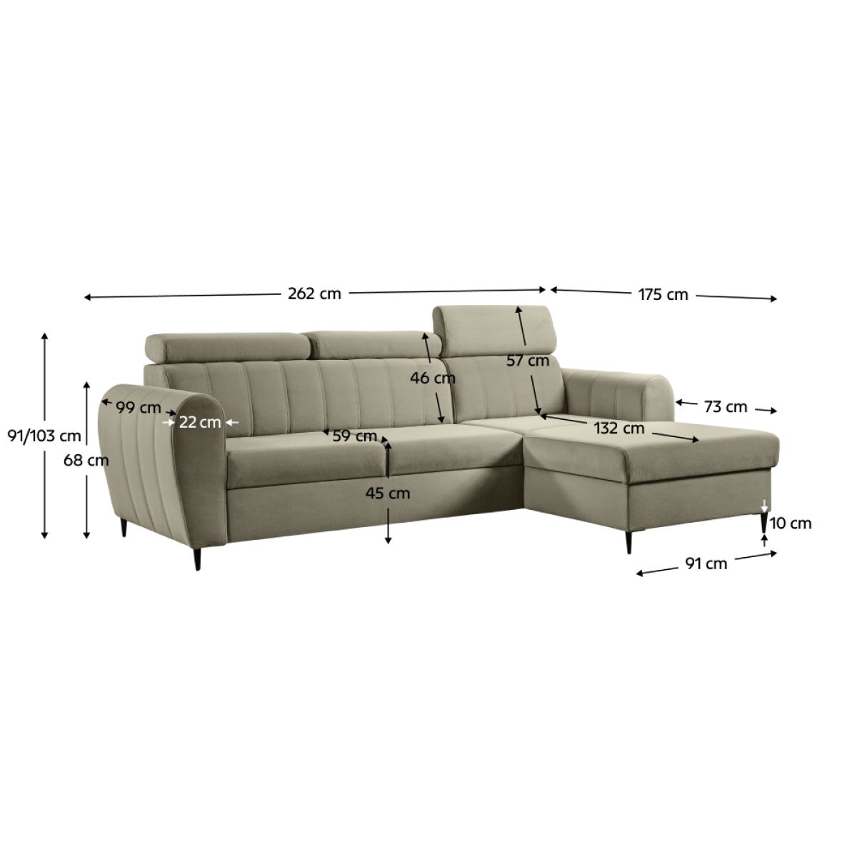 Material tapiţerie: stofă Paros 02 Rezistenţa la uzură a stofei conform testului Martindale: 50 000 Culoarea tapiţeriei: bej Dimensiuni (LxAxA): 262x175x91/103 cm Suprafaţa de dormit (LxA): 128x215 cm Înălţimea de şezut: 45 cm Adâncimea de şezut: 59 cm Lăţimea otomanului: 91 cm Adâncimea otomanului: 132 cm Dimensiunile cotierelor (LxAxA): 22x99x68 cm Înălţimea raftului inferior de la podea: 10 cm Pe picioare Materialul picioarelor: metal Culoarea picioarelor: negru Capacitate de încărcare pe persoană: 90 kg Umplutura: arcuri falista + spumă poliuretanică Extensibilă Colţar Complet tapiţată Varianta dreapta Cu spaţiu de depozitare 3 tetiere reglabile 6 grade de poziţionare a tetierelor Se livrează în stare dezasamblată Poate fi comandat în 4 culori de ţesătură Paros, cu un termen de livrare de 6-8 săptămâni. Pentru comenzi individuale, este necesar un depozit de 10% din suma dată. După plata avansului, cererea dumneavoastră va fi introdusă în producţie.