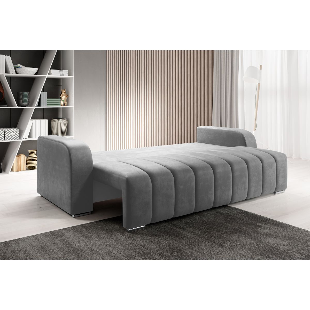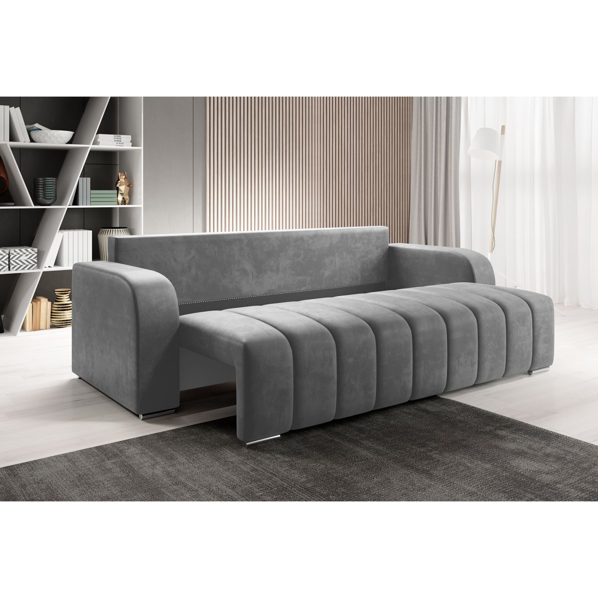 Material tapiţerie: Monolith 85 Rezistenţa la frecare a ţesăturii conform testului Martindale: 100.000 Culoare tapiţerie: gri Dimensiuni (LxAxÎ): 245x90x86 cm Suprafaţa pentru dormit (LxL): 140x200 cm Înălţime scaun: 47 cm Adâncime scaun: 57 cm Cu picioare Materialul picioarelor: plastic Culoare picioarelor: argintiu Înălţimea compartimentului inferior de la podea: 3 cm Capacitate de susţinere per persoană: 90 kg Umplutura: arcuri de oţel + spumă poliuretanică, Extensibilă, Tapiţată integral, Universală Cusături decorative, Material impermeabil, Cu spaţiu de depozitare, 3 perne mari 2 perne mici incluse în set, Dimensiuni perne mari (LxL): 67x50 cm Dimensiuni perne mici (LxL): 38x38 cm Se livrează dezasamblat