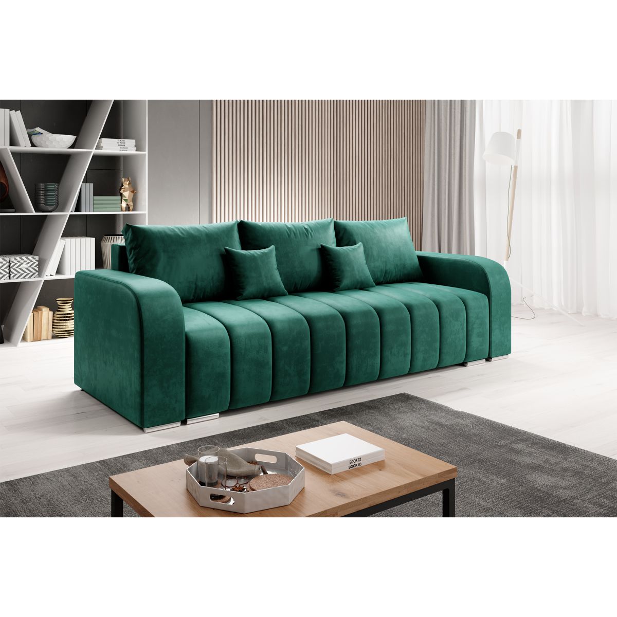 Material tapiţerie: Monolith 37 Rezistenţa la frecare a ţesăturii conform testului Martindale: 100.000 Culoare tapiţerie: smarald Dimensiuni (LxAxÎ): 245x90x86 cm Suprafaţa pentru dormit (LxL): 140x200 cm Înălţime scaun: 47 cm Adâncime scaun: 57 cm Cu picioare Materialul picioarelor: plastic Culoare picioarelor: argintiu Înălţimea compartimentului inferior de la podea: 3 cm Capacitate de susţinere per persoană: 90 kg Umplutura: arcuri de oţel + spumă poliuretanică, Extensibilă, Tapiţată integral, Universală Cusături decorative, Material impermeabil, Cu spaţiu de depozitare, 3 perne mari 2 perne mici incluse în set, Dimensiuni perne mari (LxL): 67x50 cm Dimensiuni perne mici (LxL): 38x38 cm Se livrează dezasamblat