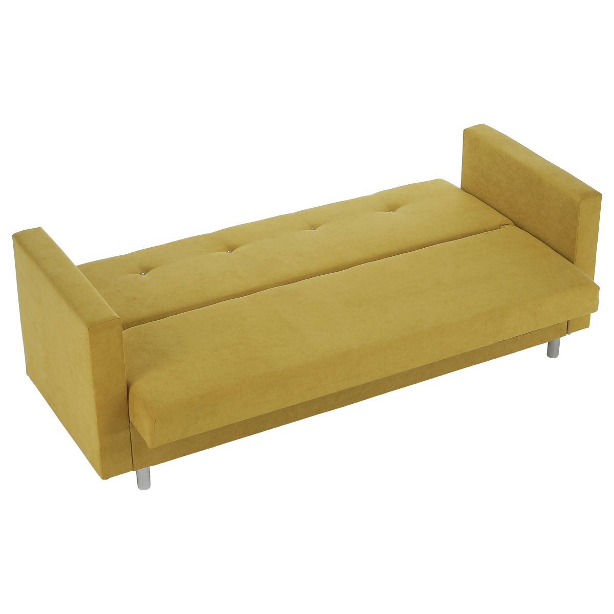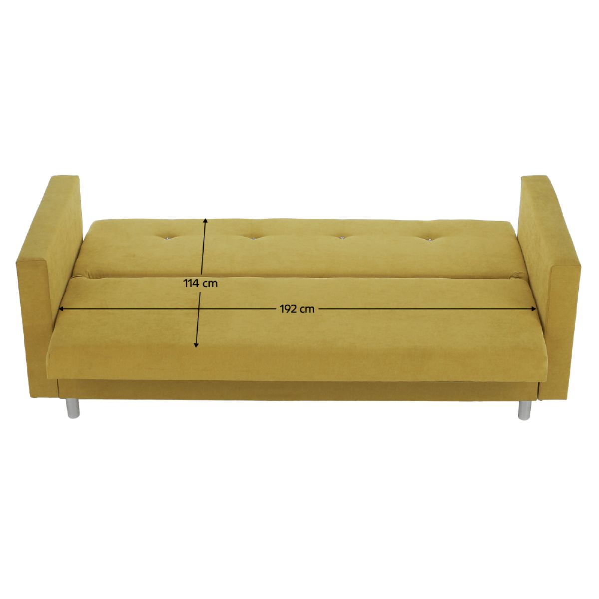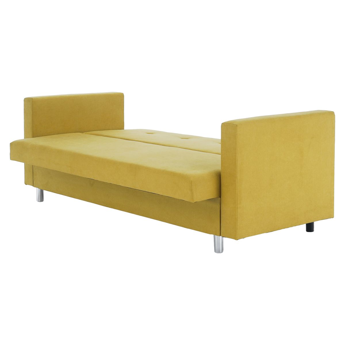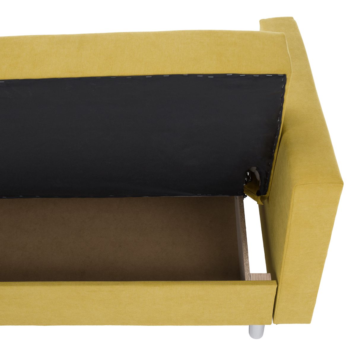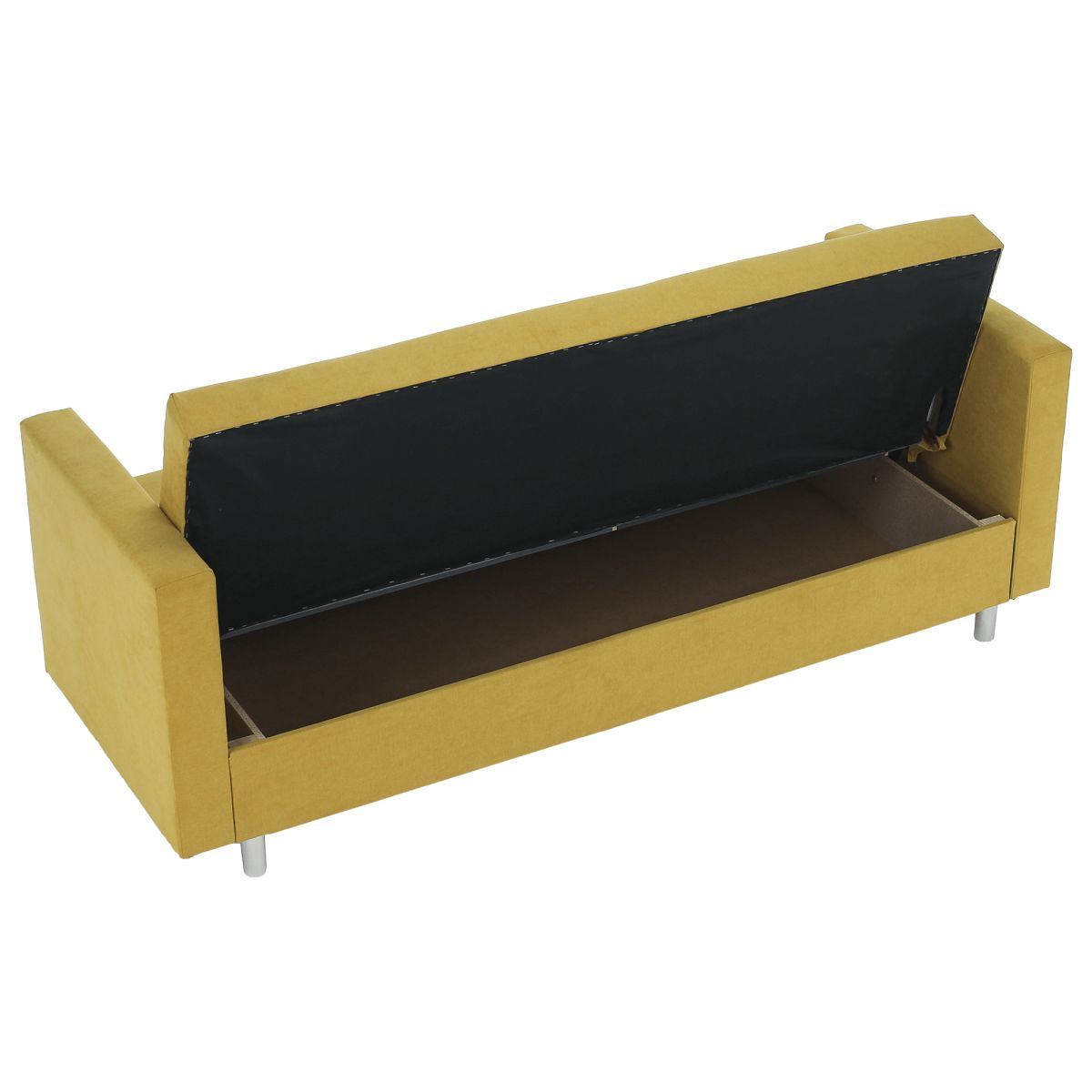 Material: ţesătură Soro 40 Rezistenţa ţesăturii la frecare conform testului Martindale: 90 000 de cicluri de frecare Culoare: galbenă Dimensiuni (lxAxh): 192x80x100 cm Suprafaţa de dormit (lxL): 112x192 cm Înălţime părţii de şezut: 37 cm Adâncimea părţii de şezut: 57 cm Cu picioare Materialul picioarelor: plastic Culoare picioarelor: argintiu Înălţimea compartimentului inferior de la podea: 5 cm Portanţă pe persoană: 90 kg Umplutură: spumă Cusături decorative cu elemente de design Extensibilă Spaţiu de depozitare Practică Modernă Livrat dezasamblat