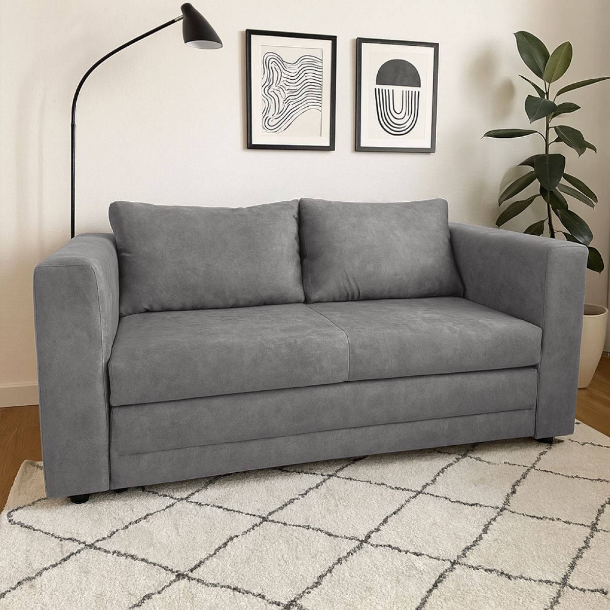 Material: ţesătură ENJOY 45/ Rezistenţa ţesăturii la frecare conform testului Martindale: 45 000 de cicluri de frecare Culoare: gri Dimensiuni (lxAxh): 138x69x63 cm Suprafaţa pentru dormit (lxL): 110x198 cm Înălţime părţii de şezut: 34,5 cm Adâncimea părţii de şedere cu perne: 45 cm Adâncimea părţii de şedere fără perne: 67 cm Lăţimea părţii de şezut: 100 cm Înălţimea părţii pentru dormit: 13 cm Grosime material construcţie: 2,2 cm Dimensiuni cotieră (lxAxh): 14x70x59 cm Pe picioare Material picioare: plastic Culoare picioare: neagră Înălţimea compartimentului inferior de la podea: 3,5 cm Umplutură: spumă PU Duritate: T25 Extensibilă Cu perne Dimensiuni perne (lxh): 57x38 cm Portanţă: 100 kg Greutate: 35 kg Practică Modernă Livrată dezasamblată