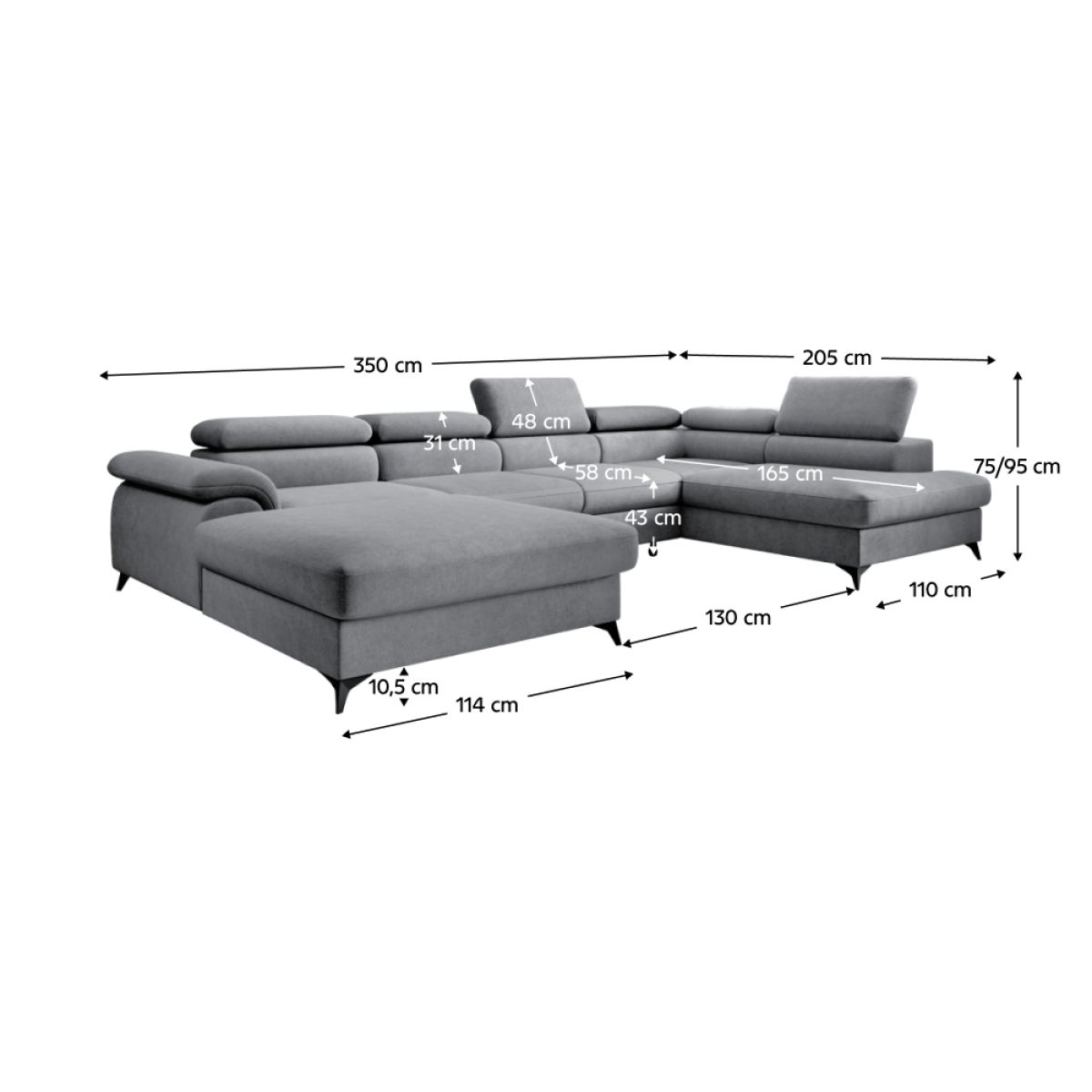 Material: ţesătură Whisper 17 Rezistenţa ţesăturii conform testului Martindale: 100.000 de cicluri de frecare Culoare: gri Dimensiuni (LxAxÎ): 350x205x75/95 cm Suprafaţa pentru dormit (LxL): 125x263 cm Înălţime scaun: 43 cm Adâncime scaun: 58 cm Lăţimea dintre otomane: 130 cm Adâncimea otomanului mai mic: 110 cm Adâncimea otomanului mai mare: 114 cm Înălţime spătar: 52 cm Cu picioare Material picioare: metal Culoare picioare: neagră Înălţimea compartimentului inferior de la podea: 10,5 cm Umplutură: arcuri ondulate + spumă poliuretanică Extensibilă Tapiţată integral Variantă pentru partea dreaptă În formă de U Colţar Cu spaţiu de depozitare 6 tetiere ajustabile 5 grade de înclinare a tetierelor Livrată dezasamblată Posibilitatea de a alege dintre 5 nuanţe ale ţesăturii Whisper la preţul de 10.159 Lei. Pentru comenzi personalizate este necesară plata unui avans de 20% din suma totală. După achitarea avansului, comanda dumneavoastră va intra în producţie. Termenul de livrare este de 6-8 săptămâni.