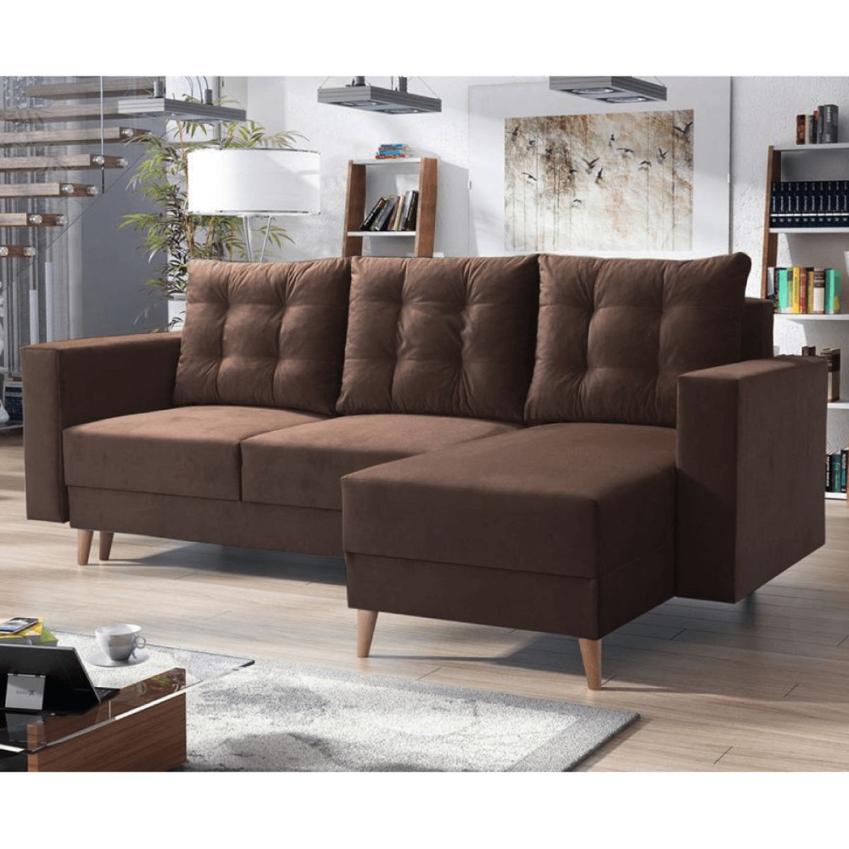 Material tapiţerie: ţesătură Kronos 6 Rezistenţa la frecare a ţesăturii conform testului Martindale: 60.000 Culoare tapiţerie: maro Dimensiuni (LxAxÎ): 235x145x90 cm Suprafaţa pentru dormit (LxL): 130x200 cm Înălţime scaun: 46 cm Adâncime scaun: 52 cm Lăţime otoman: 68 cm Lăţime scaun: 135 cm Lăţime cotieră: 15 cm Înălţimea compartimentului inferior de la podea: 13 cm Cu picioare de lemn Culoare picioare: fag Capacitate de susţinere per persoană: 90 kg Umplutura: arcuri ondulate + spumă poliuretanică, 3 perne incluse în set, Dimensiuni perne (LxL): 68x58 cm Colţar extensibil, Tapiţat integral, Cu spaţiu de depozitare, Dreapta, Livrat dezasamblat