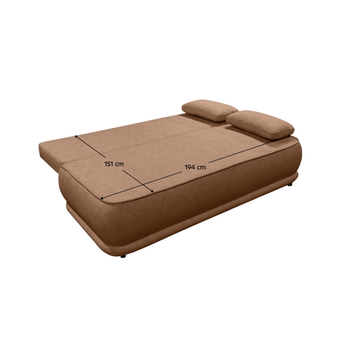 Material: ţesătură Blur 5 Rezistenţa ţesăturii la frecare conform testului Martindale: 50 000 de cicluri de frecare Culoare: melir maro Dimensiuni (lxAxh): 204x100x/76/95 cm suprafaţa pentru dormit (lxL): 151x194 cm Înălţimea părţii de şezut: 46 cm Adâncimea părţii de şezut: 45/62/83 cm Portanţă pe persoană: 90 cm Pe picioare Material picioare: plastic Culoare picioare: neagră Înălţimea compartimentului inferior de la podea: 3 cm Umplutură: spumă poliuretanică Tapiţată integral Spaţiu de depozitare Perne incluse în set Dimensiunile pernei mari (lxh): 62x51 cm Dimensiunile pernelor mai mici (lxh): 60x35 cm Dimensiunile pernelor decorative (lxh): 65x35 cm Practică Modernă Livrată dezasamblată