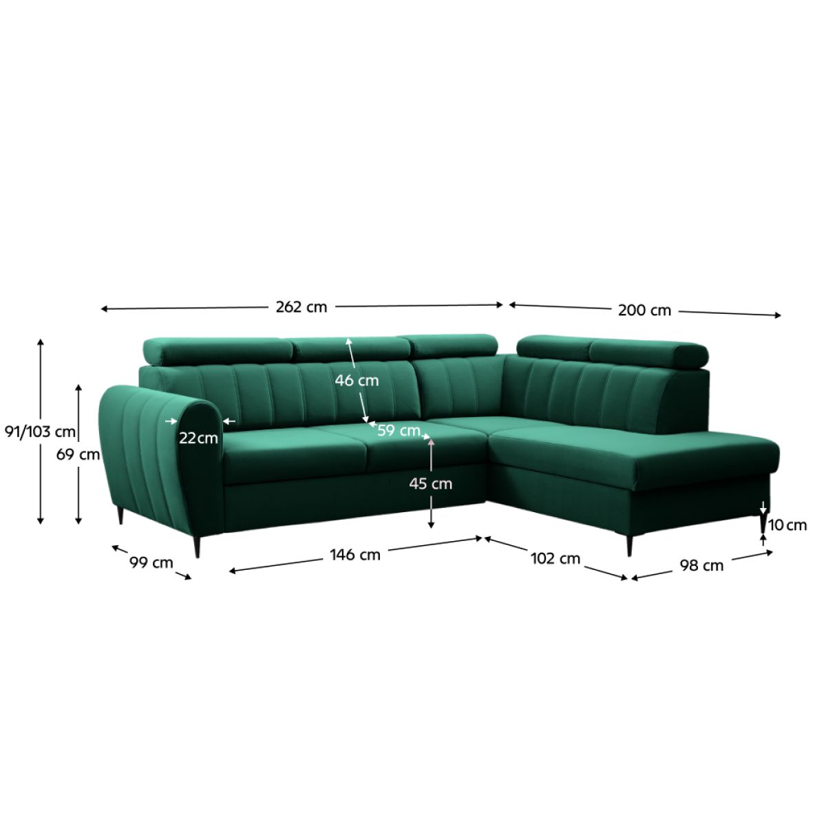 Material tapiţerie: stofă Kronos 19 Rezistenţa la uzură a stofei conform testului Martindale: 50 000 Culoarea tapiţeriei: smarald Dimensiuni (LxAxA): 262x200x91/103 cm Suprafaţa de dormit (LxA): 128x210 cm Înălţimea de şezut: 45 cm Adâncimea de şezut: 46/59 cm Lăţimea otomanului: 98 cm Lăţimea scaunului: 146 cm Dimensiunile cotierelor (LxAxA): 22x99x69 cm Înălţimea raftului inferior de la podea: 10 cm Pe picioare Materialul picioarelor: metal Culoarea picioarelor: negru Capacitate de încărcare pe persoană: 90 kg Umplutura: arcuri falista + spumă poliuretanică Extensibilă Colţar Complet tapiţată Varianta dreapta Cu spaţiu de depozitare Tetiere reglabile Se livrează în stare dezasamblată Poate fi comandat în 4 culori de ţesătură Paros şi 4 culori de stofă Kronos, cu un termen de livrare de 6-8 săptămâni. Pentru comenzi individuale, este necesar un depozit de 10% din suma dată. După plata avansului, cererea dumneavoastră va fi introdusă în producţie.