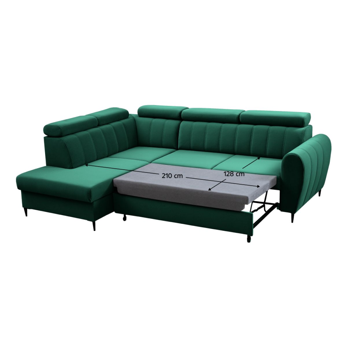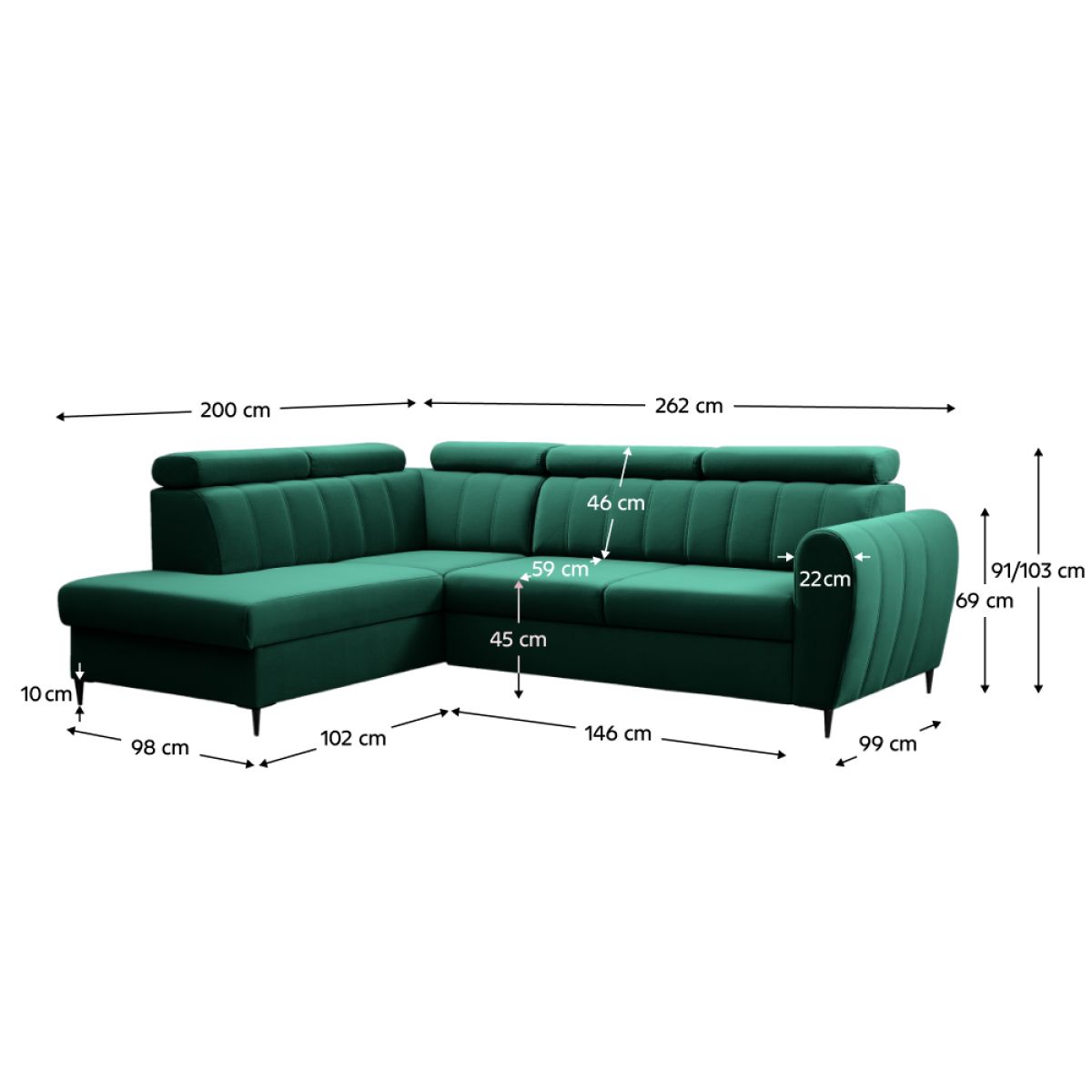 Material tapiţerie: stofă Kronos 19 Rezistenţa la uzură a stofei conform testului Martindale: 50 000 Culoarea tapiţeriei: smarald Dimensiuni (LxAxA): 262x200x91/103 cm Suprafaţa de dormit (LxA): 128x210 cm Înălţimea de şezut: 45 cm Adâncimea de şezut: 46/59 cm Lăţimea otomanului: 98 cm Lăţimea scaunului: 146 cm Dimensiunile cotierelor (LxAxA): 22x99x69 cm Înălţimea raftului inferior de la podea: 10 cm Pe picioare Materialul picioarelor: metal Culoarea picioarelor: negru Capacitate de încărcare pe persoană: 90 kg Umplutura: arcuri falista + spumă poliuretanică Extensibilă Colţar Complet tapiţată Variantă stânga Cu spaţiu de depozitare Tetiere reglabile Se livrează în stare dezasamblată Poate fi comandat în 4 culori de ţesătură Paros şi 4 culori de stofă Kronos, cu un termen de livrare de 6-8 săptămâni. Pentru comenzi individuale, este necesar un depozit de 10% din suma dată. După plata avansului, cererea dumneavoastră va fi introdusă în producţie.