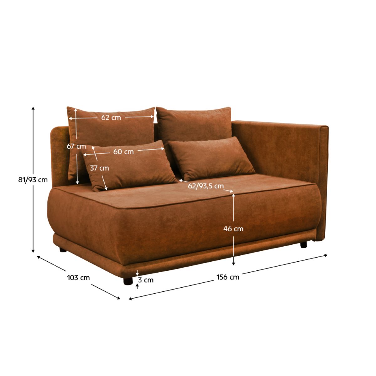 Material: ţesătură Gerra 25 Rezistenţa ţesăturii la frecare conform testului Martindale: 40.000 de cicluri de frecare Culoare: teracotă Dimensiuni (lxAxh): 157x100x80/85 cm Suprafaţa pentru dormit (lxL): 90x216 cm Înălţime scaun: 43 cm Adâncimea părţii de şezut: 54/76 cm Portanţă per persoană: 90 cm Pe picioare Material picioare: plastic Culoare picioare: neagră Înălţimea compartimentului inferior de la podea: 3 cm Umplutură: spumă T30 Extensibilă Spaţiu de depozitare Perne incluse în set Dimensiunile pernelor mari (lxh): 67x62 cm Dimensiunile pernelor mai mici (lxh): 37x60 cm Versiune pe dreapta Practică Modernă Livrat dezasamblat