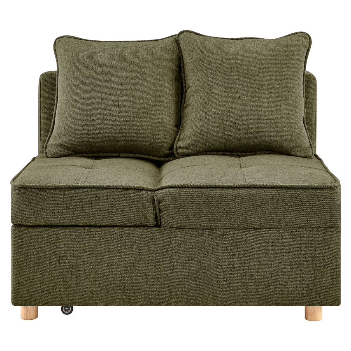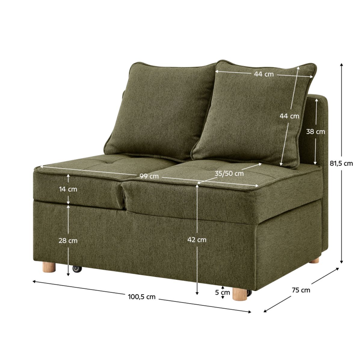Material: ţesătură Neve 39/lemn/metal Rezistenţa ţesăturii la frecare conform testului Martindale: 80 000 de cicluri de frecare Culoare: verde Dimensiuni (lxAxh): 100,5x75x81,5 cm Suprafaţa pentru dormit (lxL): 66x184 cm Înălţimea părţii de şezut: 42 cm Înălţimea părţii de şezut fără saltea: 28 cm Adâncime părţii de şezut: 35 cm Adâncimea părţii de şezut fără perne: 50 cm Lăţimea părţii de şezut: 99 cm Lăţime după extindere: 184 cm Înălţime spătar: 38 cm Lăţime spătar: 99 cm Înălţimea saltelei: 14 cm Portanţă: 90 cm Cu picioare Material picioare: lemn de fag Culoare picioare: naturală Înălţimea compartimentului inferior de la podea: 5 cm Canapea cu 2 locuri Complet tapiţată Extensibilă Tetieră reglabilă în 5 poziţii de poziţionare Livrată cu perne Dimensiuni perne (lxAxh): 44x15x44 cm Cusătură decorativă Practică, Design modern şi practic Livrată dezasamblată