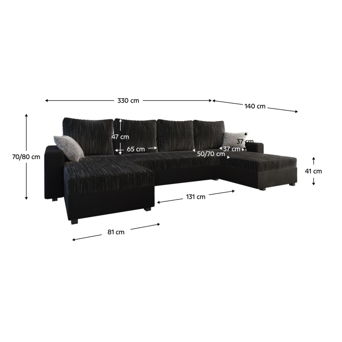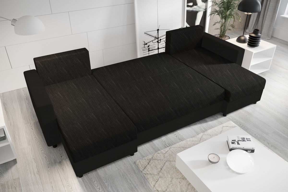 Material: stofă Kornet 10/piele ecologică D8/stofă Kornet 18 Rezistenţa la uzură a ţesăturii conform testului Martindale: 40 000 de frecări Rezistenţa la abraziune a pielii ecologice conform testului Martindale: 100 000 de frecări Culoare: negru/negru/gri Dimensiuni (LxAxA): 350x161x70/80 cm Înălţimea scaunului: 41 cm Adâncimea de şezut: 50/70 cm Suprafaţă de dormit (LxA): 133x294 cm Lăţimea otomanului: 81 cm Lăţimea spaţiului liber între otomane: 131 cm Capacitate de încărcare pe persoană: 90 kg Umplerea părţii de scaun - arcuri falista Formă de U Extensibilă Complet tapiţată Universală Picioare din plastic Culoarea picioarelor: negru Înălţimea picioarelor: 5 cm Cu spaţiu de depozitare Se livrează cu perne Dimensiunile pernelor mai mari (LxA): 65x47 cm Dimensiunile pernelor mai mici (LxA): 37x37 cm Se livrează în stare dezasamblată