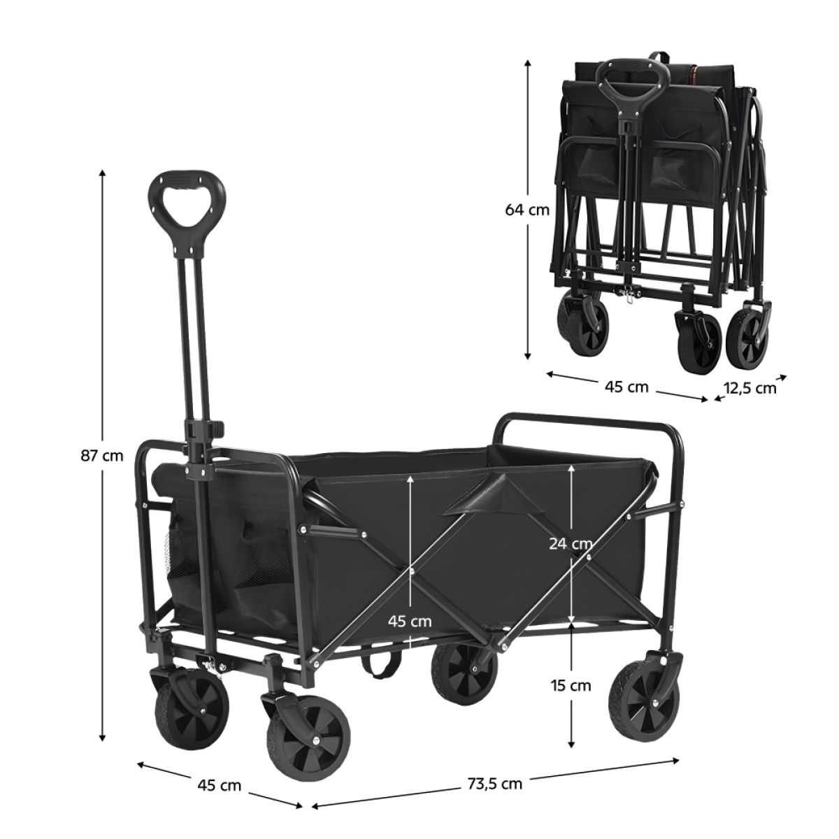 Material: oţel/ţesătură Oxford Rezistenţa la frecare a ţesăturii conform testului Martindale: 7 600 de cicluri de frecare Culoare: neagră Dimensiuni (lxAxh): 48x76x67/87 cm Dimensiunile căruciorului pliat (lxAxh): 48x12,5x67 cm Portanţă: 100 kg Greutate: 5 kg Volum: 60 l Practic Pliabil Mâner reglabil în înălţime 2 roţi fixe şi 2 roţi pivotante Diametrul roţii: 12 cm Coş de pânză detaşabil 2 buzunare laterale Manipulare şi depozitare uşoară Livrat asamblat
