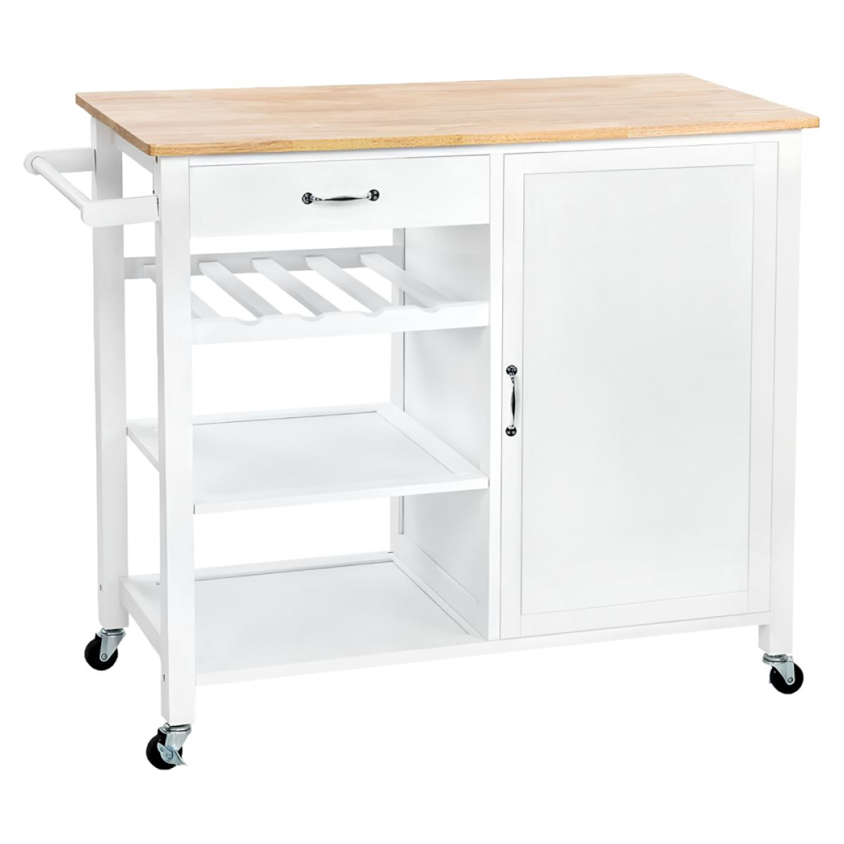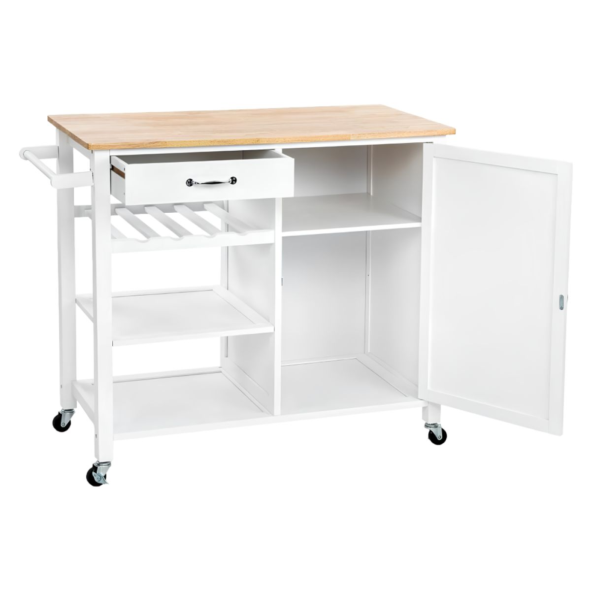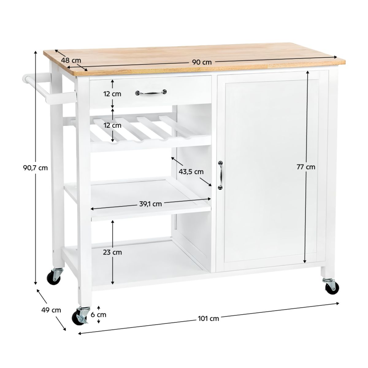 Material: MDF/furnir de lemn Culoare: albă/stejar Dimensiuni (lxAxh): 101x49x90,7 cm Grosime material: 1,2 - 1,5 cm Portanţa plăcii superioare: 20 kg Portanţă poliţă: 5 kg 1 sertar Dimensiuni sertar (lxAxh): 38,8x36,5x12 cm 1 dulăpior Dimensiuni dulăpior (lxAxh): 38,6x43,5x77 cm Cu poliţe Dimensiuni poliţă (lxA): 39,1x43,5 cm 1 poliţă pentru sticle Suport lateral pentru prosoape Mobil Cu roţi 2 roţi cu frâne Cu mânere Material mâner: aliaj de zinc Culoare mâner:crom Asistent multifuncţional Livrat dezasamblat