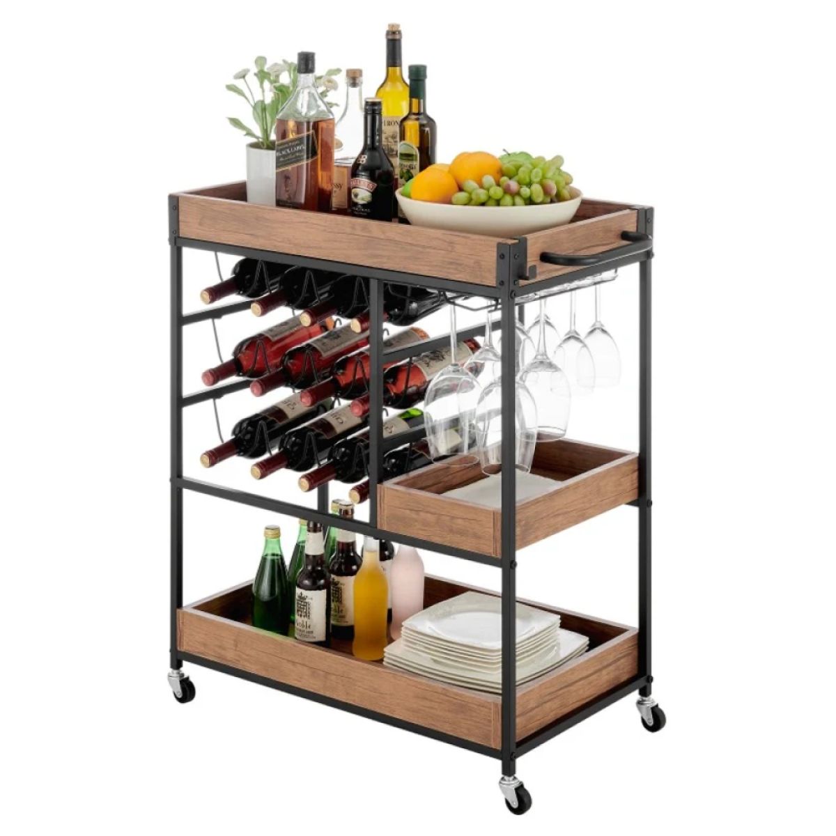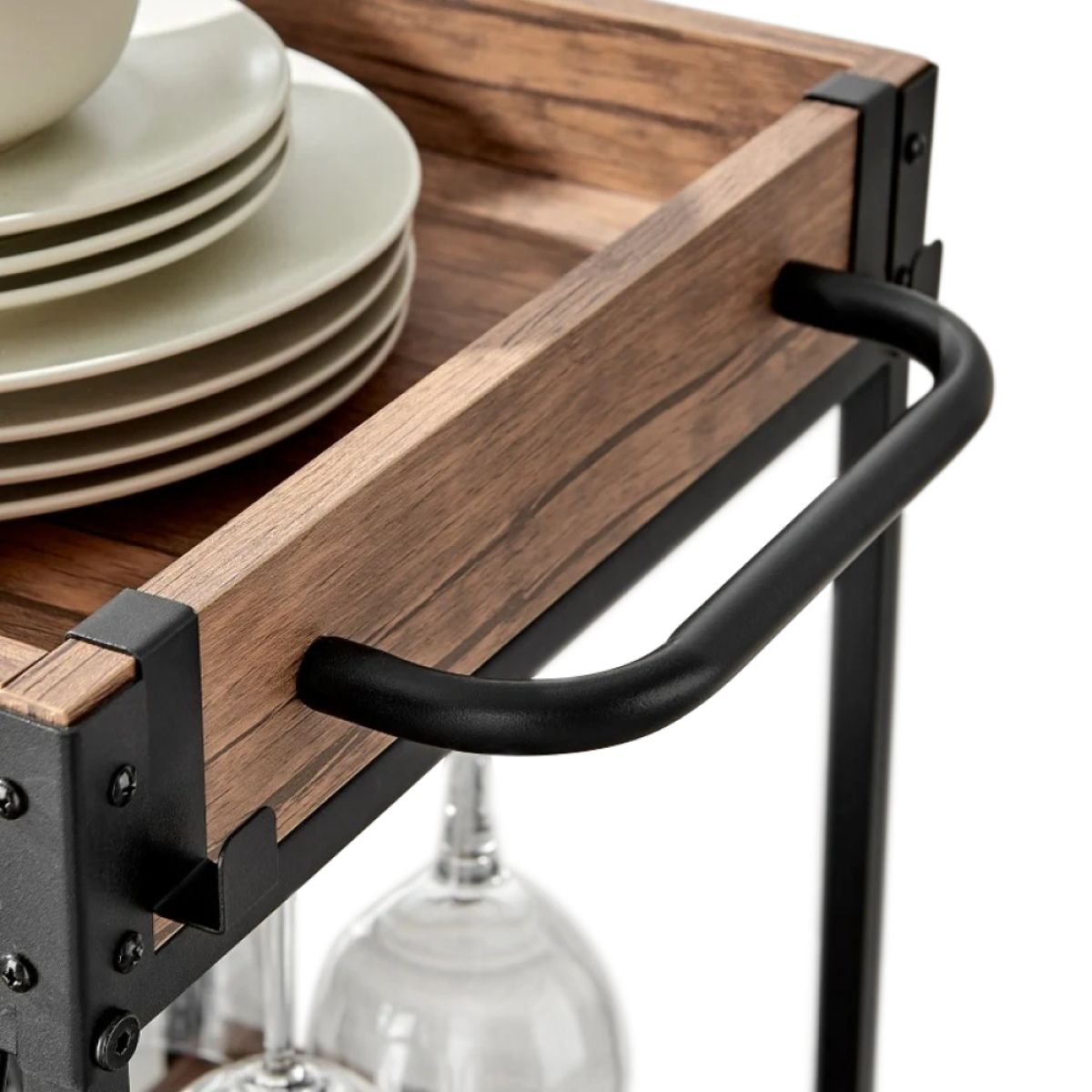 Material: MDF/folie PVC/metal Culoare: stejar închis/negru Dimensiuni (lxAxh): 83x43x90 cm Portanţă: max. 10 kg Grosime material: Dimensiuni raft de 1,5 cm Dimensiuni poliţă inferioară (lxAxh): 75,7x40x7 cm Dimensiuni poliţă mijlocie (lxAxh): 31,5x40x7 cm Dimensiuni poliţă superioară (lxAxh): 80x40x7 cm Raftul superior are fronturi ridicate Raftul superioară are mânere, este deta?abilă Raftul superioară poate fi folosită ca tavă sau platou Suport pentru sticle Suport pentru pahare Suport pentru prosoape lateral Cârlig pentru prosop Mobile Cu roţi 2 roţi cu frâne Ajutor multifuncţional Stil rustic Livrat dezasamblat