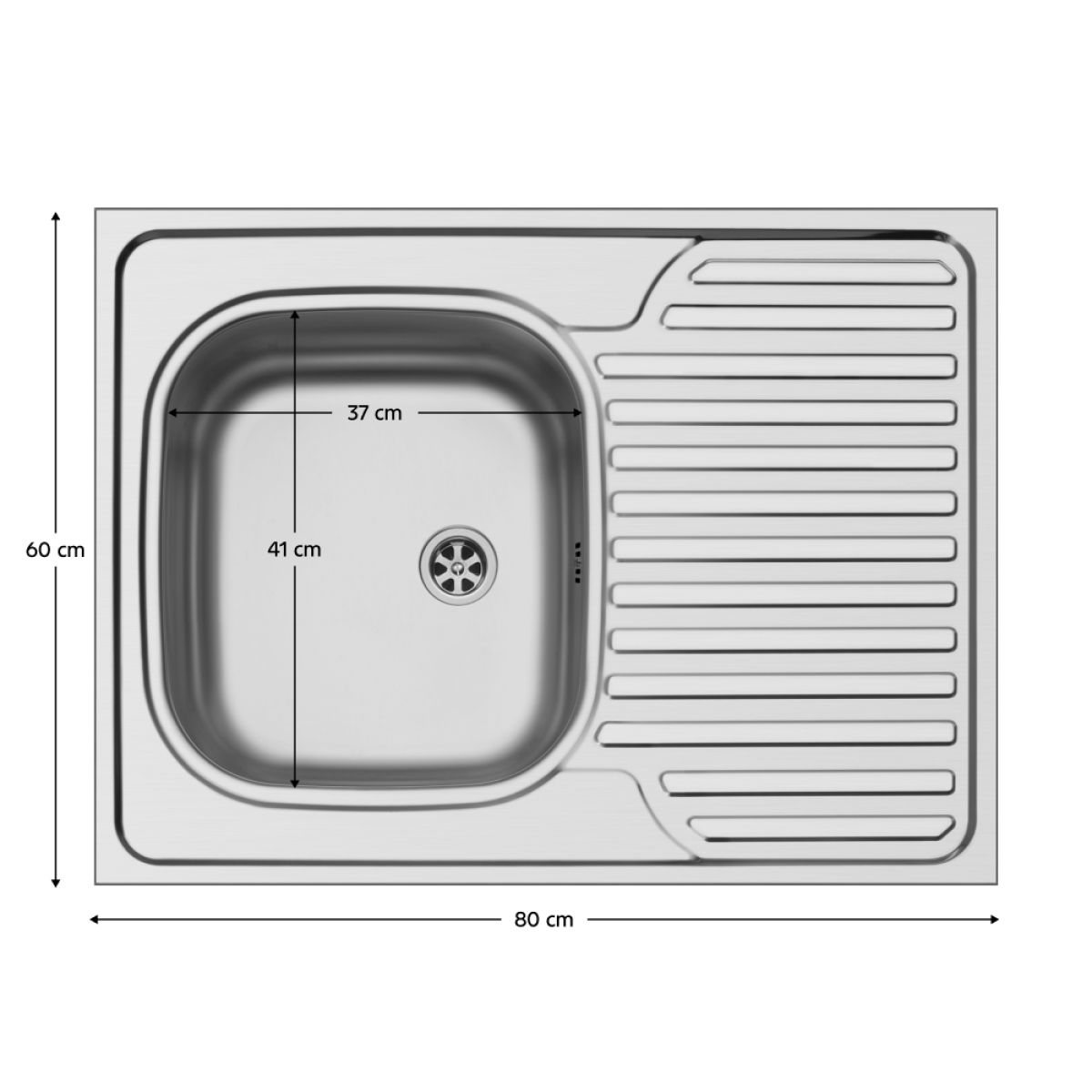 Material: inox Dimensiuni exterioare (LxI): 80x60 Dimensiuni interioare (IxAxh): 37x41x12 Preţul include: cleme şi sifon Grosime: 0,8 mm Universal Neted Rectangular Greutatea chiuvetei: 4 kg