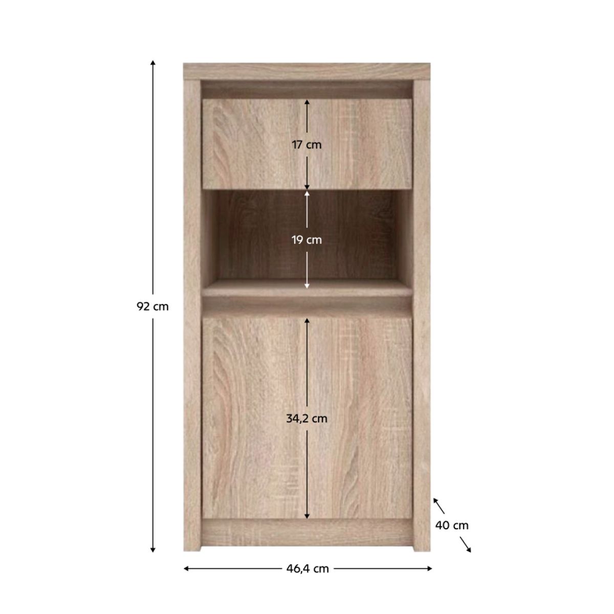 Material: DTD melaminat Culoare: stejar sonoma Dimensiuni (Lxlxh): 46,4x40x92,8x92 cm Grosimea materialului: 3,2 cm Grosimea materialului celelalte părţi: 1,6 cm Sertar Înălţime sertar: 17 cm Compartiment de depozitare deschis Înălţimea compartimentului de depozitare deschis: 19 cm Dulap cu o uşă Înălţimea dulapului: 34,2 cm Vă recomandăm să ataşaţi mobilierul de perete Livrat dezasamblat