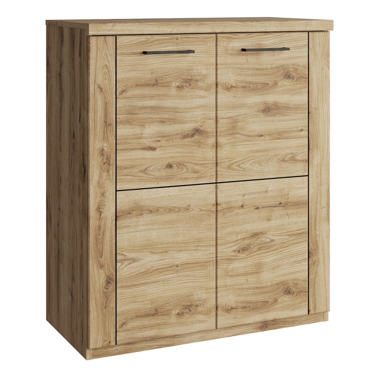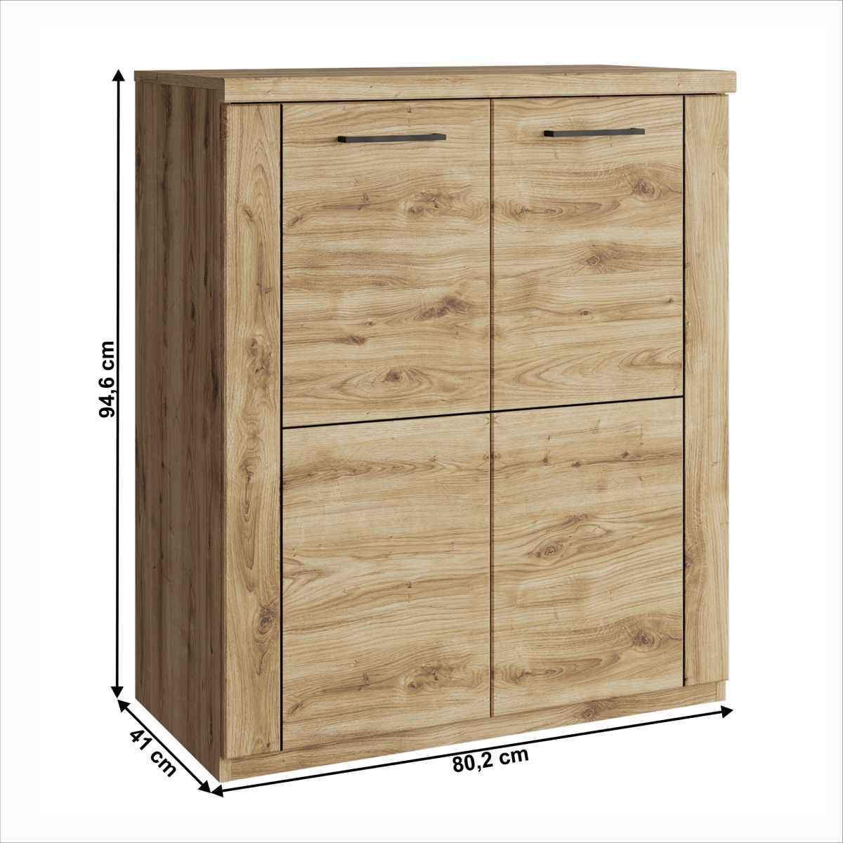 "Comodă DORSI 2D Material: DTD laminat/MDF Culoarea: stejar navarra Dimensiuni (LxAxÎ): 80,2x41x94,6 cm Grosimea materialului: 1,6 cm Cu două uşi Cu rafturi Mânere din plastic Culoarea mânerului: neagră Design modern Livrat în formă dezasamblată