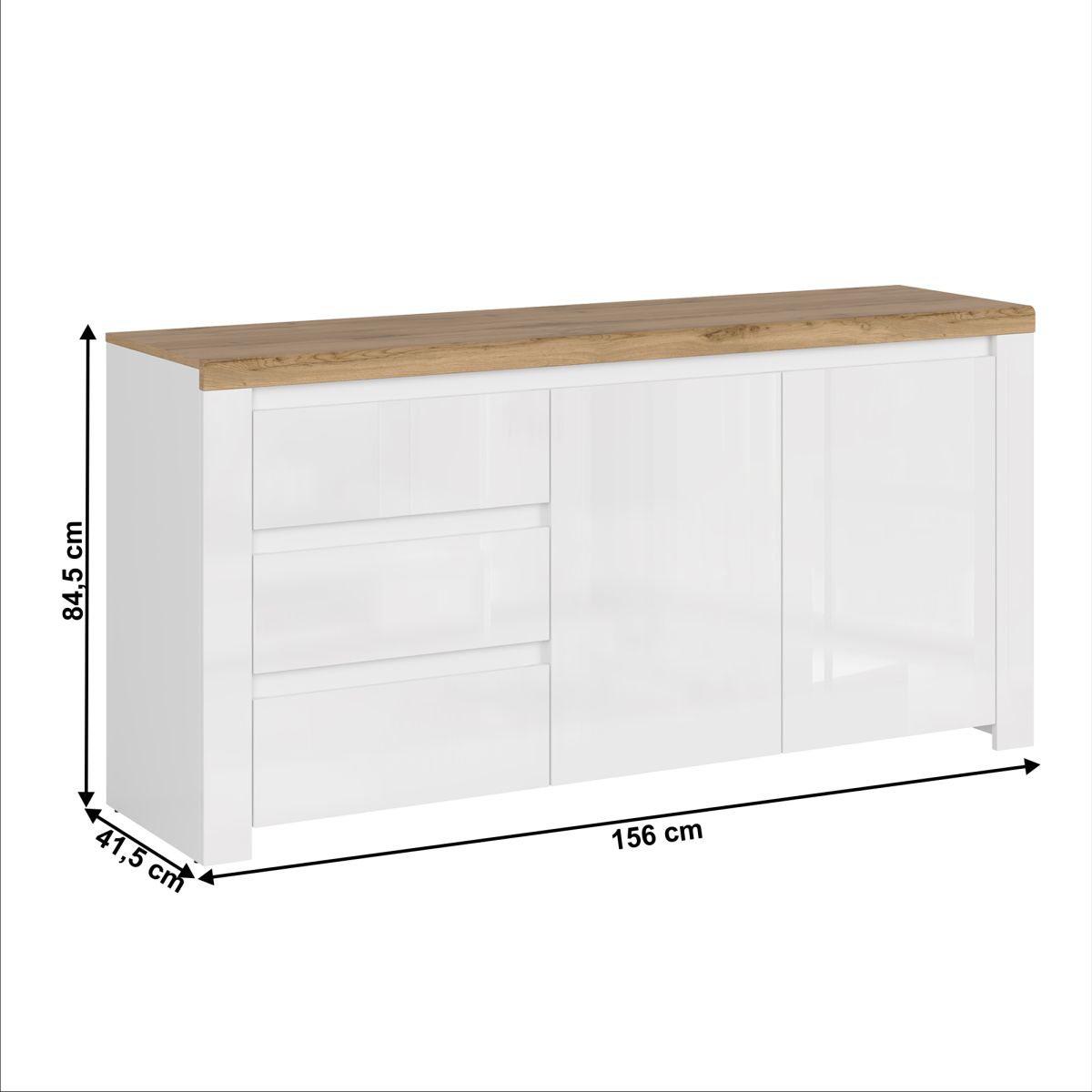 Material: DTD laminat/ canturi ABS/ MDF Culoare: alb foarte lucios/ stejar wotan Dimensiuni (LxAxÎ): 156x41,5x84,5 cm Înălţimea spaţiului inferior de la podea: 5 cm Grosimea materialului: 1,6 până la 2,2 cm Trei sertare Dimensiuni sertar (lxA): 51,6x20,2 cm Un dulap Există rafturi în dulap Înălţime rafturi: 32,2 cm Uşă din MDF Deschidere/închidere cu o decupare Livrată dezasamblată