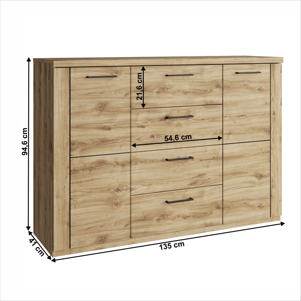 "Comodă DORSI 2D4S Material: DTD laminat/MDF Culoarea: stejar navarra Dimensiuni (LxAxÎ): 135x41x 94,6 cm Grosimea materialului: 1,6 cm Cu două uşi Cu rafturi Patru sertare Dimensiunea sertarului (LxA): 54,6x21,6 cm Mânere din plastic Culoarea mânerului: neagră Design modern Livrat în formă dezasamblată