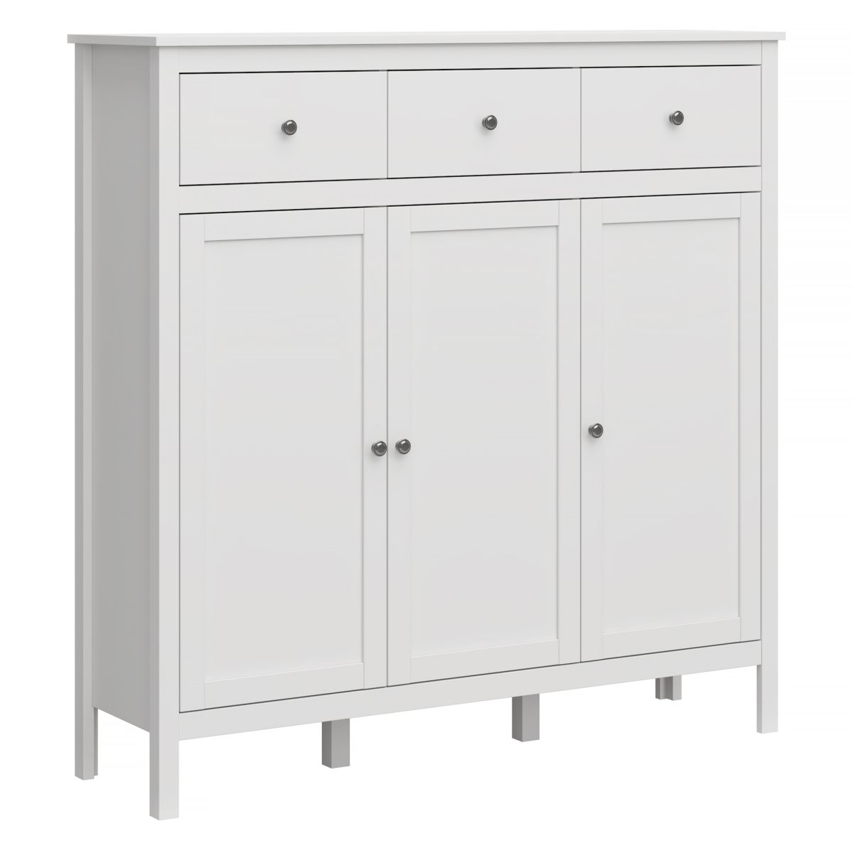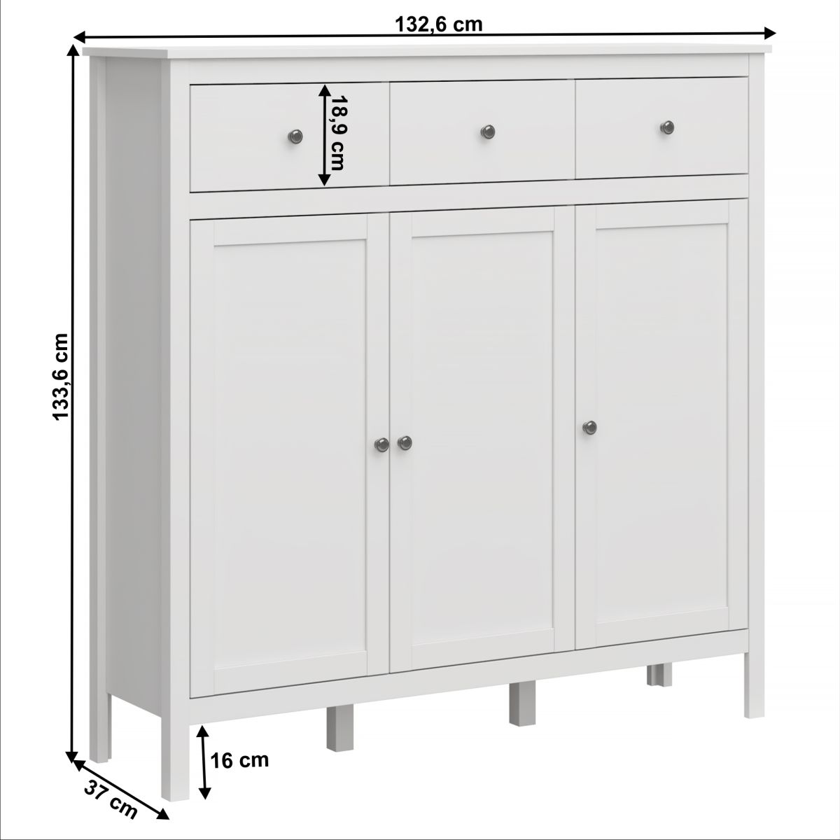 "Material: DTD laminat/canturi ABS/MDF Culoare albă Dimensiuni (LxlxÎ): 132,6x37x133,6 cm Înălţimea picioarelor: 16 cm Grosimea materialului: 1,6 cm Combinată Trei sertare Înălţime sertar: 18,9 cm Trei dulapuri Există rafturi în dulap Uşă din MDF Livrată dezasamblată "