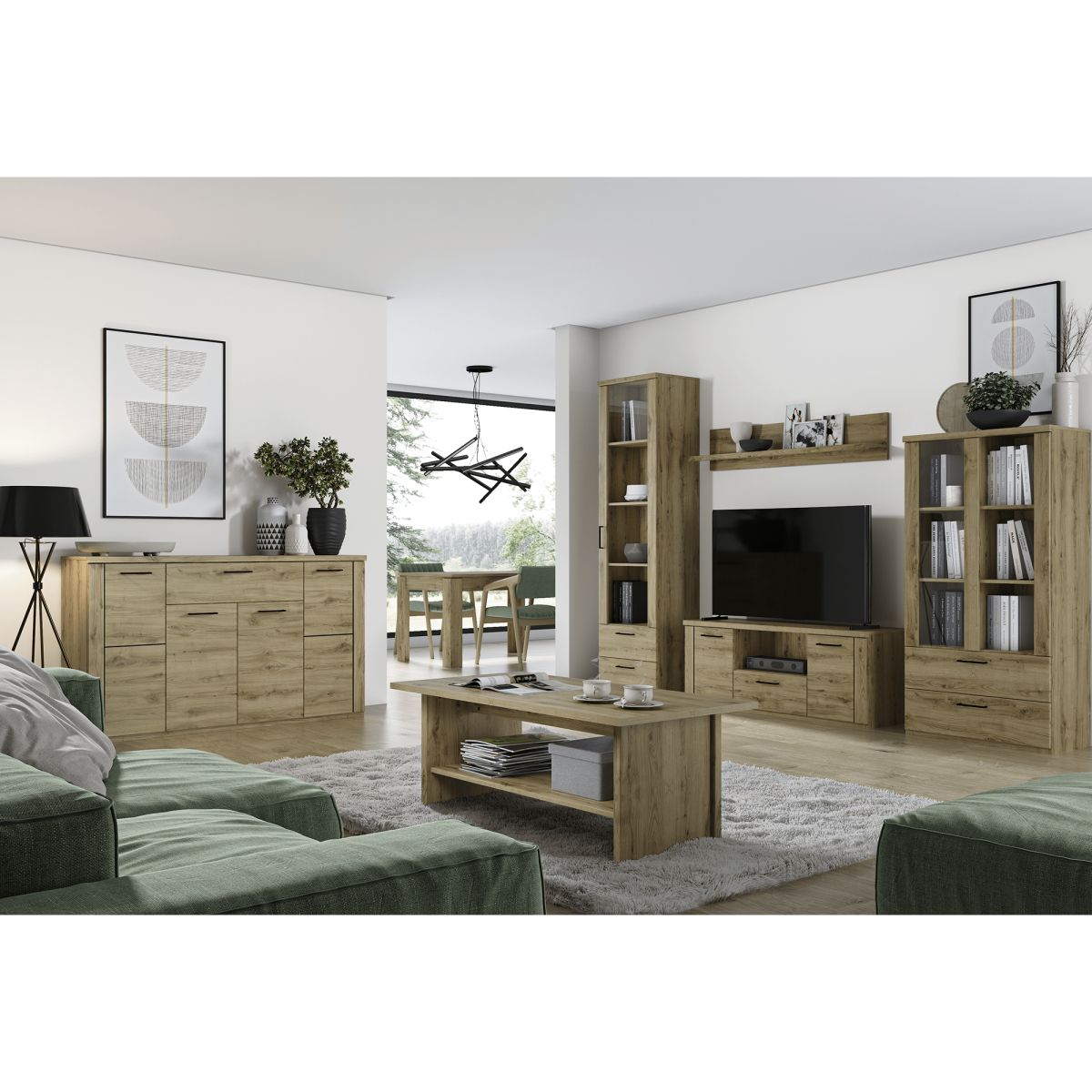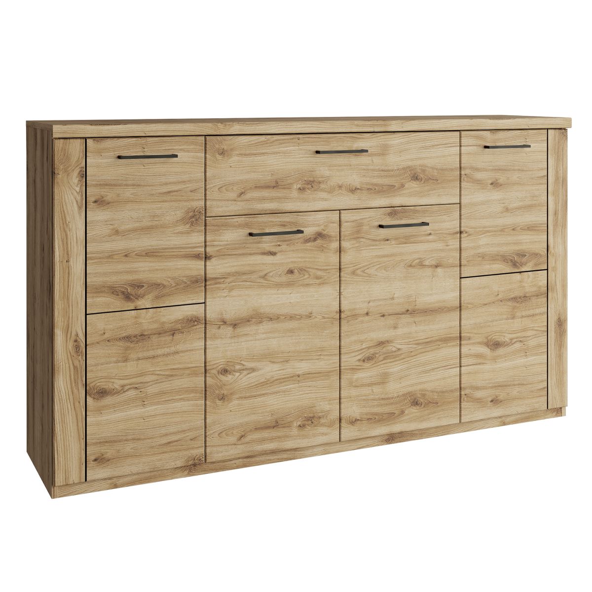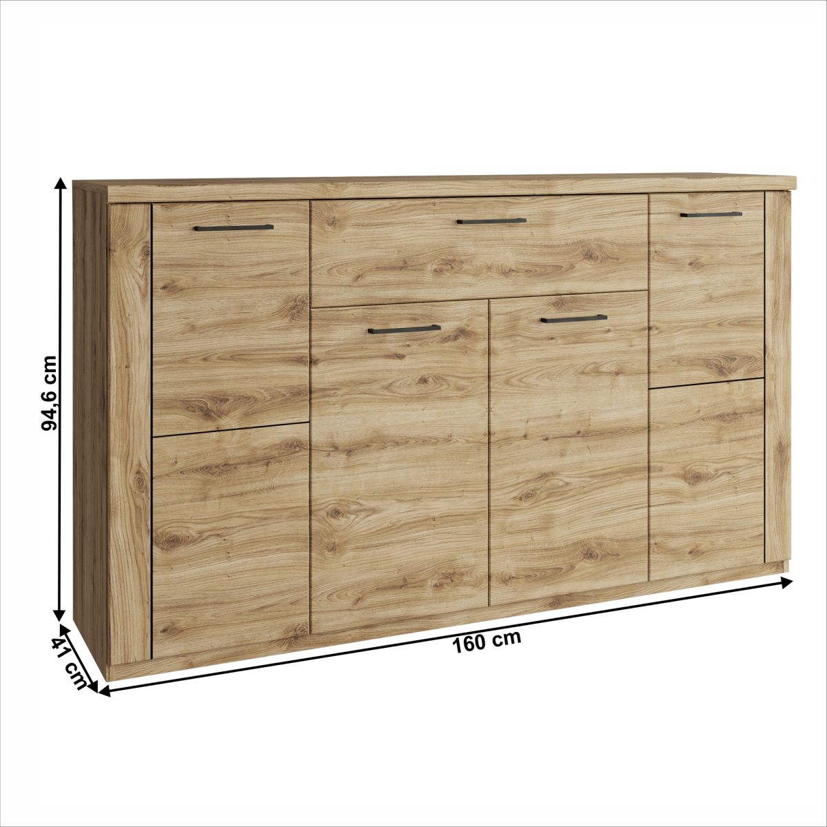 "Comodă DORSI 4D1S Material: DTD laminat/MDF Culoarea: stejar navarra Dimensiuni (LxAxÎ): 160x41x 94,6 cm Grosimea materialului: 1,6 cm Cu patru uşi Cu rafturi Un sertar Mânere din plastic Culoarea mânerului: neagră Design modern Livrat în formă dezasamblată"