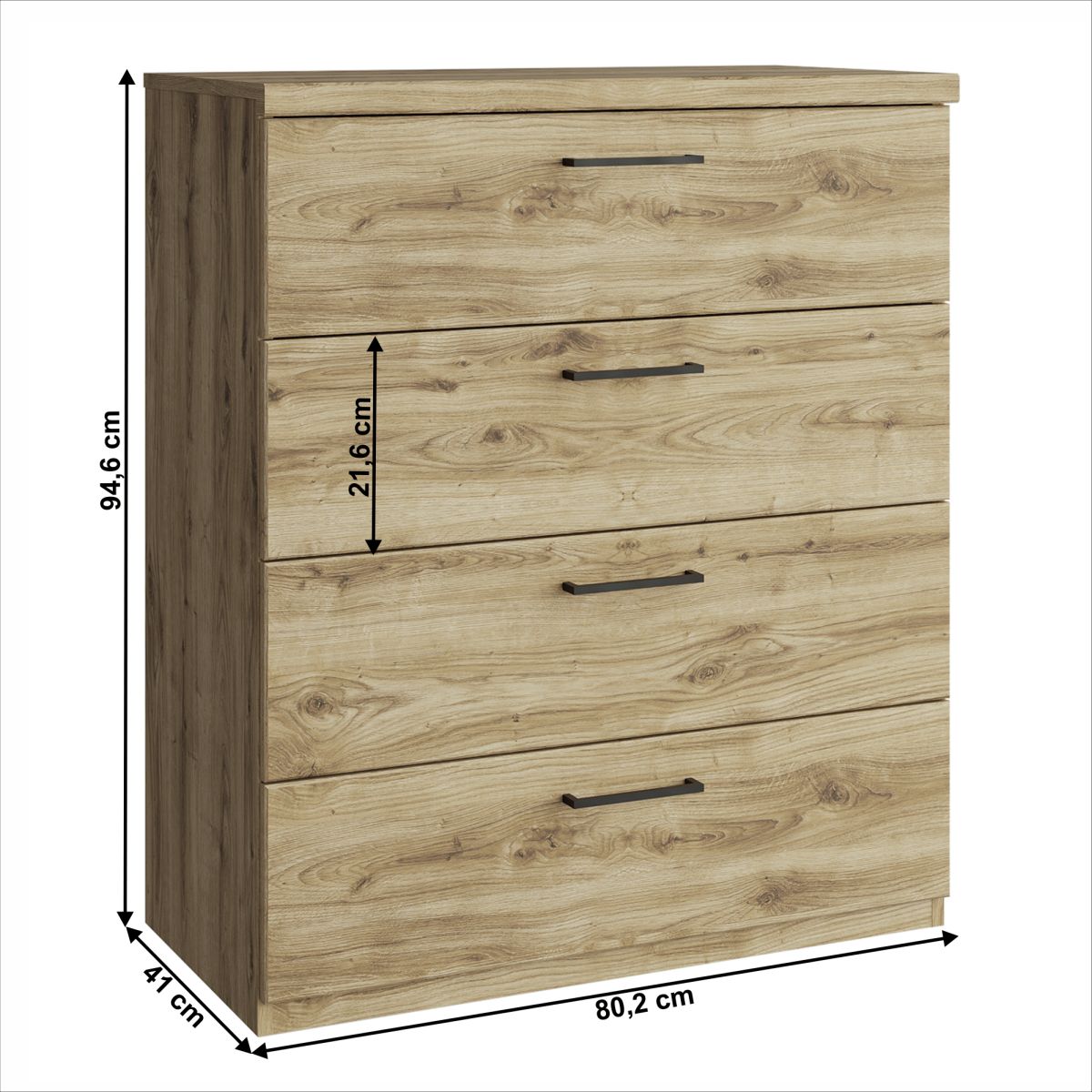 "Comodă DORSI 4S Material: DTD laminat/MDF Culoarea: stejar navarra Dimensiuni (LxAxÎ): 80,2x41x94,6 cm Grosimea materialului: 1,6 cm Patru sertare Înălţimea sertarelor: 21,6 cm Mânere din plastic Culoarea mânerului: neagră Design modern Livrat în formă dezasamblată"