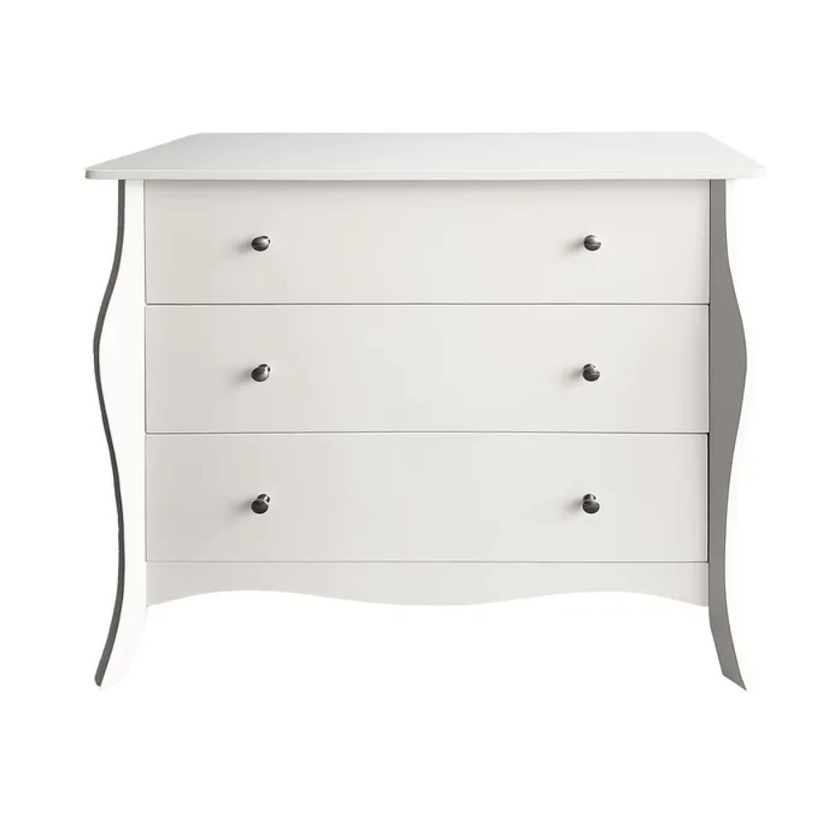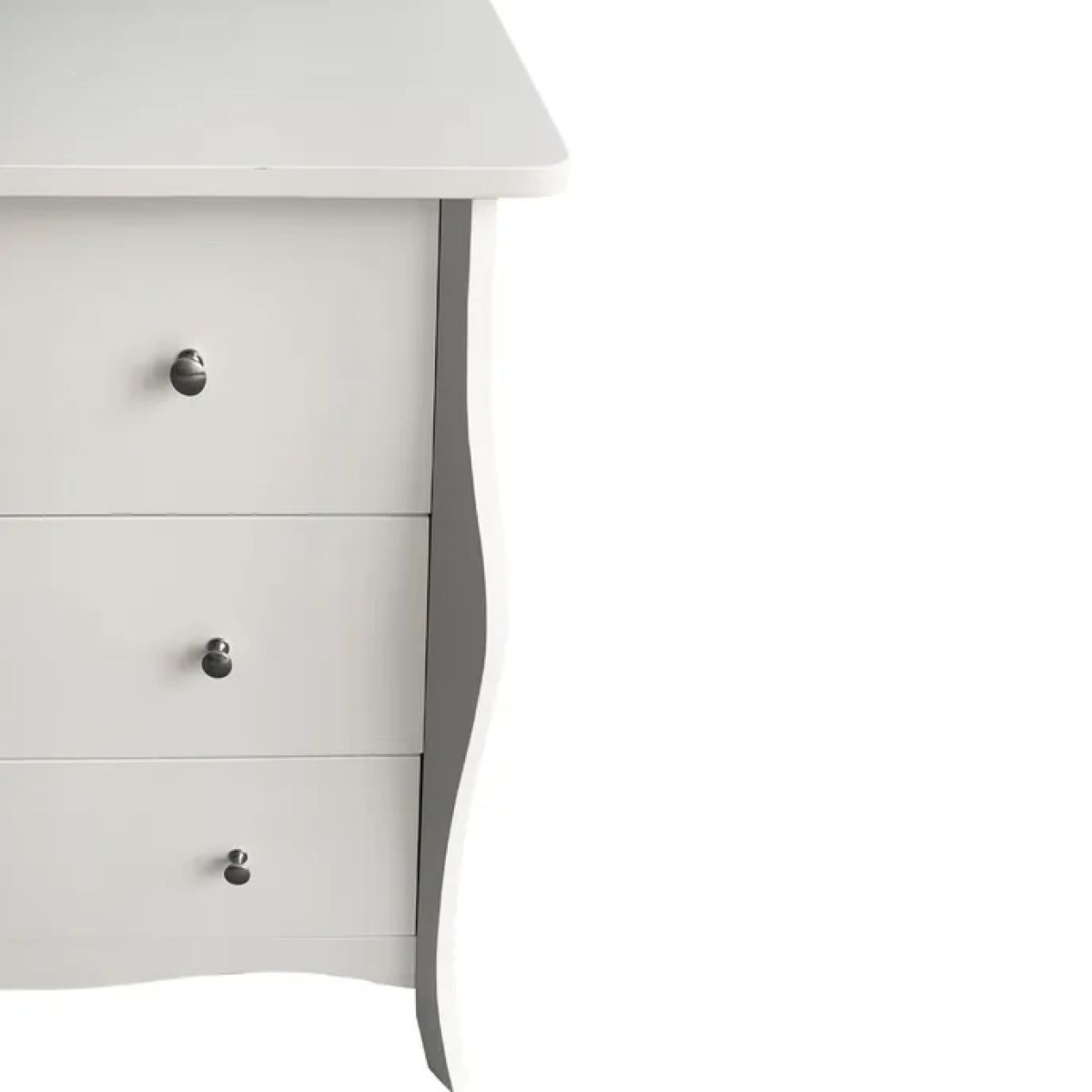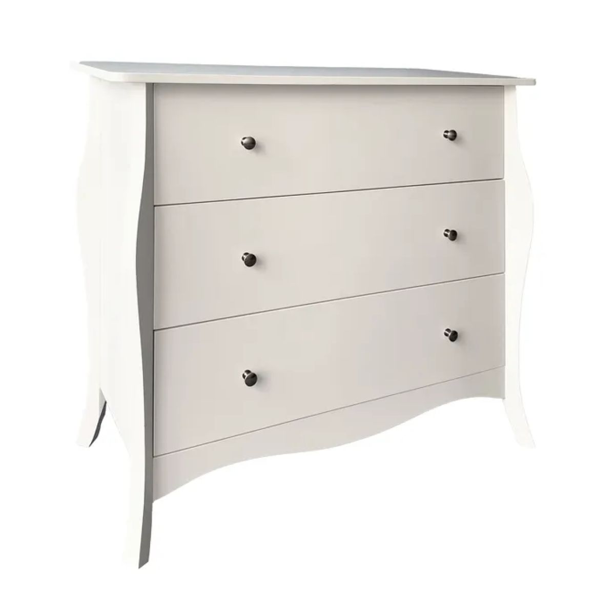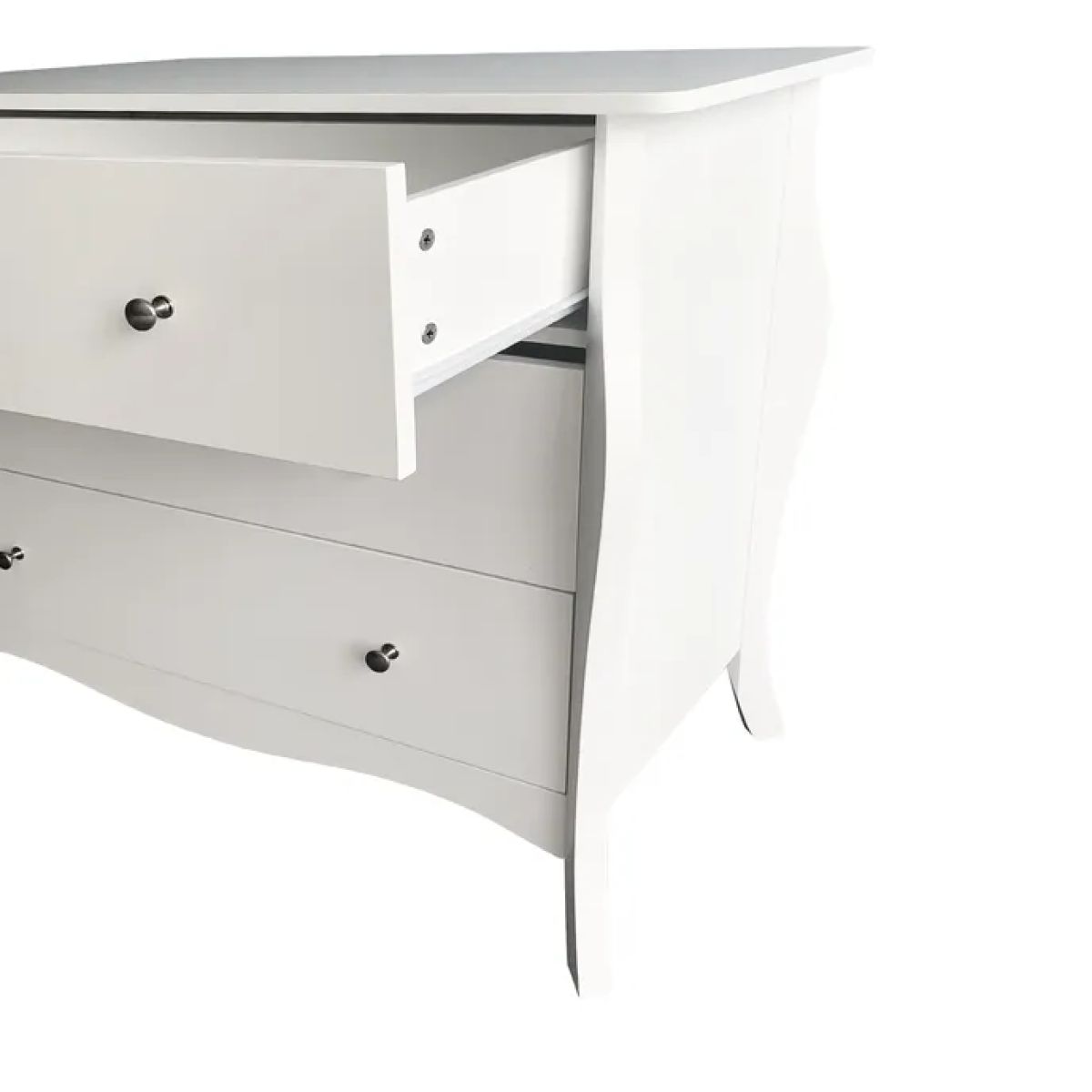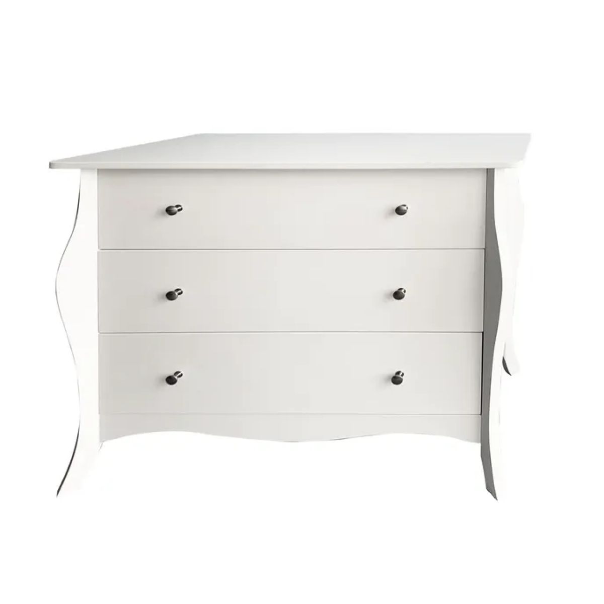 Material: MDF/metal Culoarea: albă Dimensiuni (LxAxÎ): 91,5x40x81,5 cm Capacitate de încărcare: 30 kg Capacitatea de încărcare a sertarelor: 10 kg Mânere metalice Trei sertare Stil baroc Grosimea materialului: 1,5 - 2,7 cm Înălţimea picioarelor: 13 cm Se recomandă fixarea la perete Se livrează în formă dezasamblată