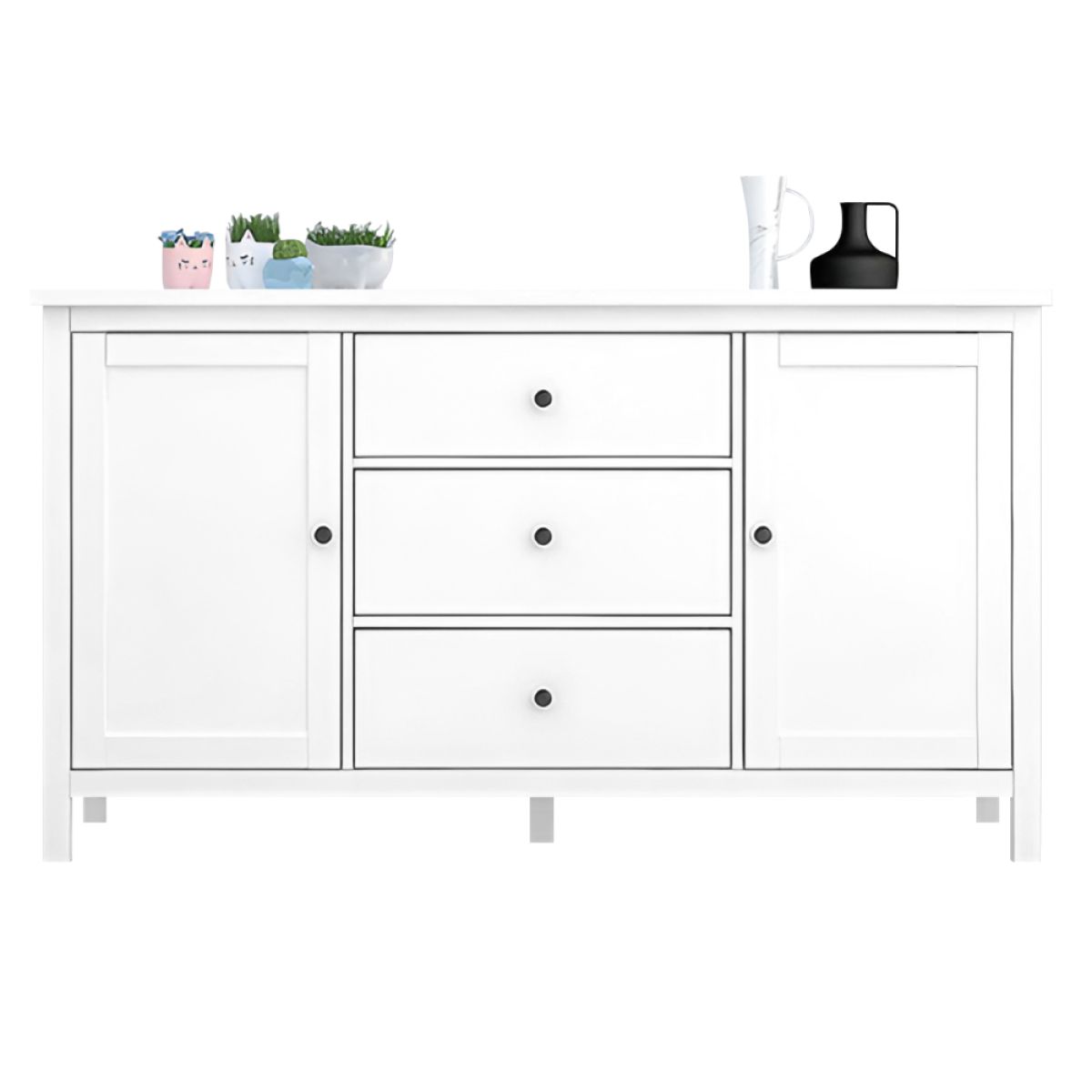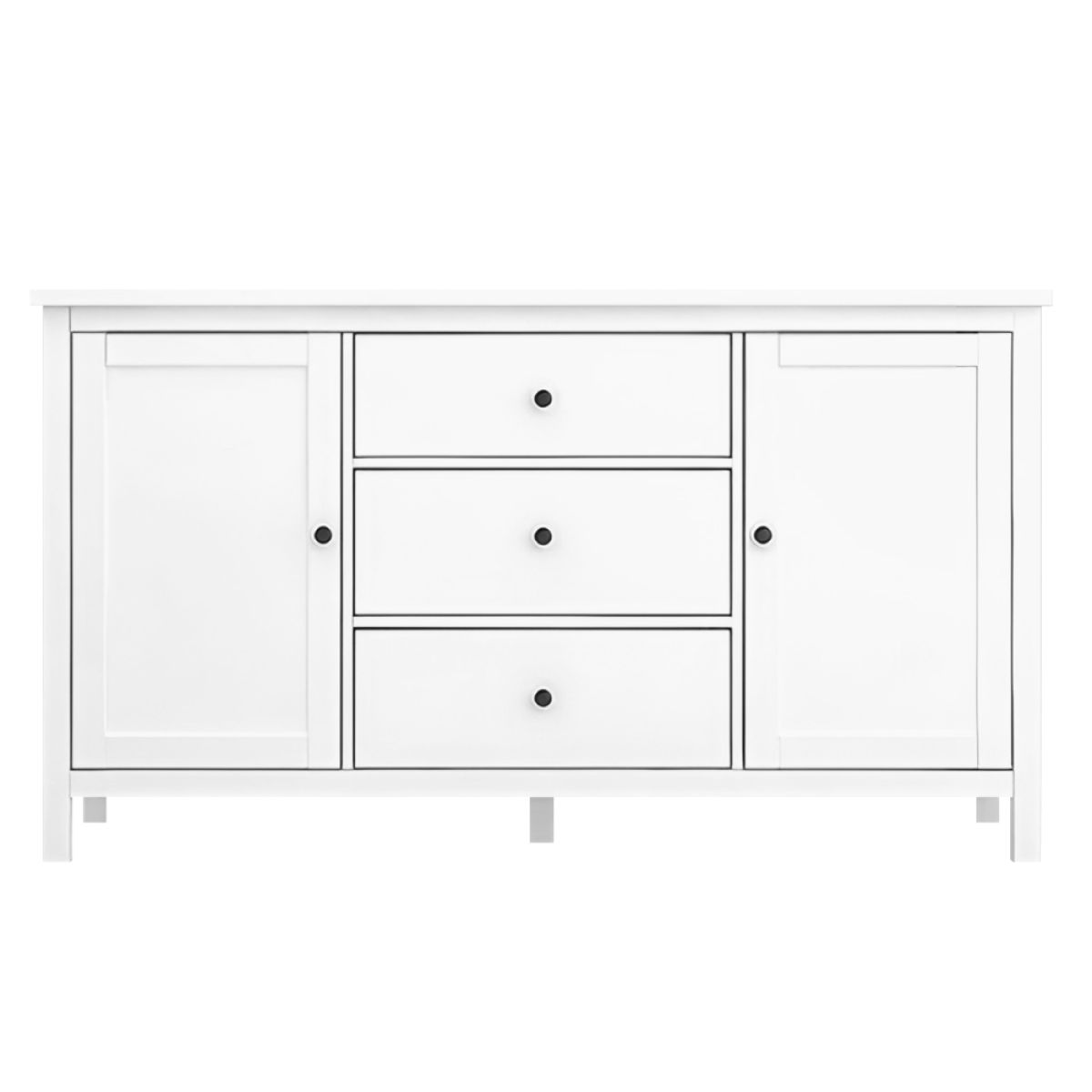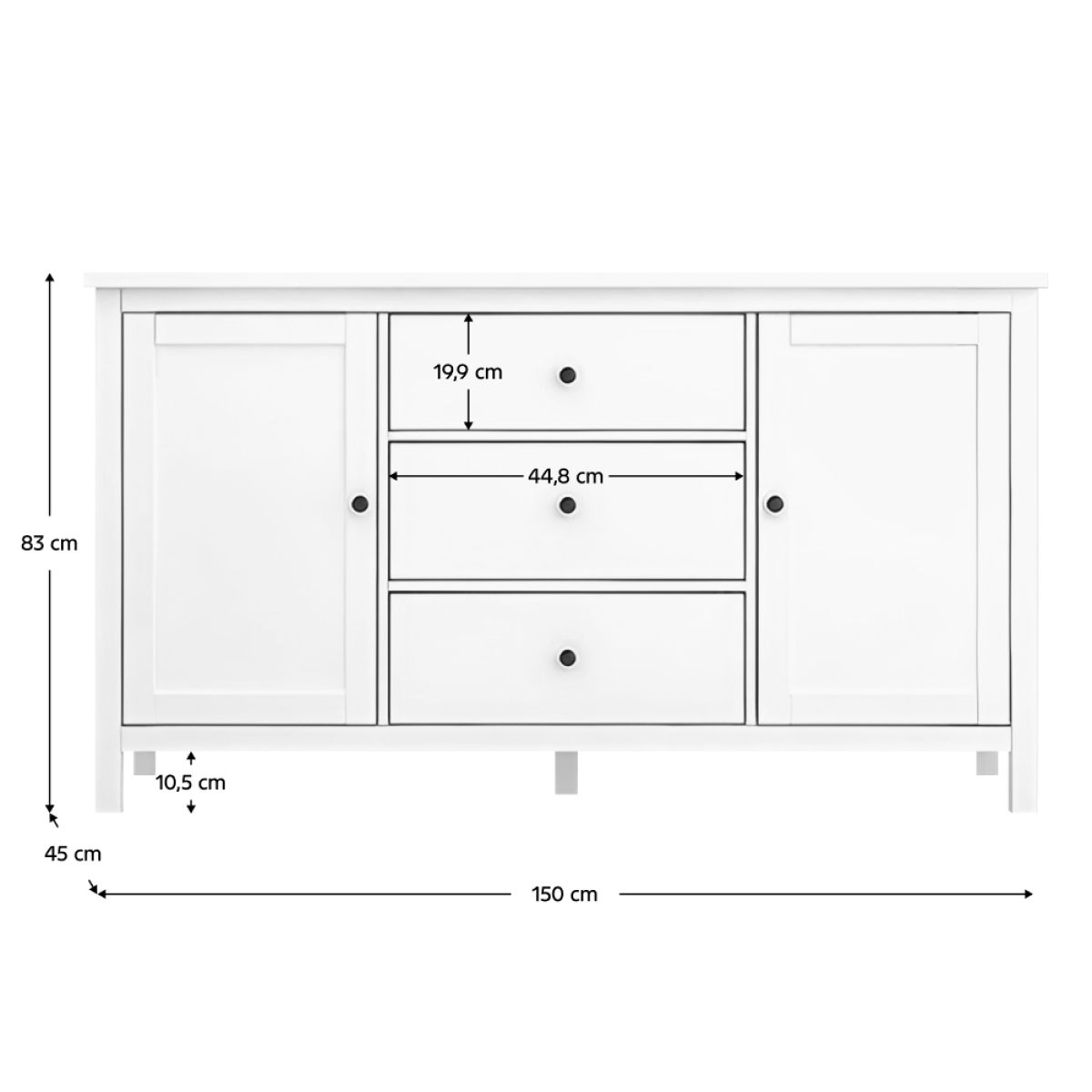 Material: MDF Culoare: albă Dimensiuni (lxAxh): 150x45x83 cm Grosimea materialului MDF: 1,5 cm Comodă Bufet Două uşi Două dulapuri Rafturi Lăţimea raftului: 45 cm Înălţimea dintre poliţe: 31,9 cm Trei sertare Dimensiuni sertar (lxh): 44,8x19,9 cm Pe picioare Picior central de sprijin Înălţimea spaţiului inferior de la podea: 10,5 cm Raft cu mânere Material mânere: metal Culoare mânere: negru Practic Portanţa plăcii de sus: 25 kg Portanţa poliţei: 15 kg Portanţa sertarului: 5 kg Vă recomandăm să ataşaţi mobilierul de perete Livrată dezasamblată