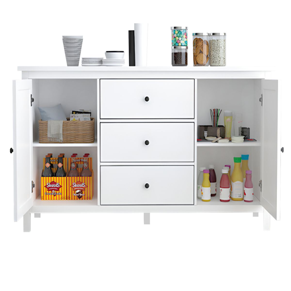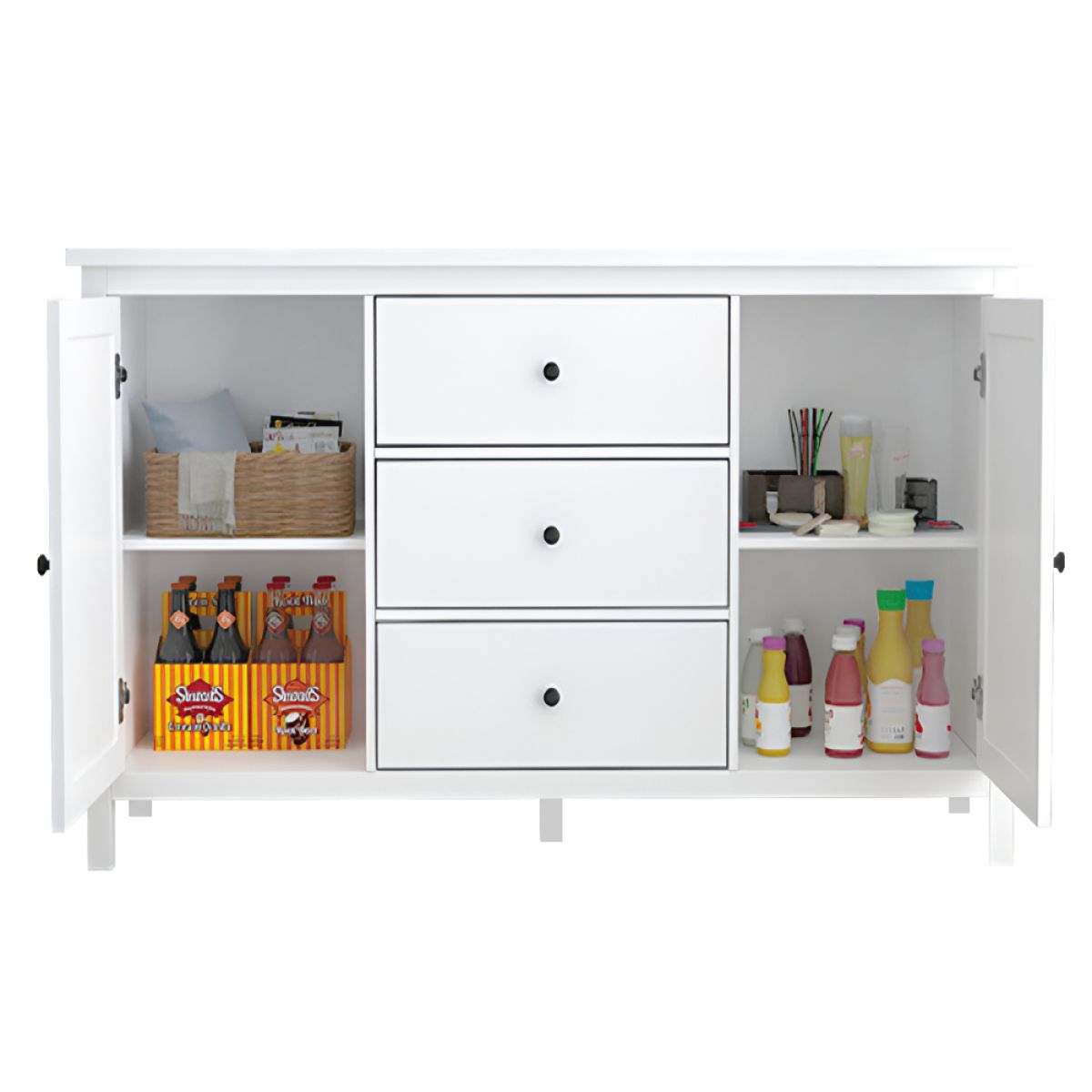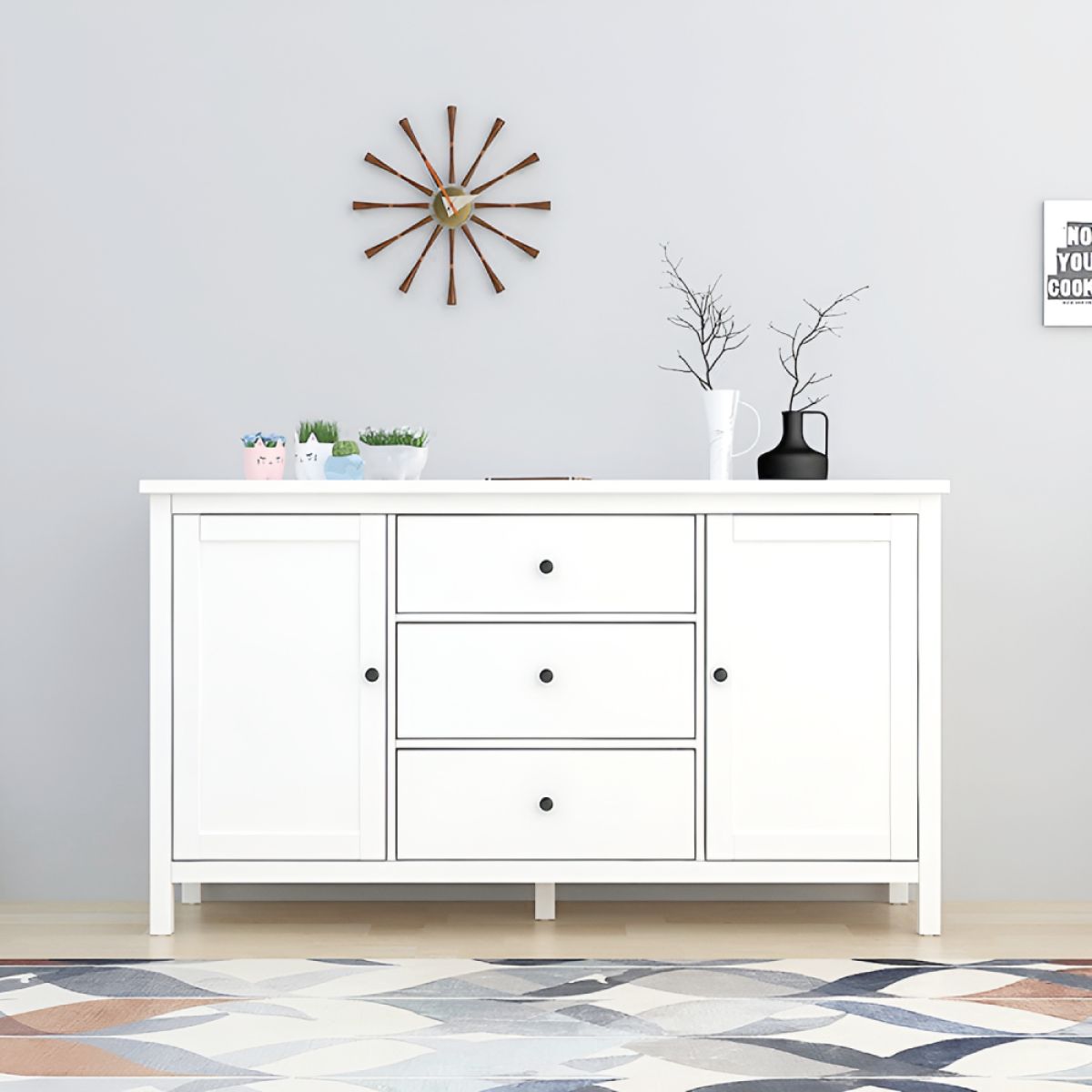 Material: MDF Culoare: albă Dimensiuni (lxAxh): 150x45x83 cm Grosimea materialului MDF: 1,5 cm Comodă Bufet Două uşi Două dulapuri Rafturi Lăţimea raftului: 45 cm Înălţimea dintre poliţe: 31,9 cm Trei sertare Dimensiuni sertar (lxh): 44,8x19,9 cm Pe picioare Picior central de sprijin Înălţimea spaţiului inferior de la podea: 10,5 cm Raft cu mânere Material mânere: metal Culoare mânere: negru Practic Portanţa plăcii de sus: 25 kg Portanţa poliţei: 15 kg Portanţa sertarului: 5 kg Vă recomandăm să ataşaţi mobilierul de perete Livrată dezasamblată