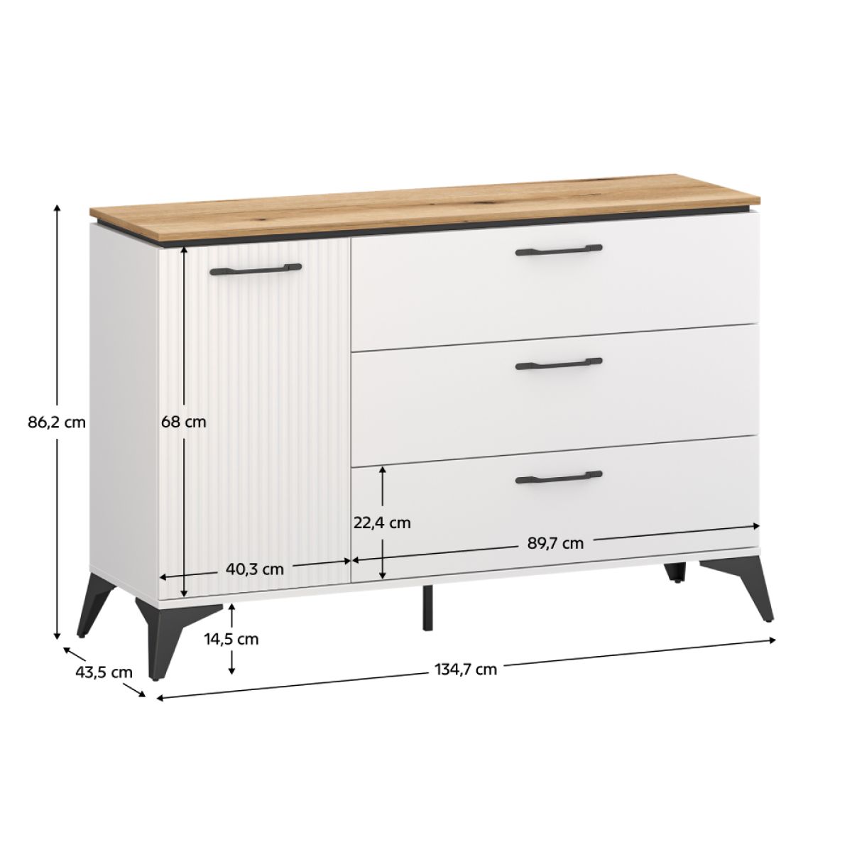 Material: DTD laminat/MDF înfoliat/PVC Culoare: alb/stejar evoke Dimensiuni (lxAxh): 134,7x43,5x86,2 cm Grosimea materialului: 1,6 cm Cu o uşă Poliţă Trei sertare Portanţă sertar: 5 kg Portanţa blatului superior: 30 kg Mânere metalice Culoare mânere: neagră Pe picioare Culoare picioare: negre Înălţime picioare: 14,5 cm Picior de sprijin central Uşă frezată decorativ Design modern Recomandăm fixarea de perete Livrată dezasamblată