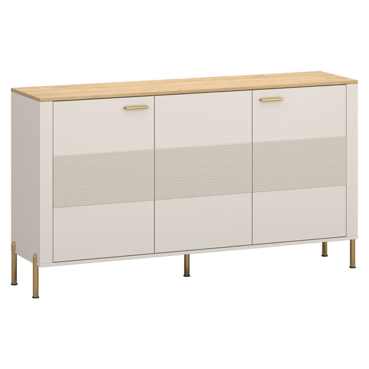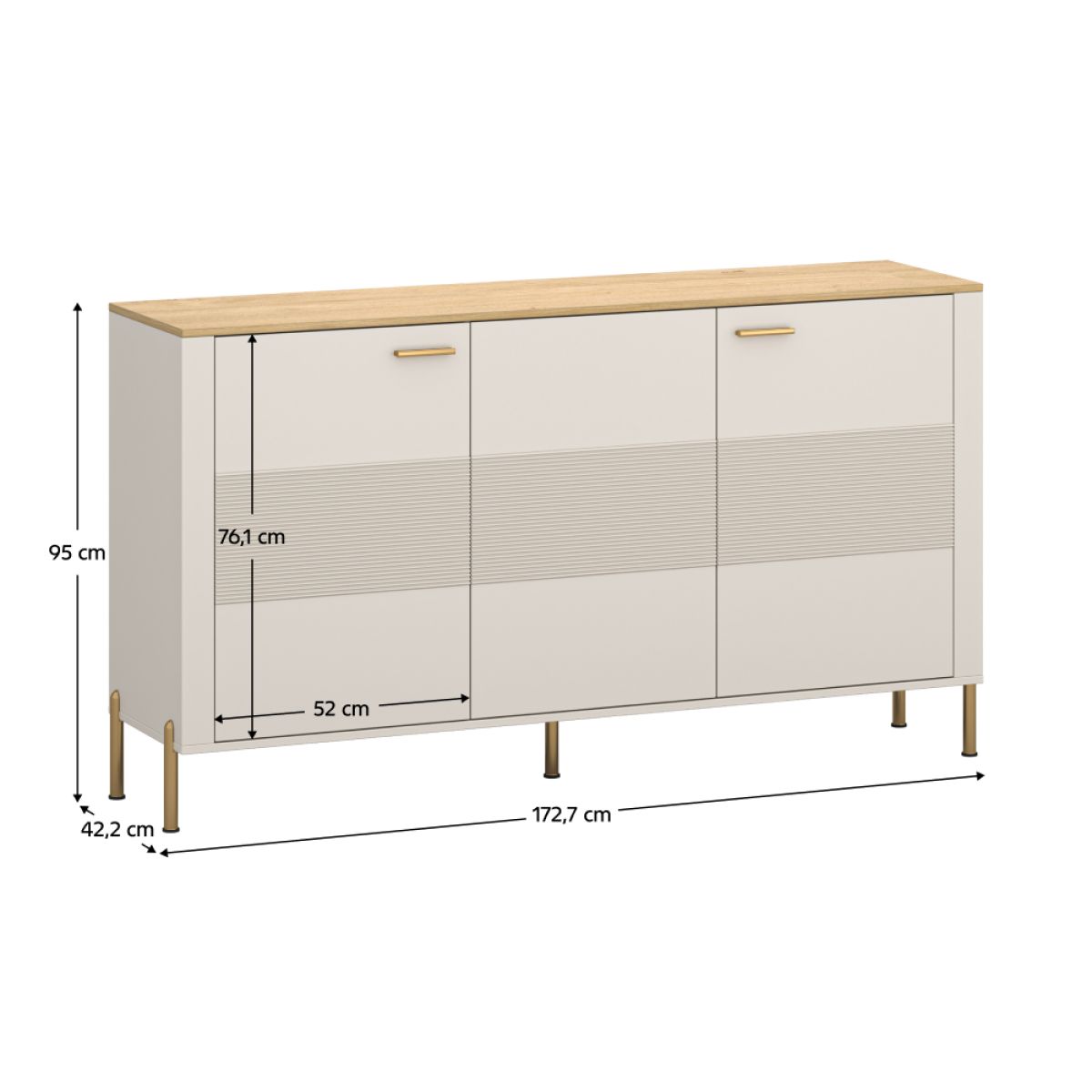 Material: DTD laminat/MDF înfoliat/PVC Culoare: caşmir/stejar de piatră Dimensiuni (lxAxh): 172,7x42,2x95 cm Grosimea materialului: 1,6 cm Cu trei uşi Dulăpior cu uşă Dimensiuni uşă (lxh): 52x76,1 cm Cu poliţă Portanţă poliţă: 3 kg Cu ??mâner Material mâner: metal Culoare mâner: auriu Pe picioare Material picior: metal Culoare picior: aurie Înălţime picior: 15 cm Uşă frezată decorativ Design modern Recomandăm fixarea de perete Livrat dezasamblat