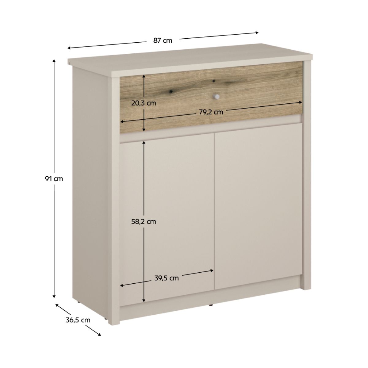 Material: DTD laminat Culoare: caşmir/stejar evoke Dimensiuni (lxAxh): 87x36,5x91 cm Grosimea materialului DTD: 1,6-3,2 cm, Cu două uşi, Sertar, Cu mâner, Material mâner: plastic, Culoare mâner: caşmir, Portanţă sertar: 3 kg Cu poliţe Portanţa poliţei: 5 kg Fără mâner Crestătură oblică Culoarea plăcii dure: alb Glisoare Înălţimea glisoarelor: 0,3 cm Design modern Vă recomandăm să ataşaţi mobilierul de perete Livrat dezasamblat