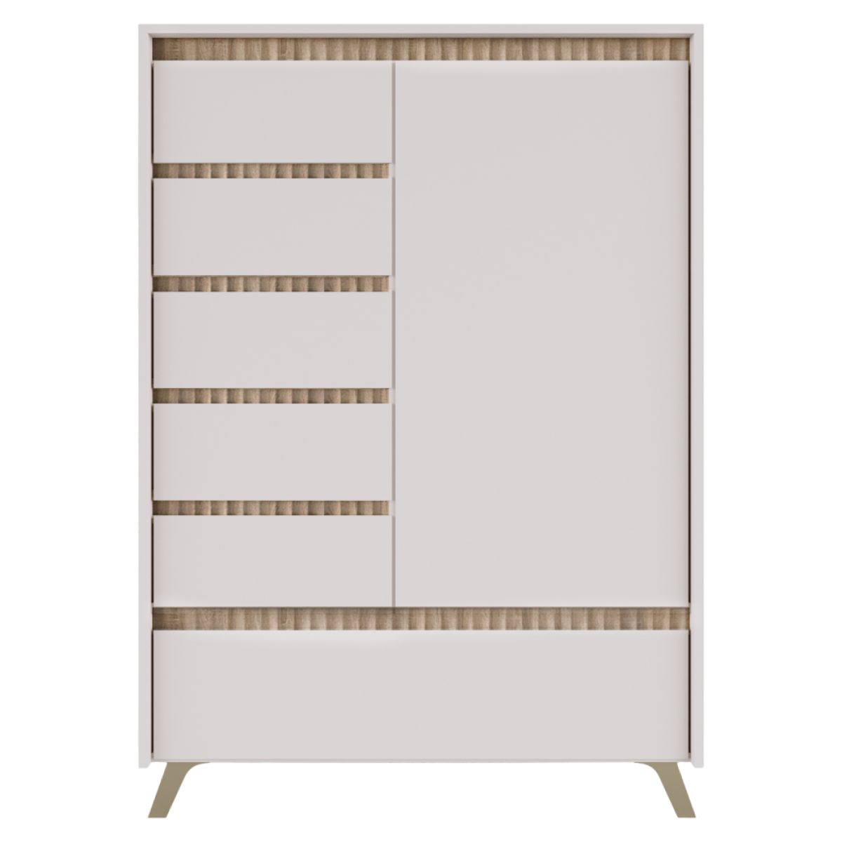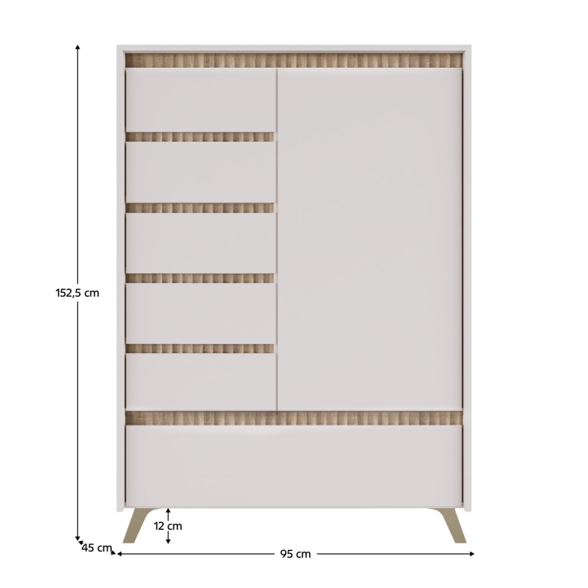 Material: DTD laminat /MDF înfoliat/folie PVC Culoare: caşmir/stejar sonoma Dimensiuni (lxAxh): 95x45x152,5 cm Grosimea materialului: 1,6-1,9 cm Cu o uşă Dulap basculant Cinci sertare Poliţe Pe picioare Culoarea piciorului: naturală Înălţimea piciorului: 12 cm Rulmenţi cu bile extensibile complet Balamale Margine: hârtie impregnată cu polimeri termoreactivi/PVC Grosimea materialului ABS: 0,5 mm Grosime placă aglomerată partea din spate/fund sertar: 0,3 cm Culoare placă aglomerată partea din spate/fund sertar: alb Frezare decorativă Fără mânere Design modern Livrat dezasamblat