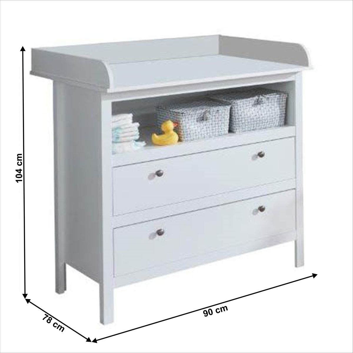 Material: DTD laminat/margini ABS/MDF Culoarea: albă Dimensiuni (LxÎxA): 90x78x104 cm Înălţimea picioarelor 16 cm Grosimea materialului: 1,6 cm Masă de înfăşat Capacitatea de încărcare a mesei de înfăşat: 15 kg Două sertare Capacitatea de încărcare a sertarelor: 3 kg Spaţiu de depozitare deschis Masa de înfăşat poate fi îndepărtată Comoda cu sertare poate fi folosită şi fără masa de înfăşat. Masa este livrată fără salteaua de înfăşat Vă recomandăm să o prindeţi la perete Livrat în formă dezasamblată