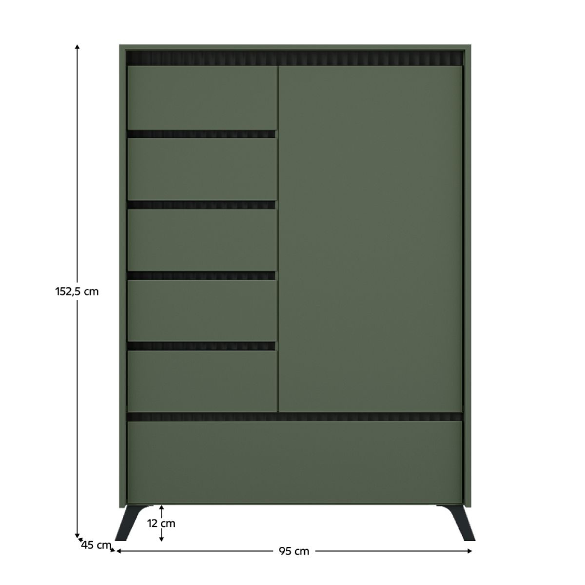 Material: DTD laminat/MDF înfoliat/folia PVC Culoare: verde smoke/negru Dimensiuni (lxAxh): 95x45x152,5 cm Grosimea materialului: 1,6-1,9 cm Cu o uşă Dulap basculant Cinci sertare Poliţe Pe picioare Culoare picior: negru Înălţimea piciorului: 12 cm Rulmenţi cu bile extensibile complet Balamale Margine: hârtie impregnată cu polimeri termoreactivi/PVC Grosimea materialului ABS: 0,5 mm Grosime placă aglomerată partea din spate/fund sertar: 0,3 cm Culoare partea din spate/fund sertar: stejar închis milano Frezare decorativă Fără mânere Design modern Livrat dezasamblat