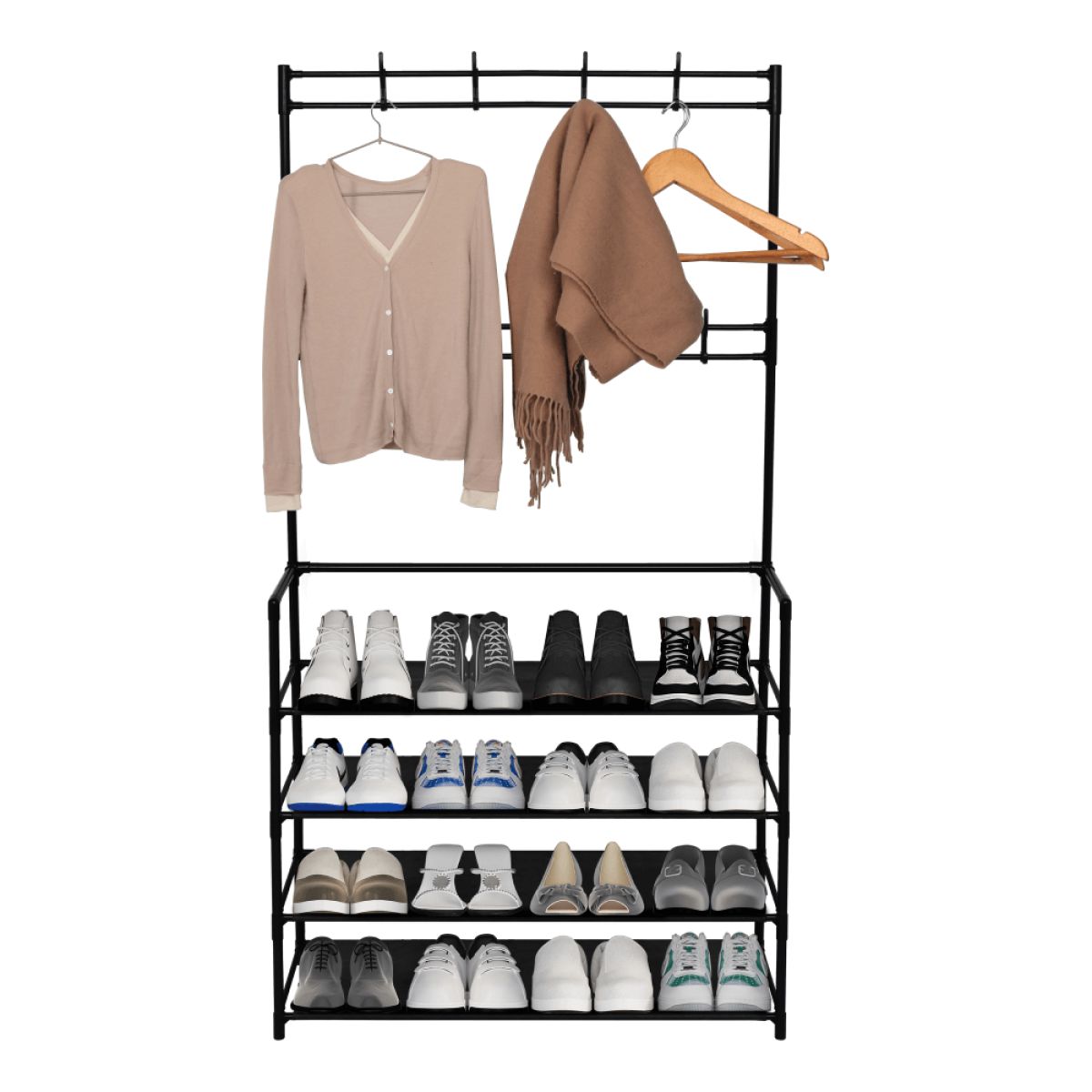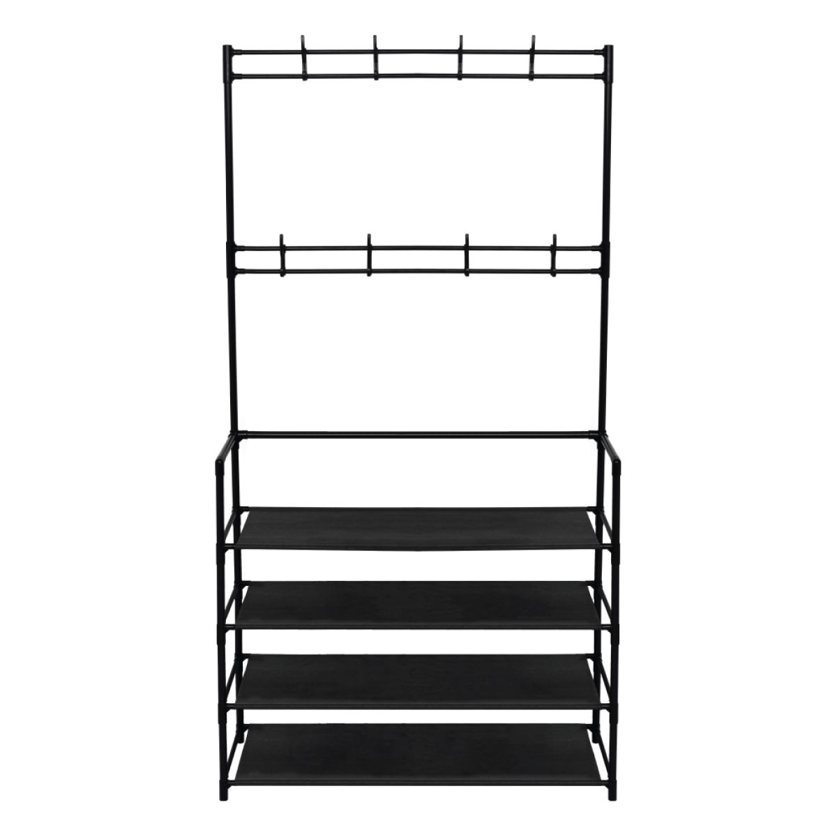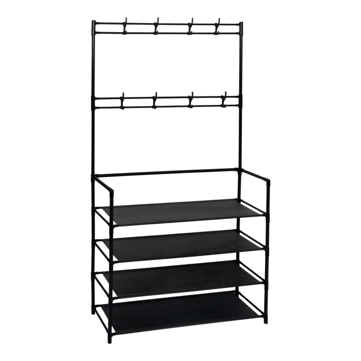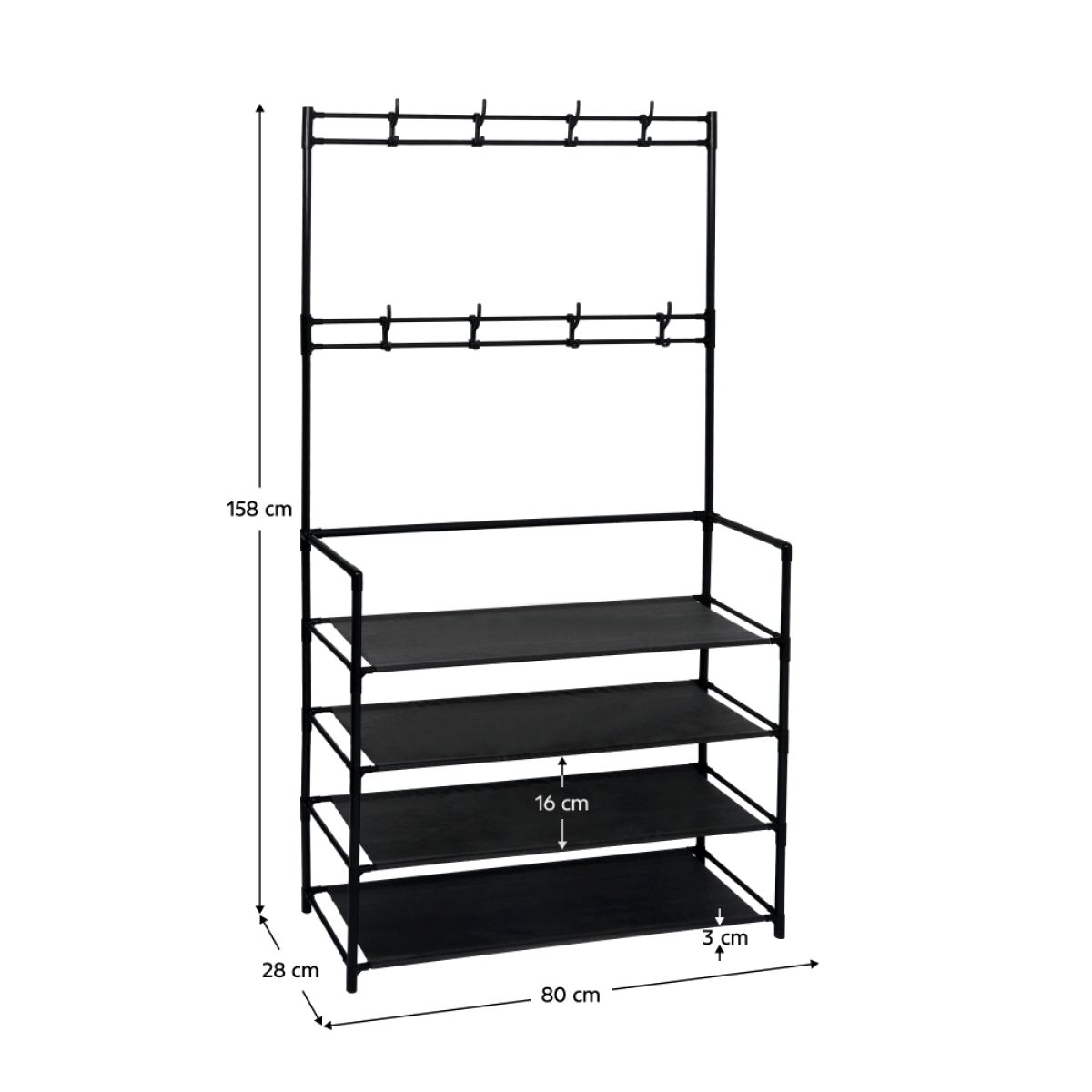 Material: metal / plastic Culoare: neagră Dimensiuni (LxAxÎ): 80x28x158 cm Opt cârlige Capacitatea cârligului: 2 kg Patru rafturi Înălţime între rafturi: 16 cm Înălţime de la sol până la bază: 3 cm Capacitate de încărcare pe fiecare raft: 4 kg Design universal Simplu Practic Livrat dezasamblat